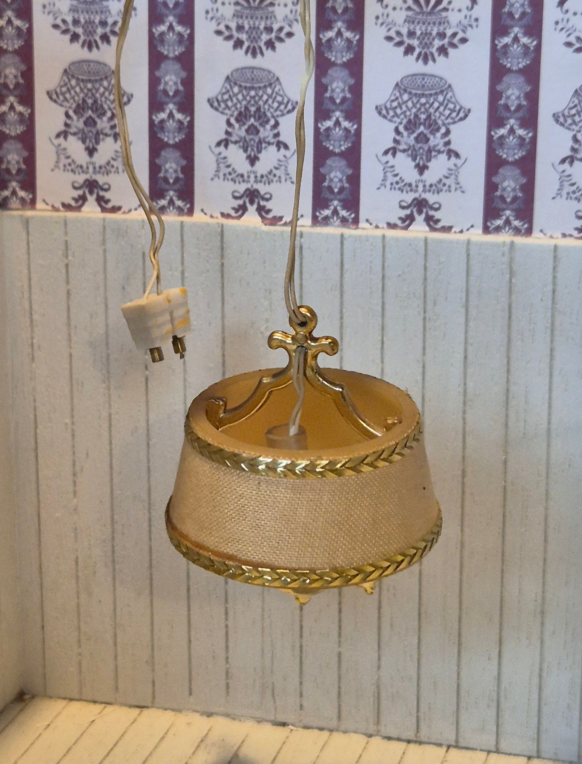 Den er original, pæn med lyspære og retro tynd ledning med han-stik. Den er primært af plast med beige bånd. Den er i god stand og virker fint.