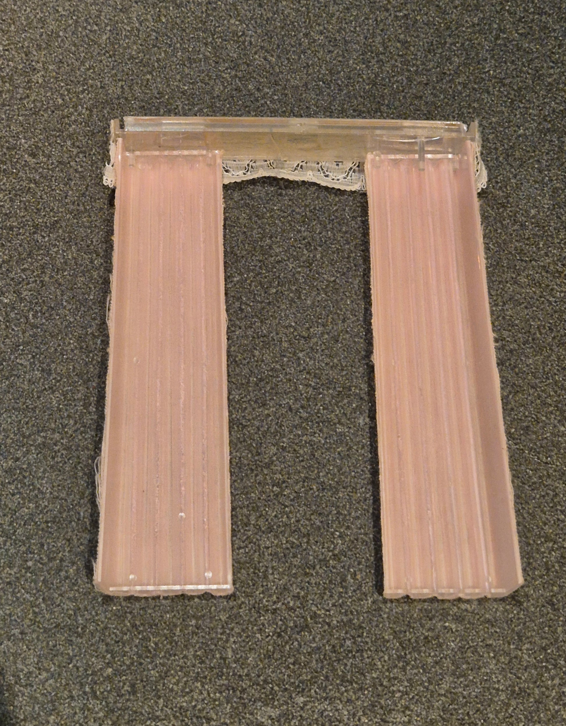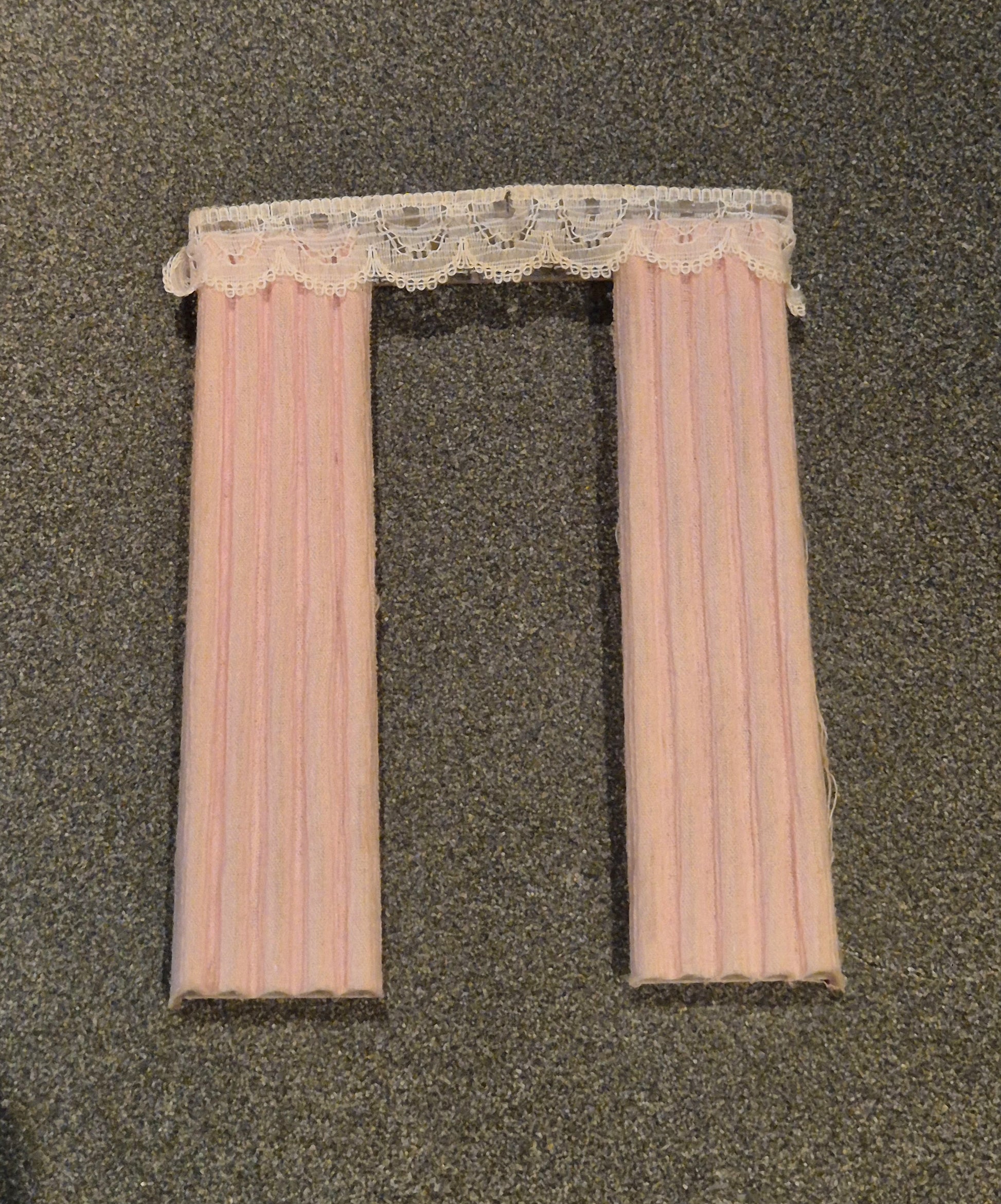 Lundby lyserødt gardin med blonder. Den ene tap er knækket, men den anden er intakt.