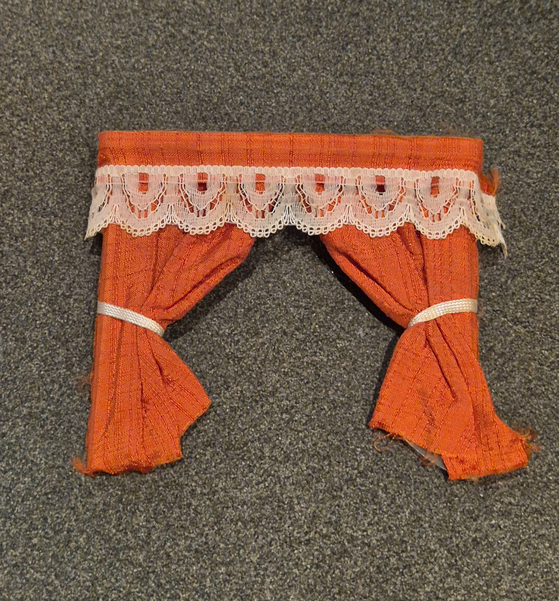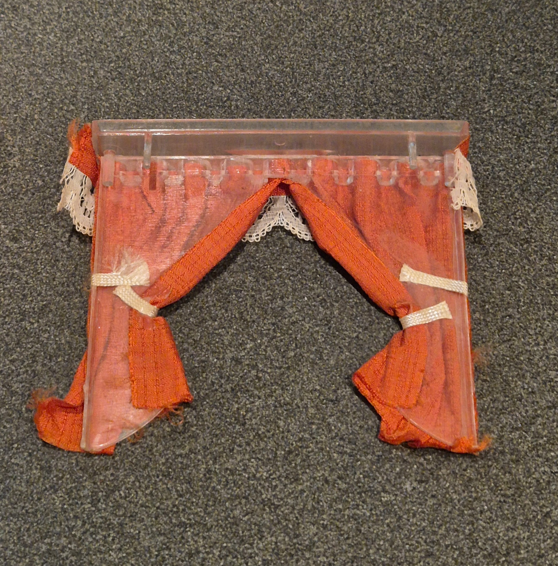 Lundby orange gardin med hvide blonder, og begge tapper bagpå er intakte.