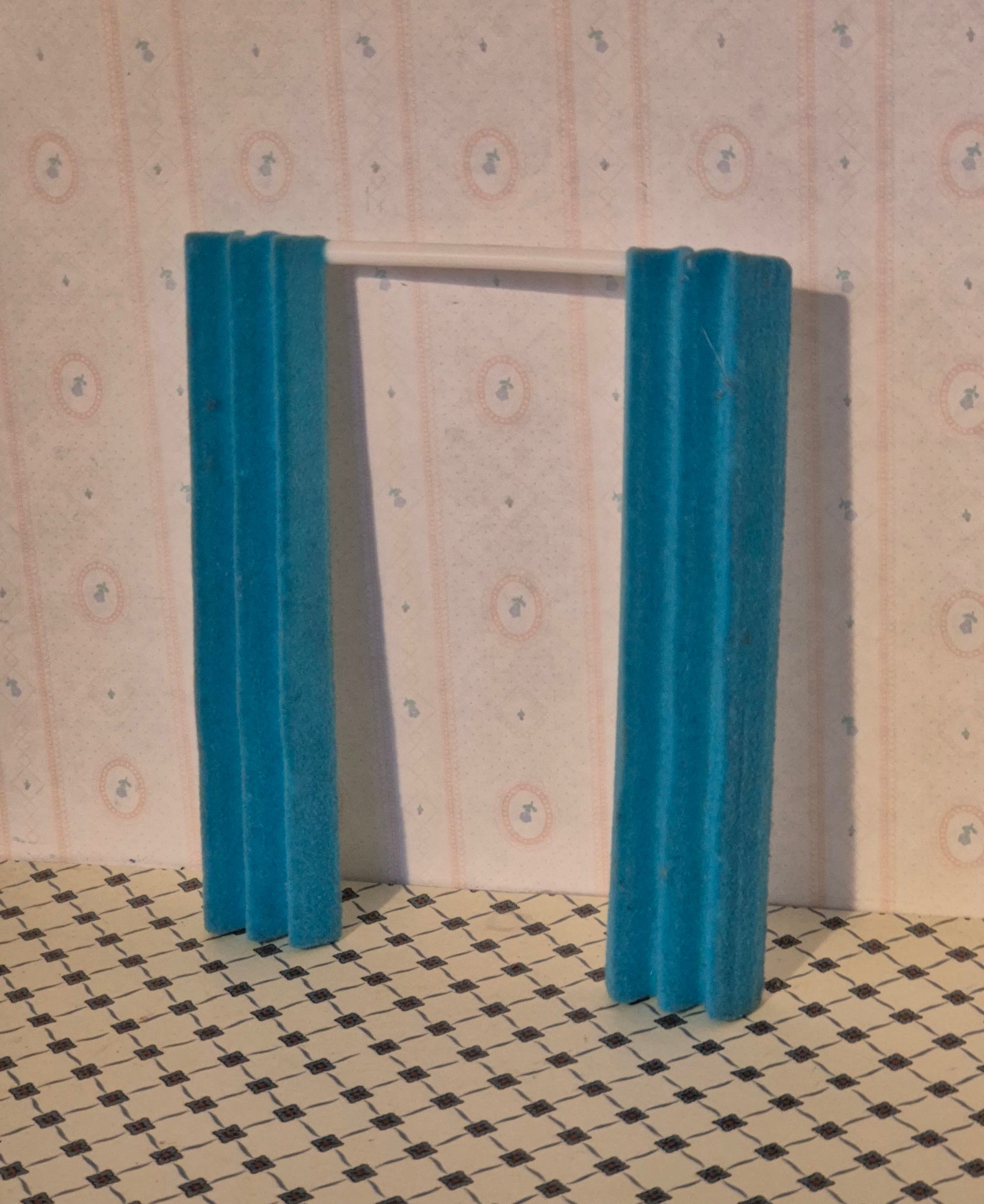 Blåt Lundby gardin i Smaaland serien. Udmærket stand og intakt med patina og brugsspor.