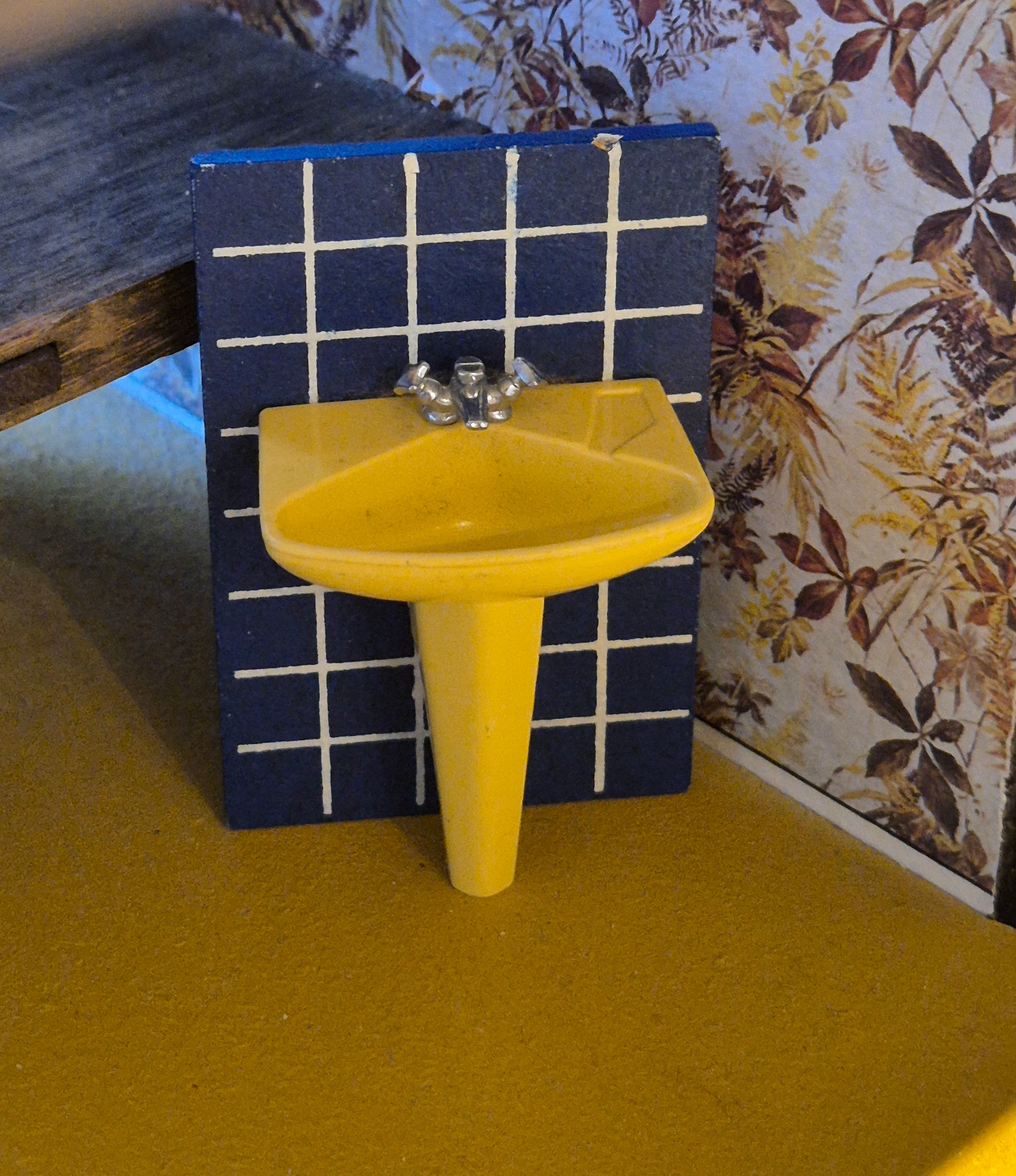 Bagvæggen er af træ der er malet blå med hvide flisefuger og håndvasken er gul plast.