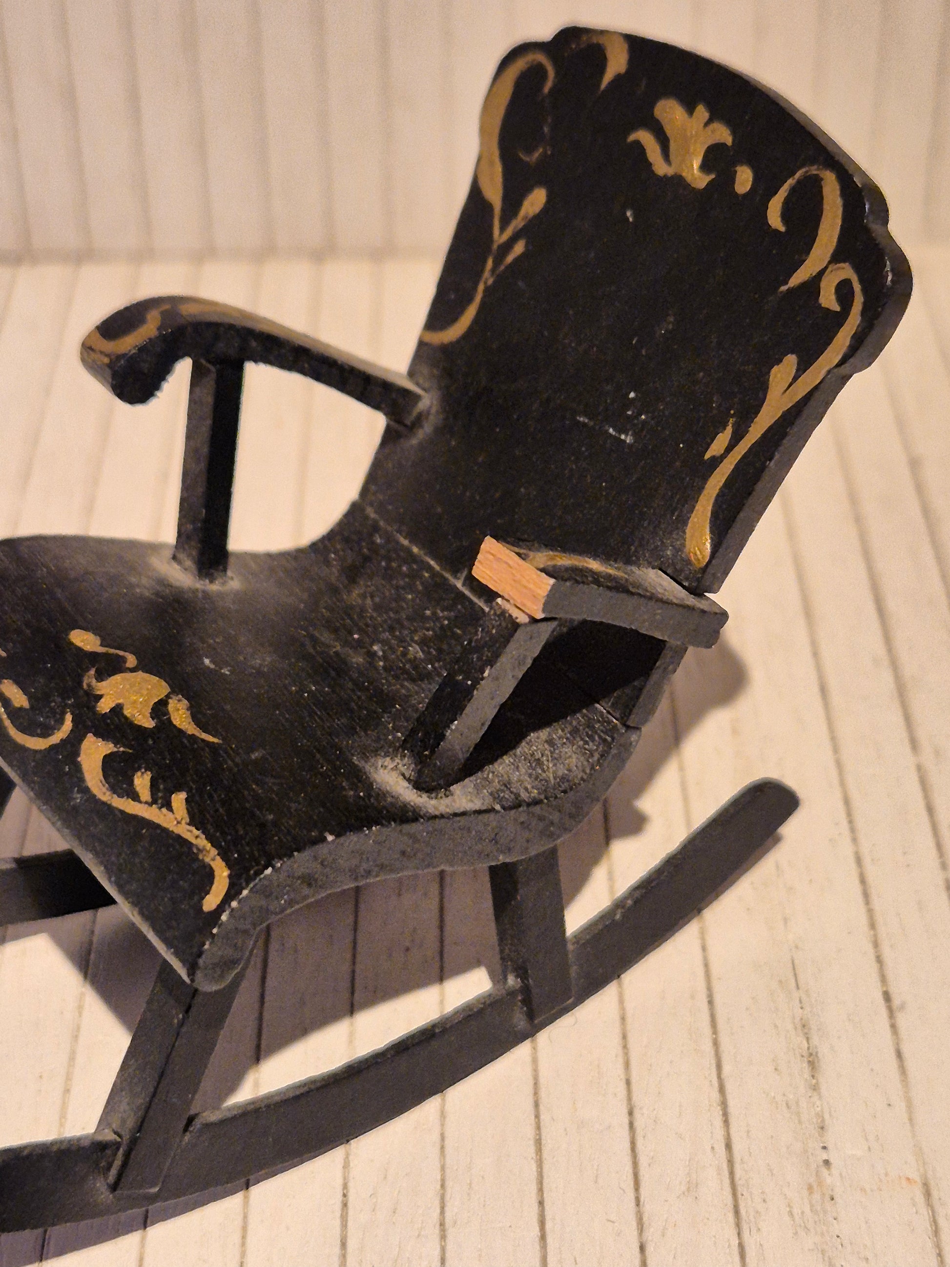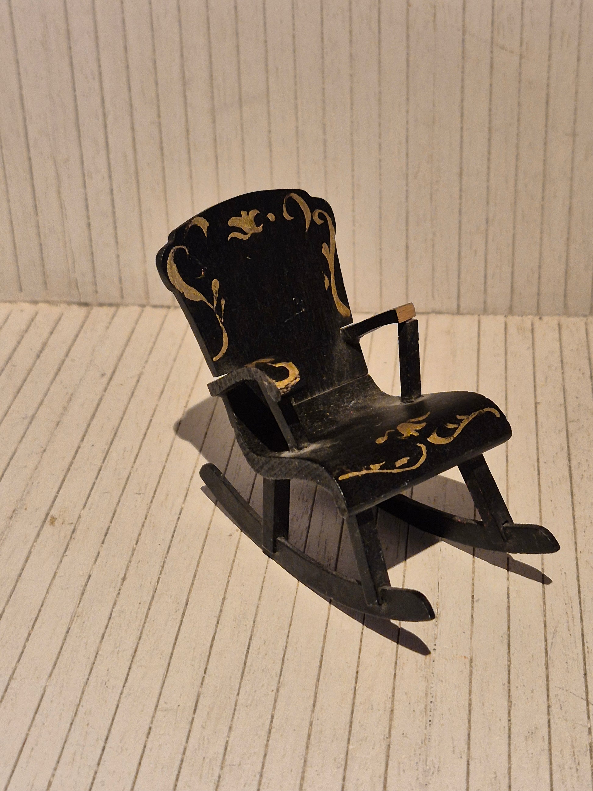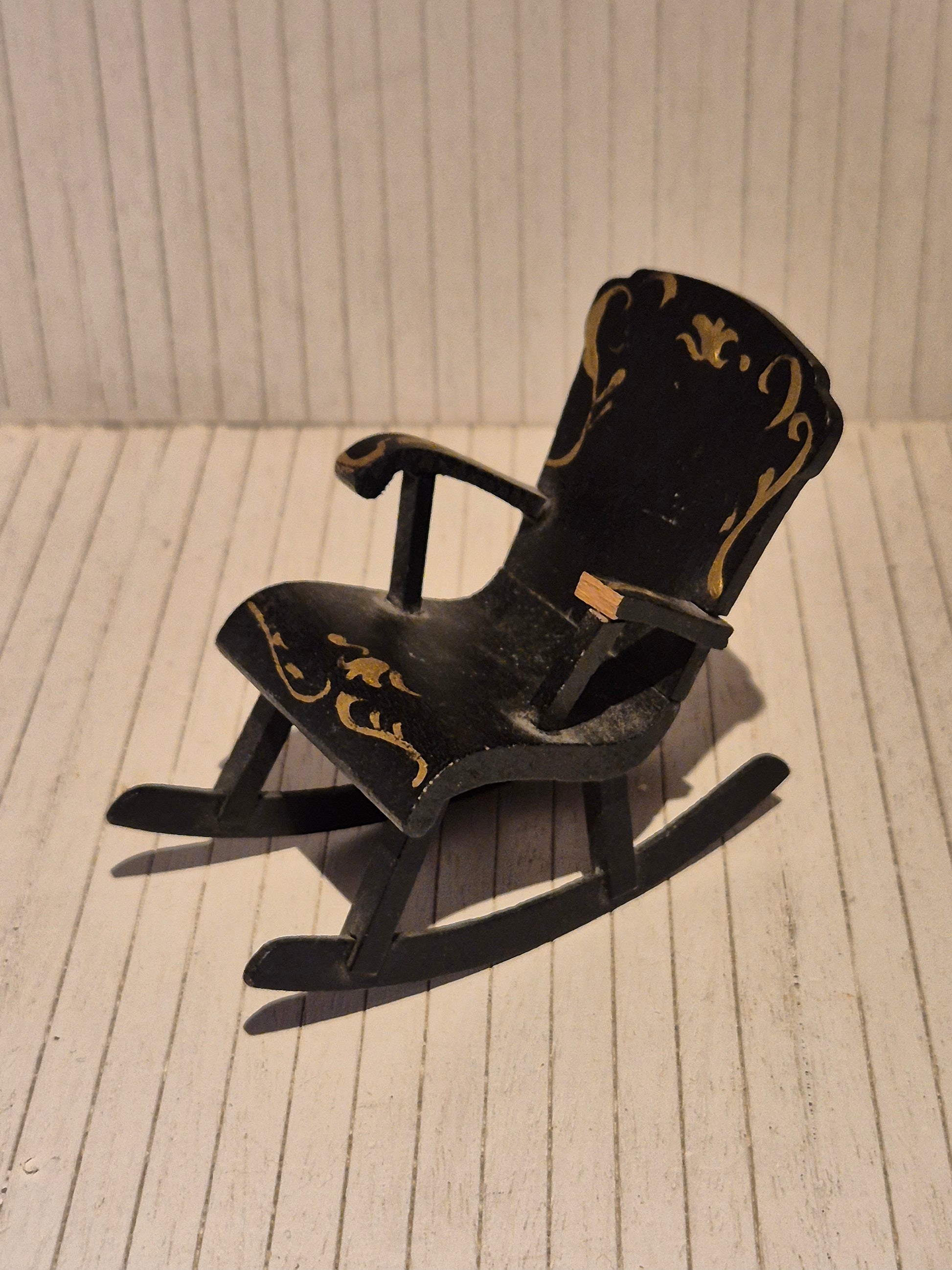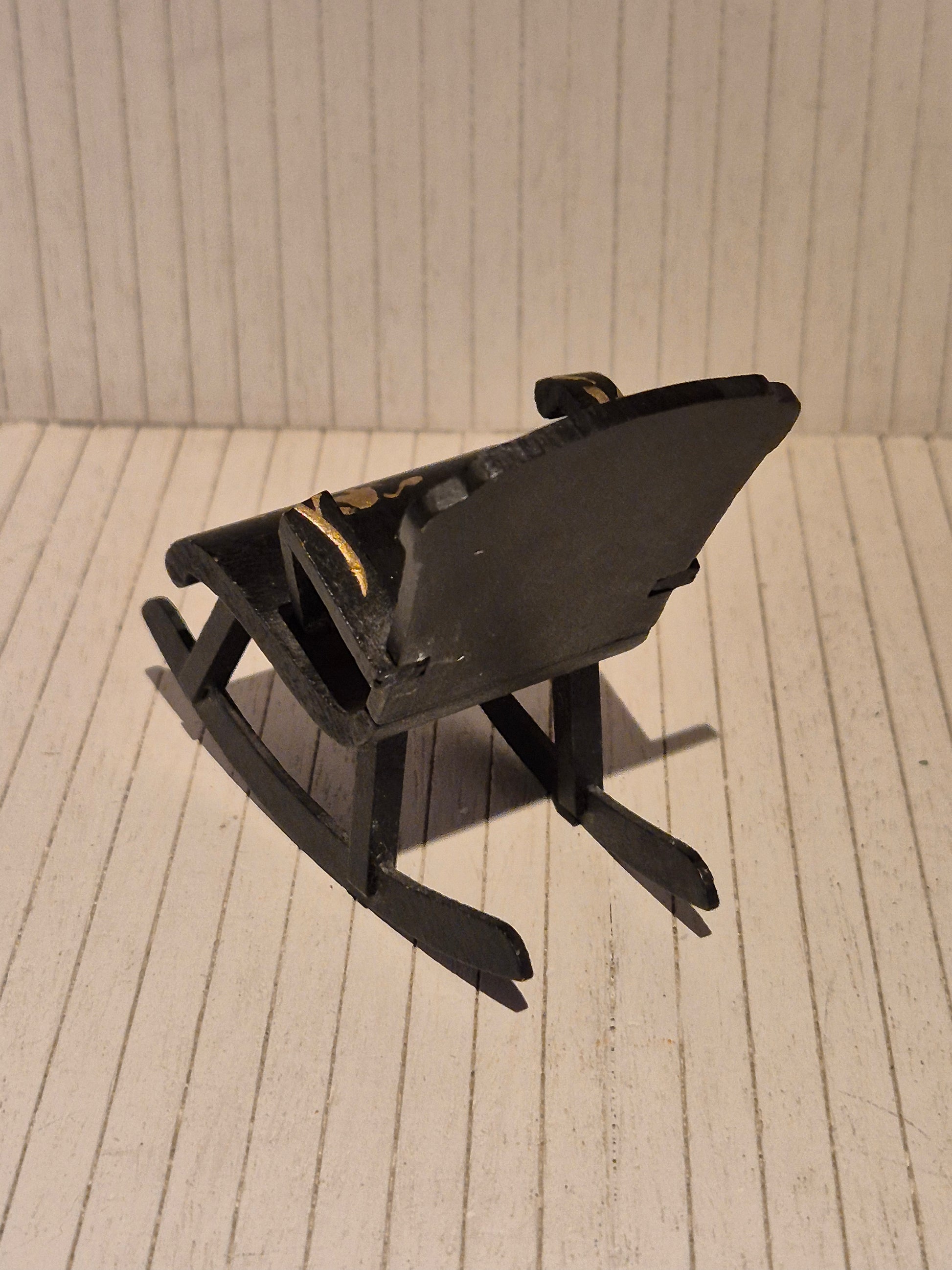 Lundby gyngestol af træ I sort med gyldne markeringer og detaljer i rokoko stil fra 1960erne.