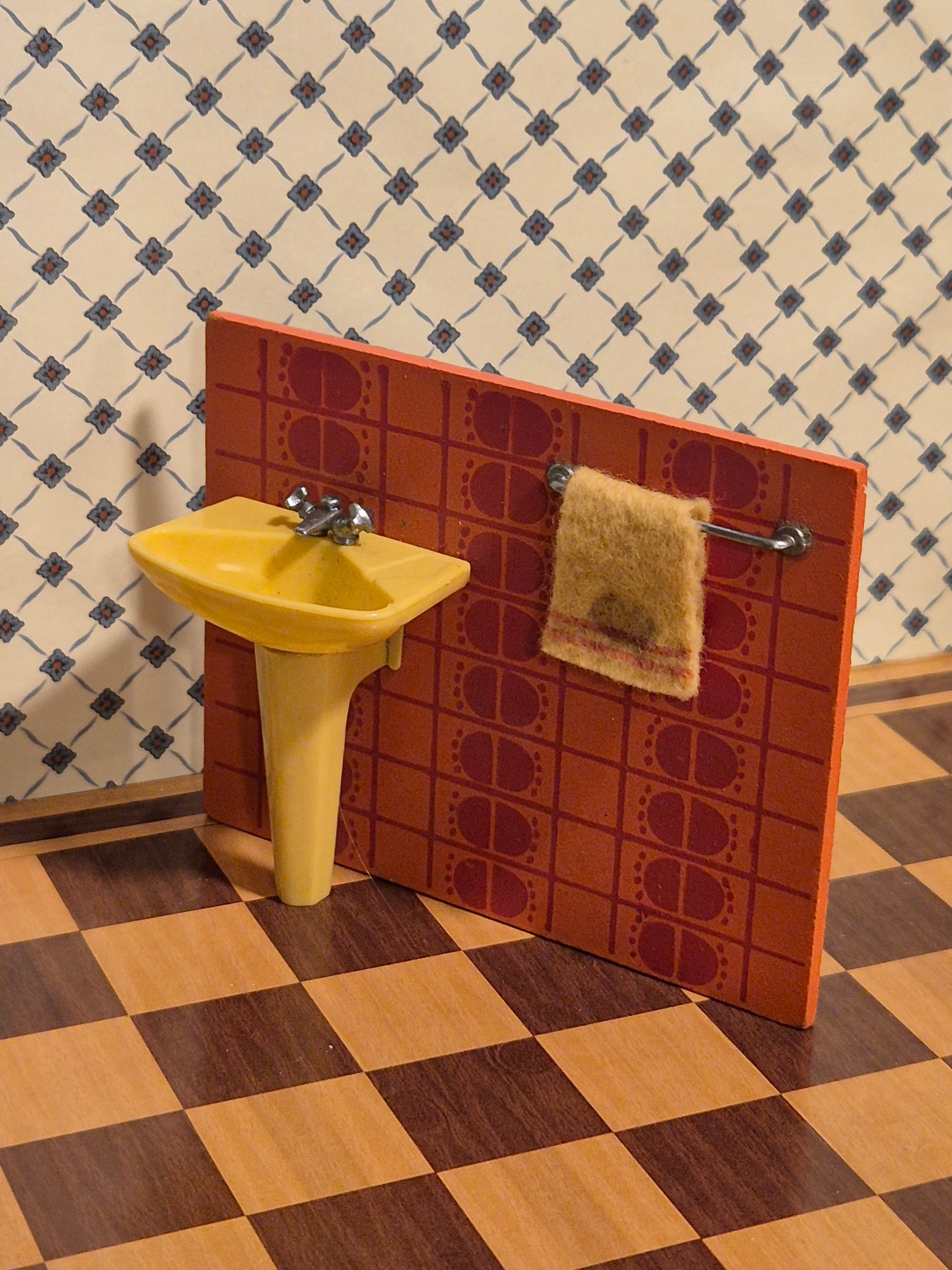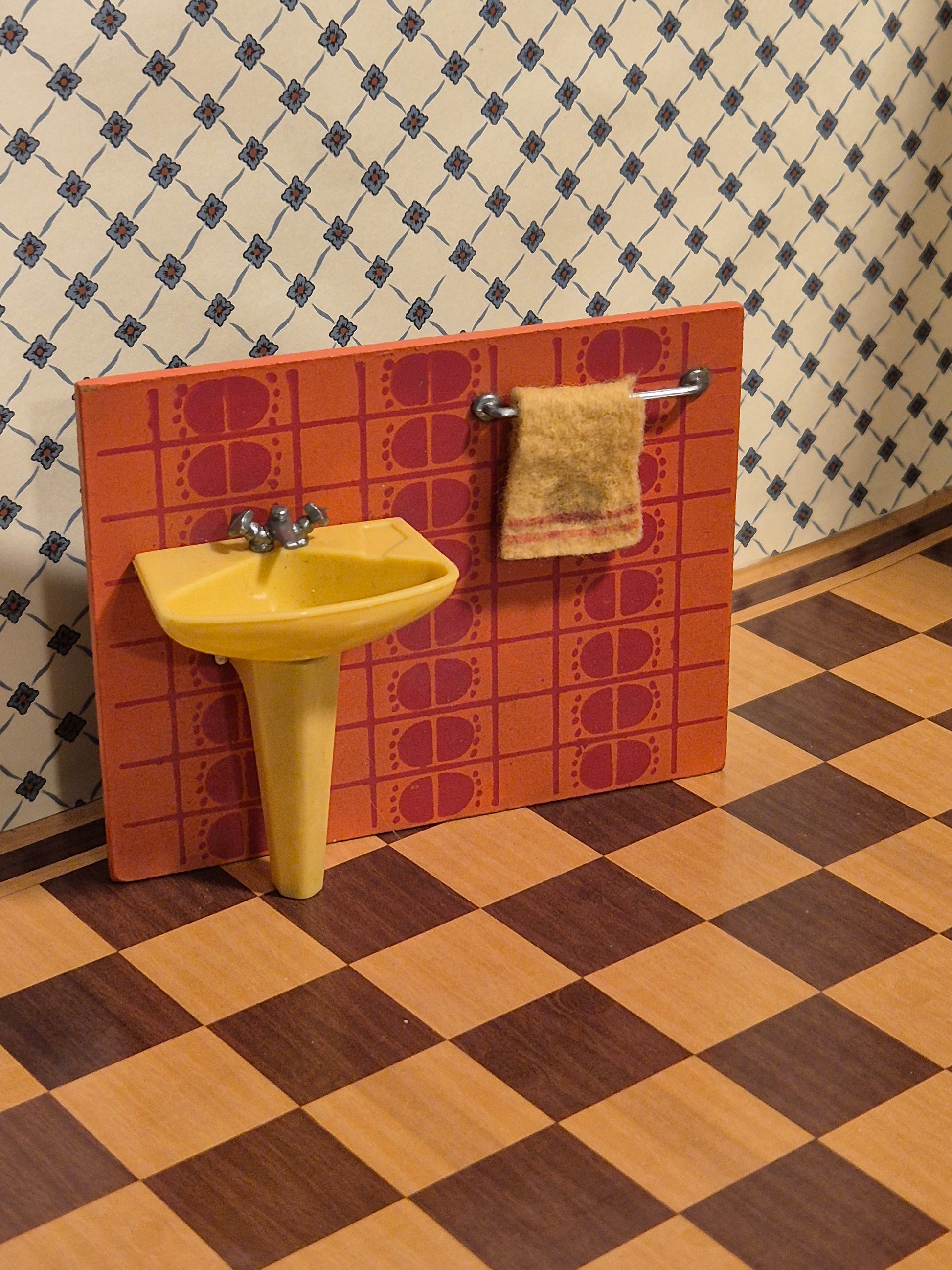Lundby håndvask i retro gult originalt håndklædegul og mørk orange med mønster på bagvæg, og gult originalt håndklæde