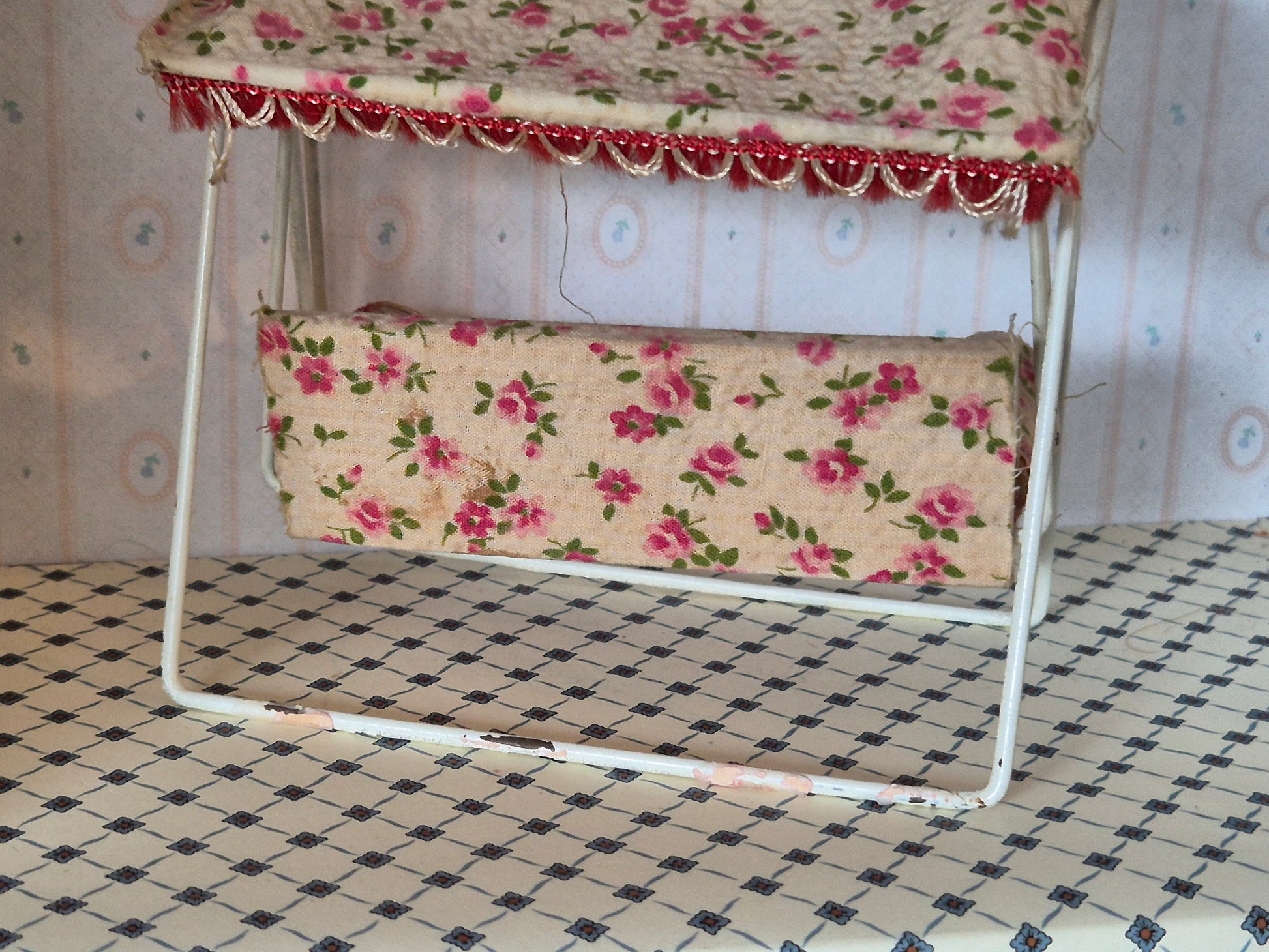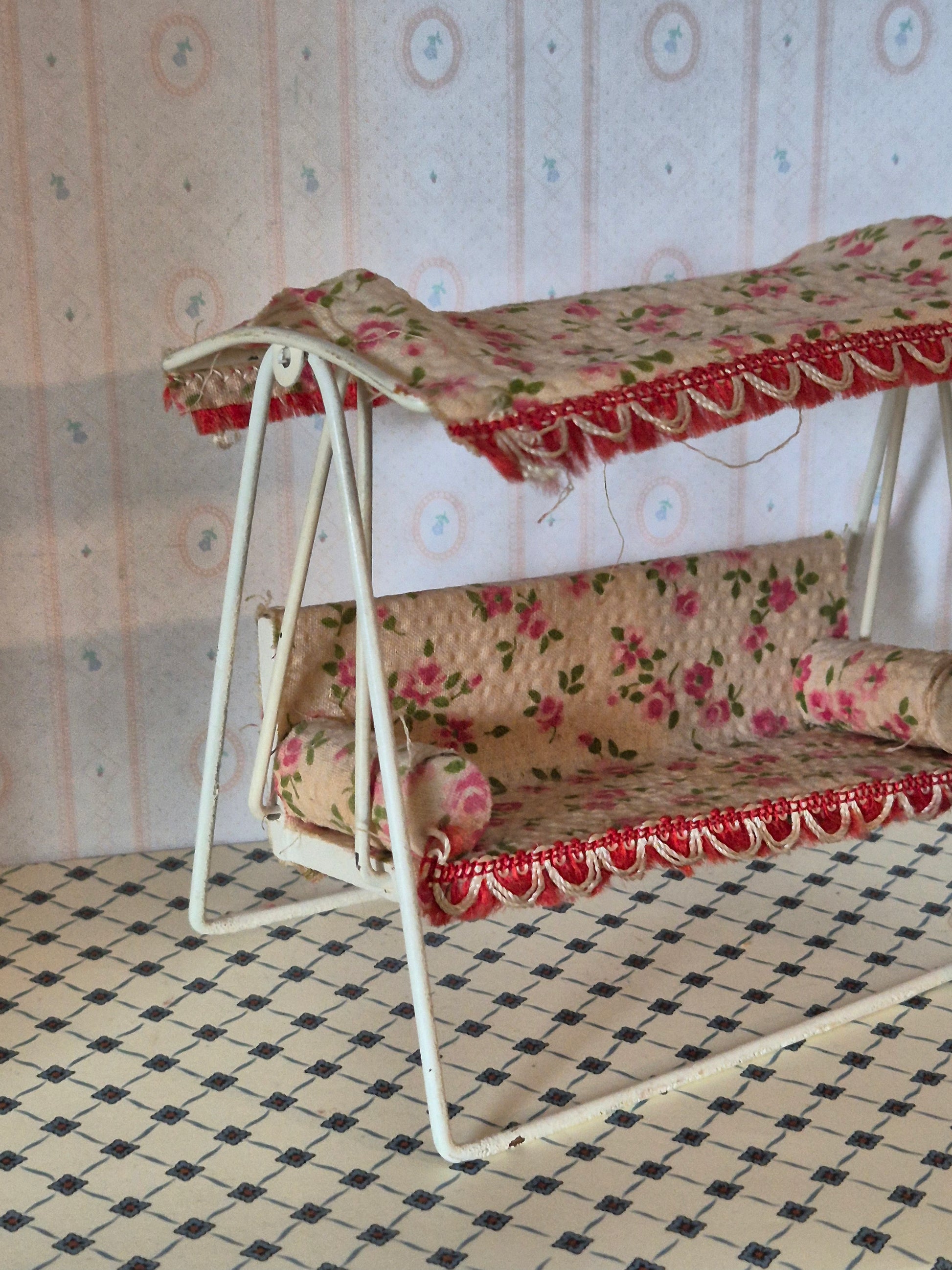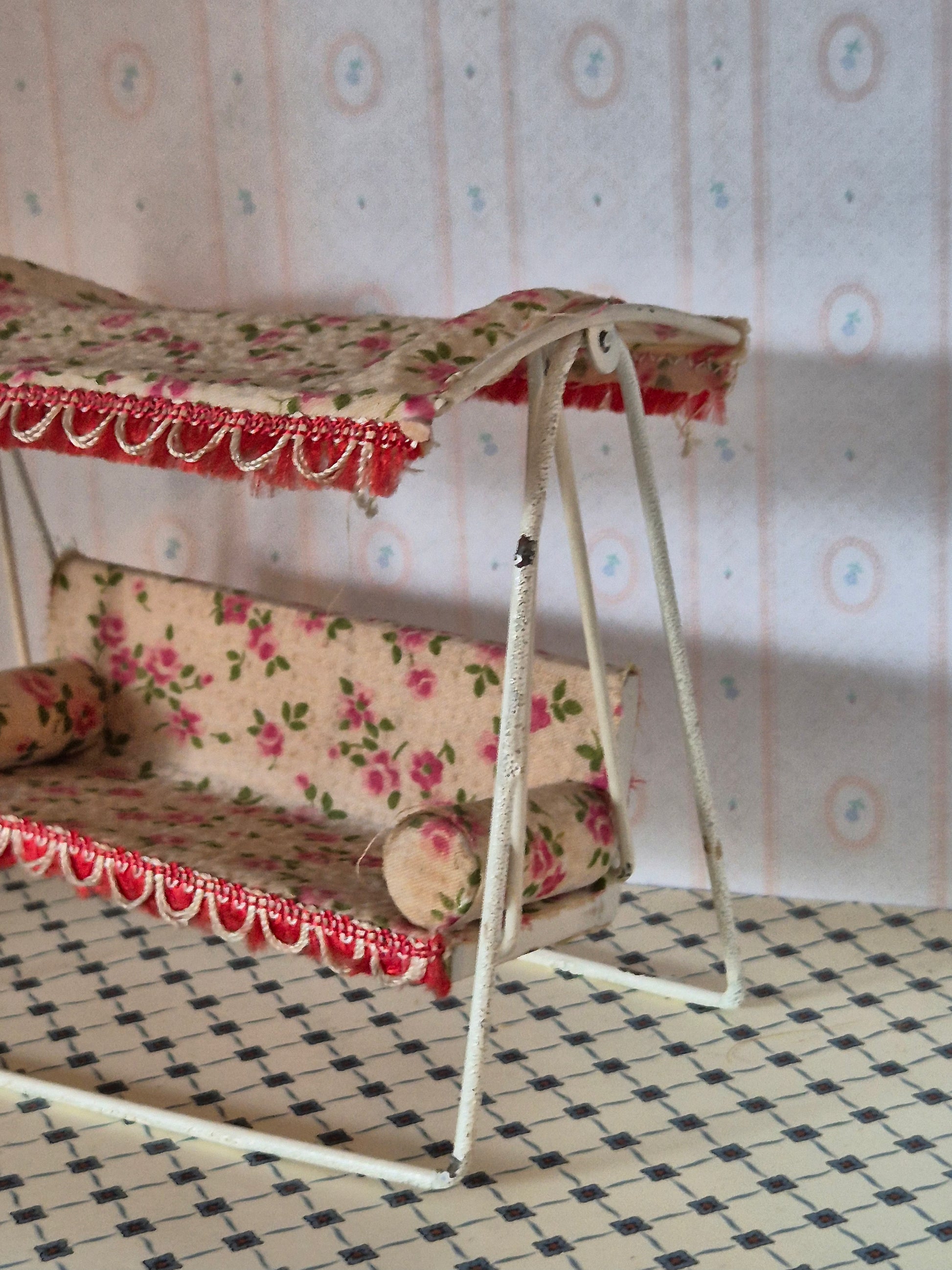 Pæn vintage original Lundby havegynge fra 1960erne. Den er brugt med patina og brugsspor, stellet er lidt skævt og stoffet tyndt af tid. Pæne detaljer og mønster.