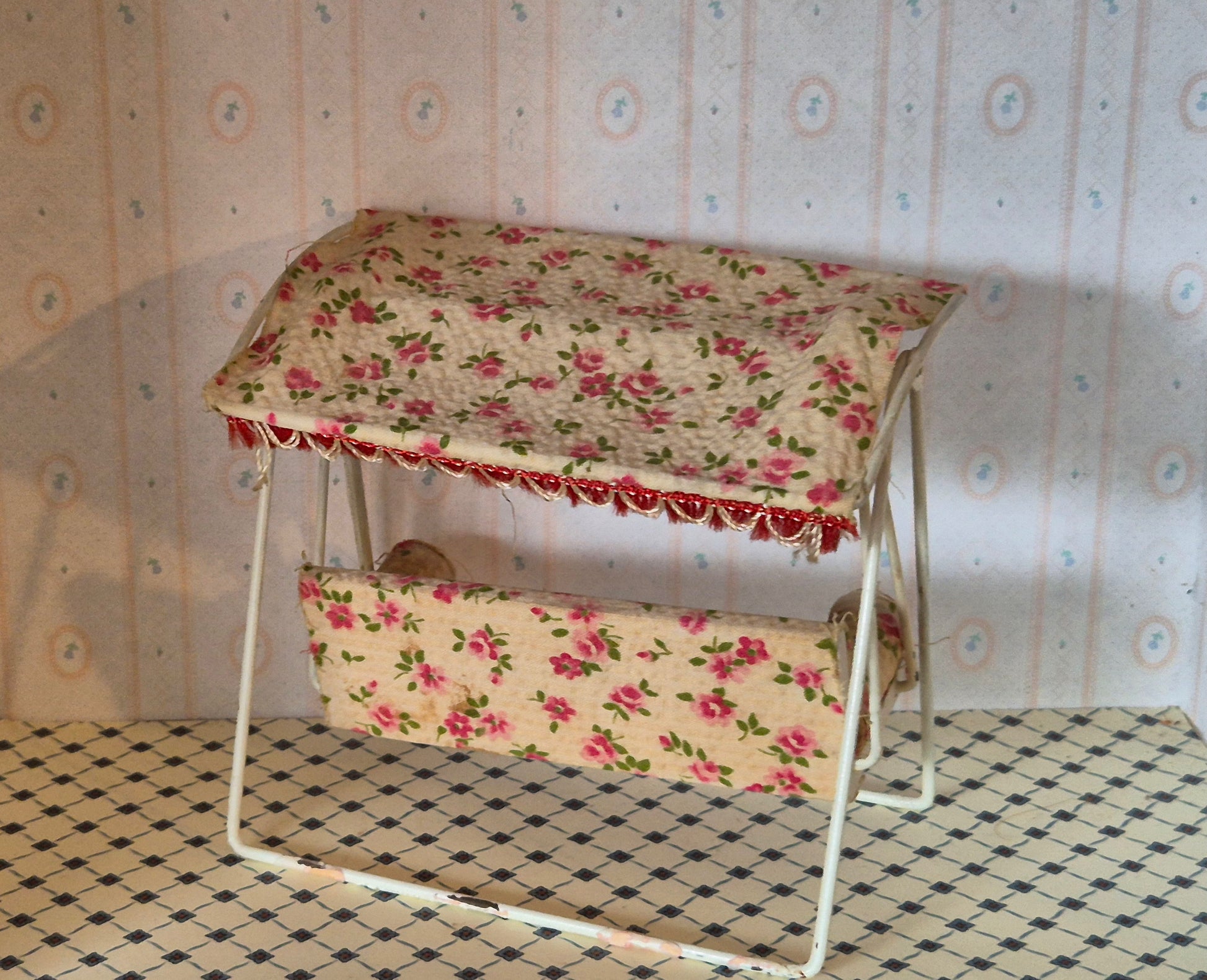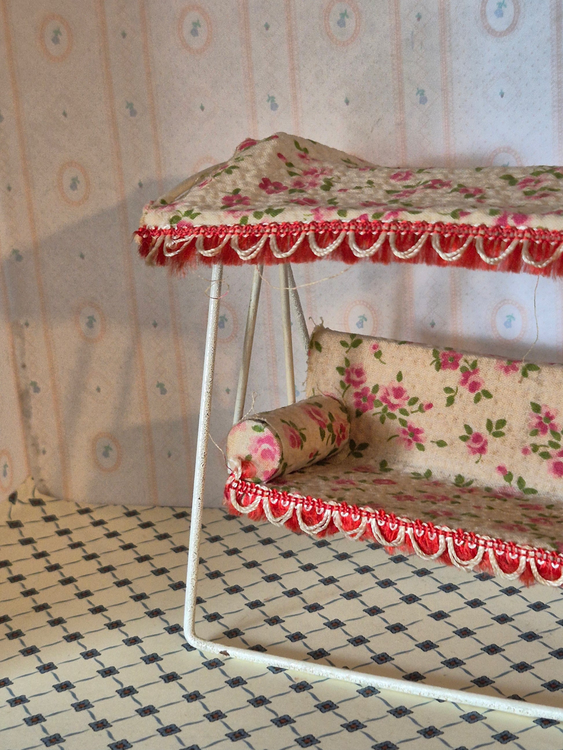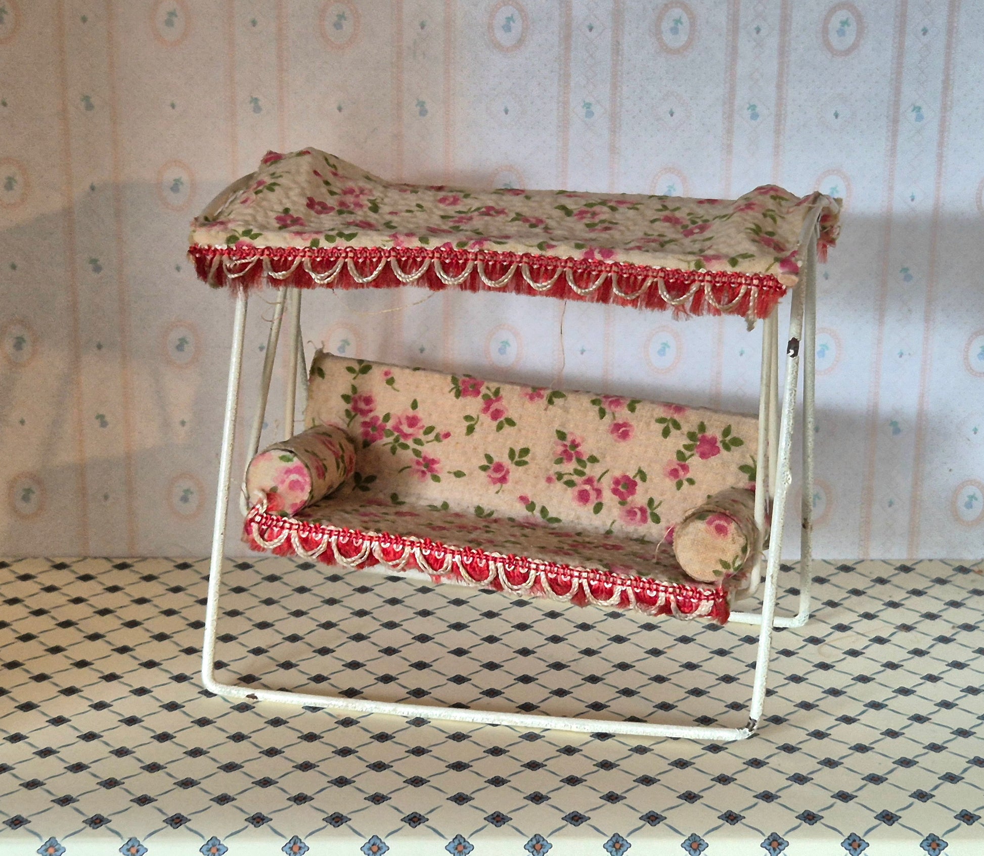 Pæn vintage original Lundby havegynge fra 1960erne. Den er brugt med patina og brugsspor, stellet er lidt skævt og stoffet tyndt af tid. Pæne detaljer og mønster.