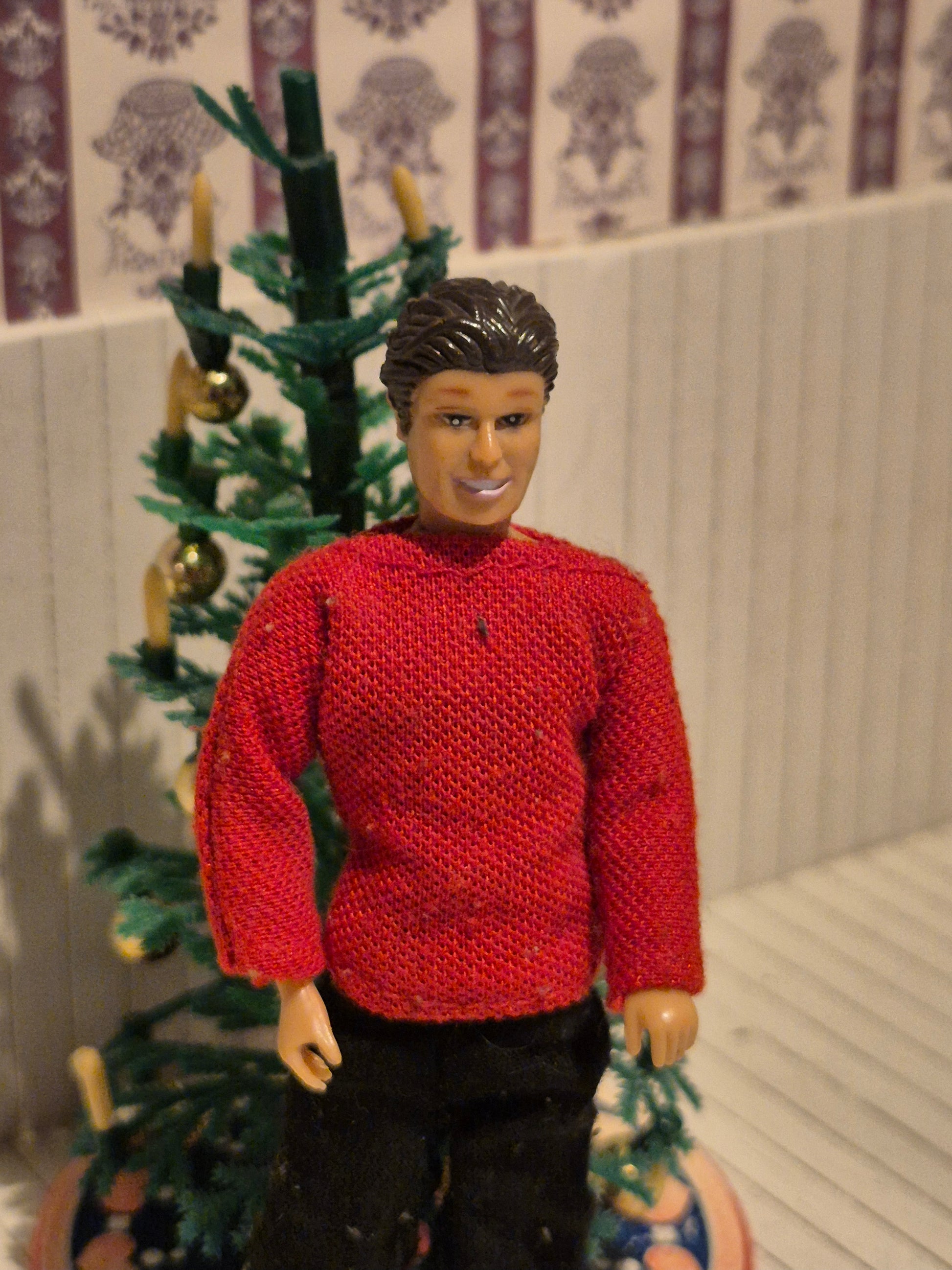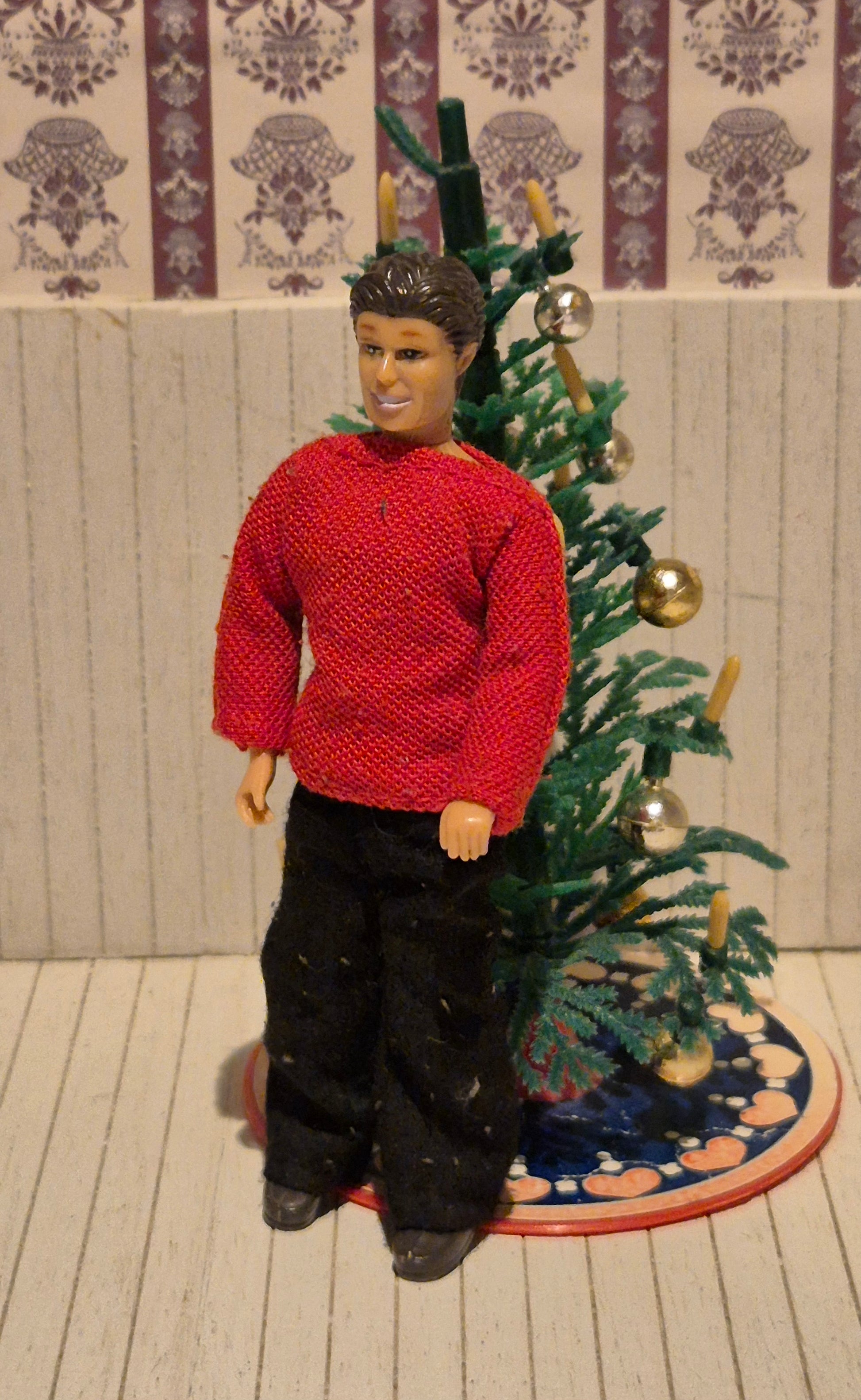 Fin Far dukke med mørkt hår, rød bluse og mørke bukser. Tøjet er originalt.