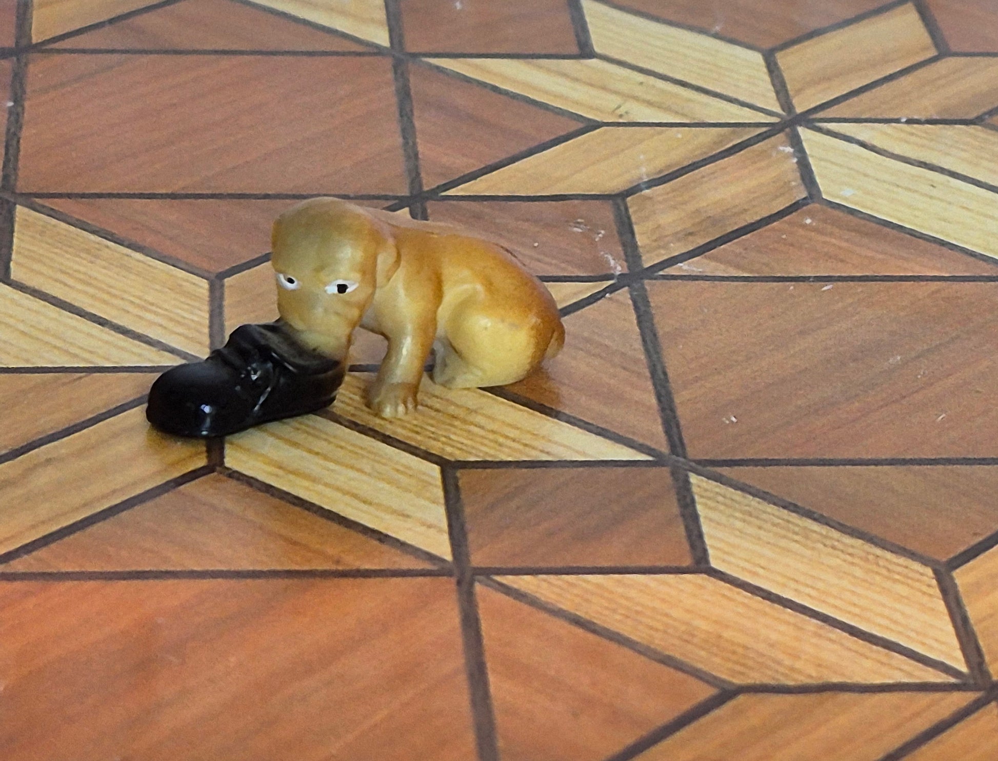 Lille fin lundby hundehvalp, der gnaver i en sko. Den er vintage.