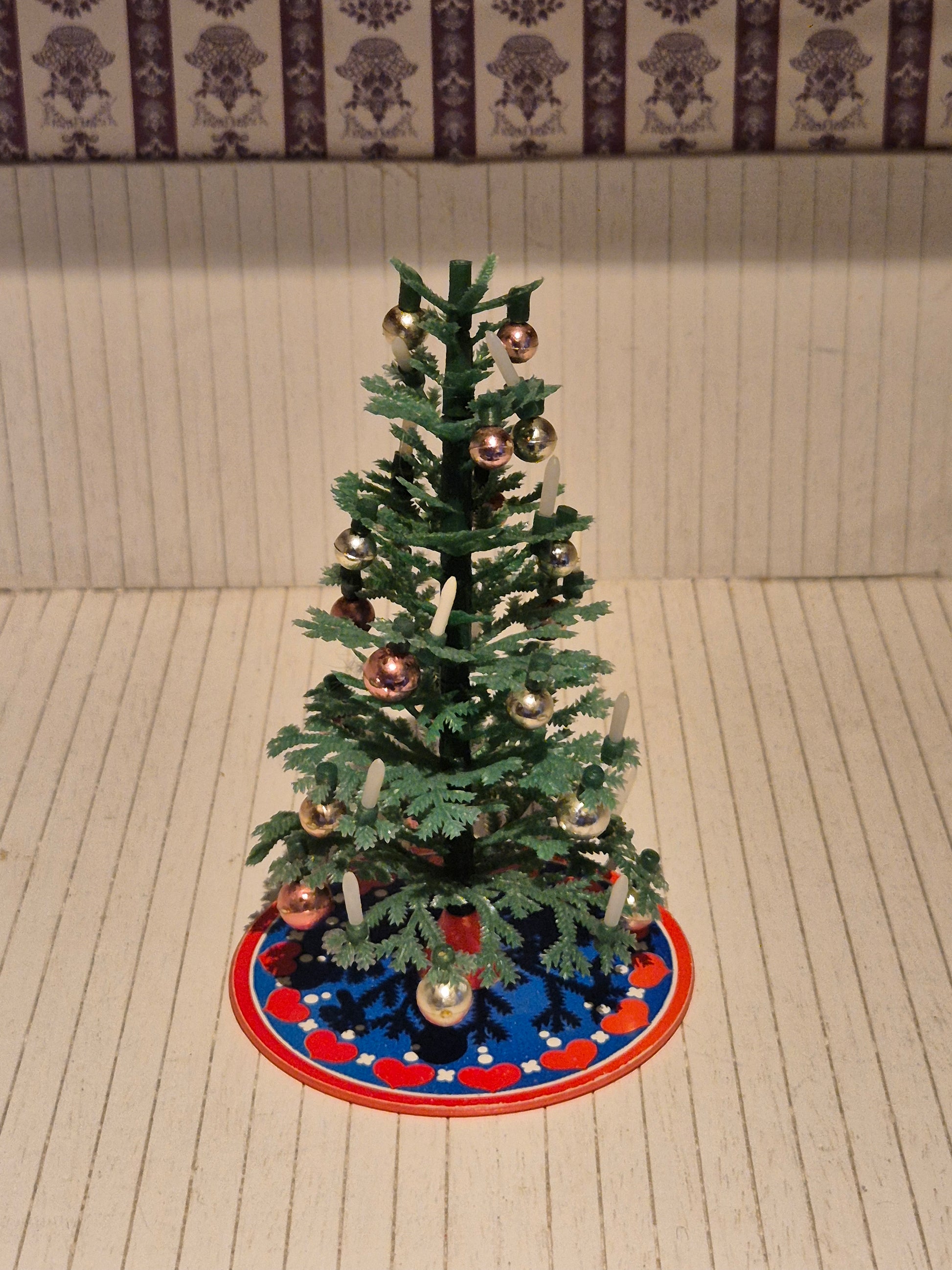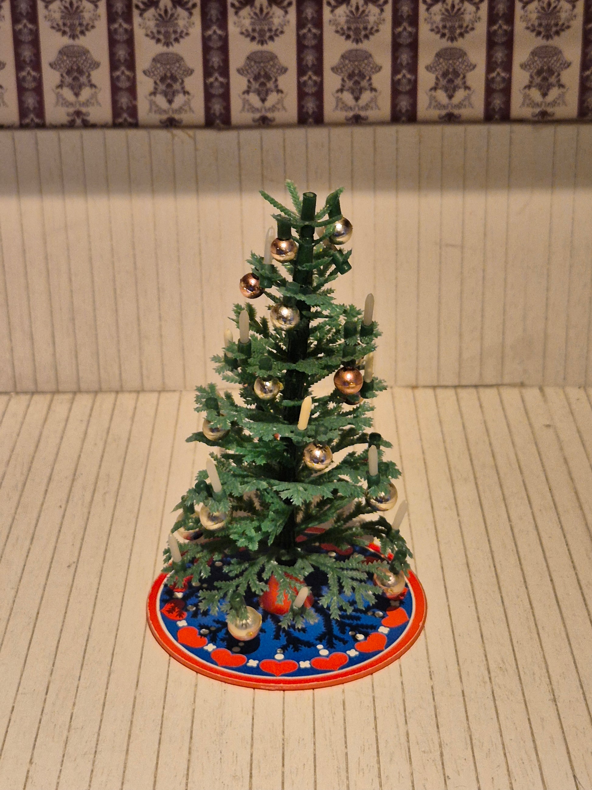Pænt og fint juletræ med kobberfarvede og sølvfarvede julekugler og lys. Det er af mærket Lundby. Det er af plast og i udmærket stand. Der mangler dog stjernen i toppen.
