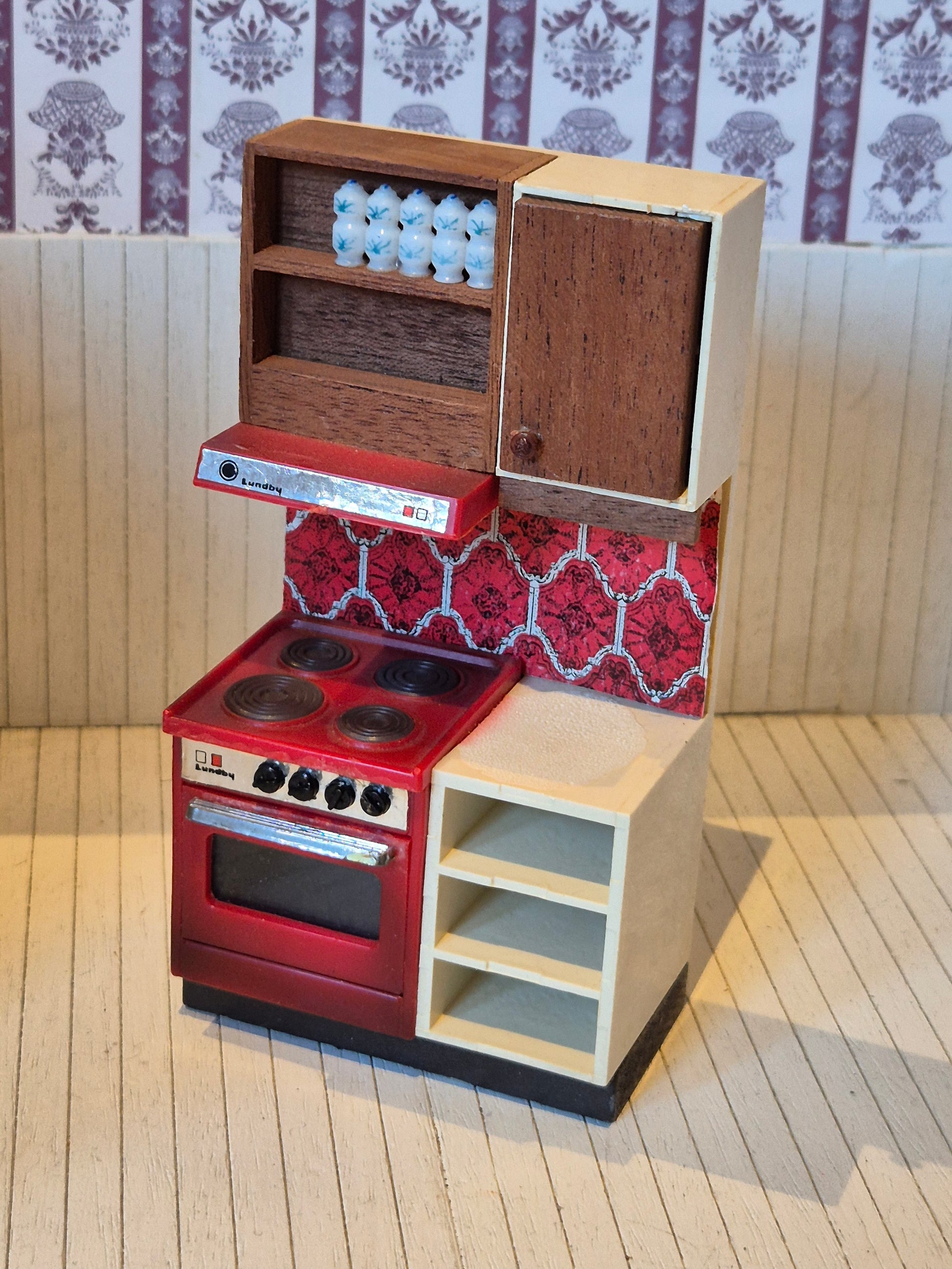 Komfur med mørkt træ og rødt flisetapet på bagvæg.