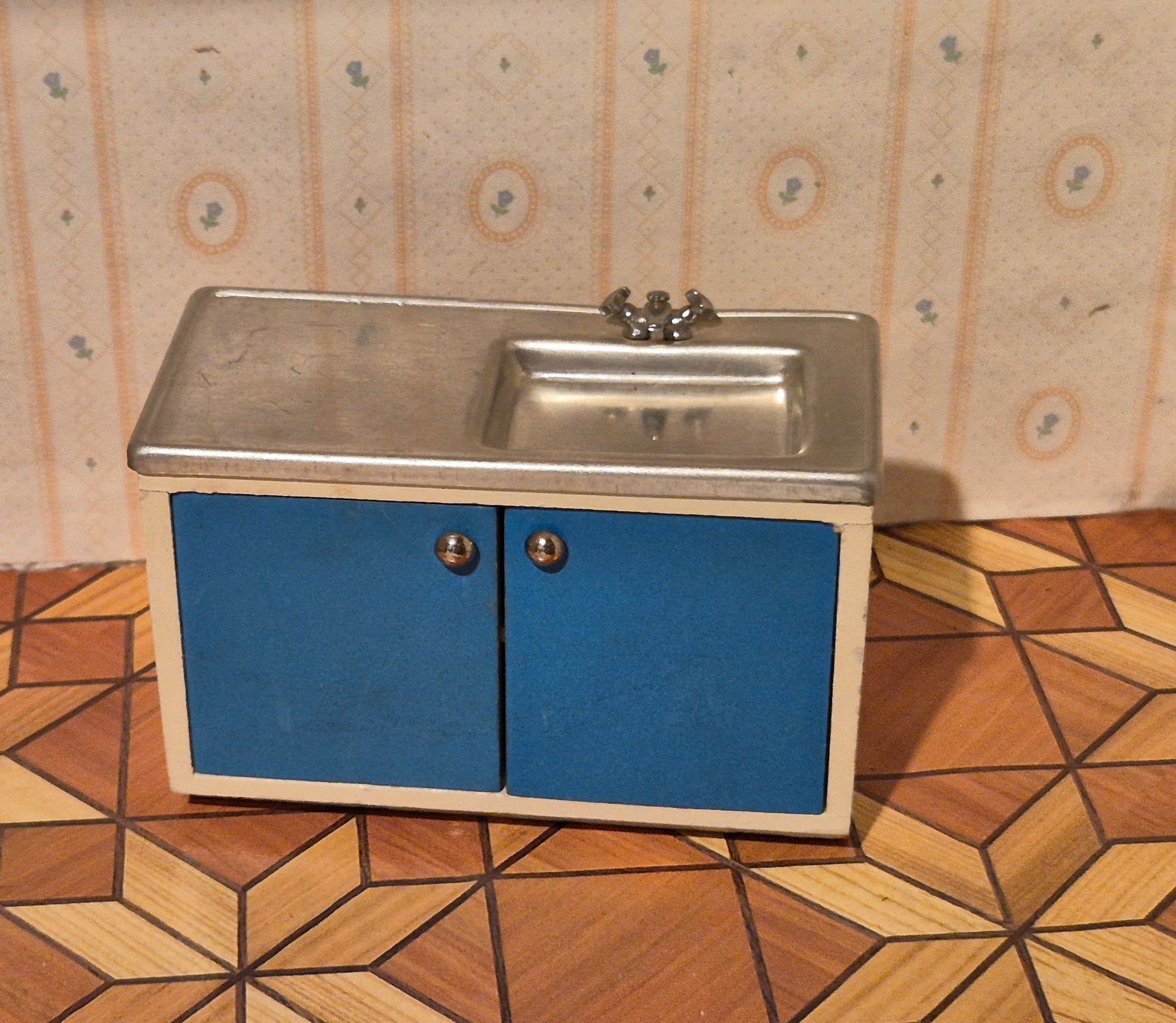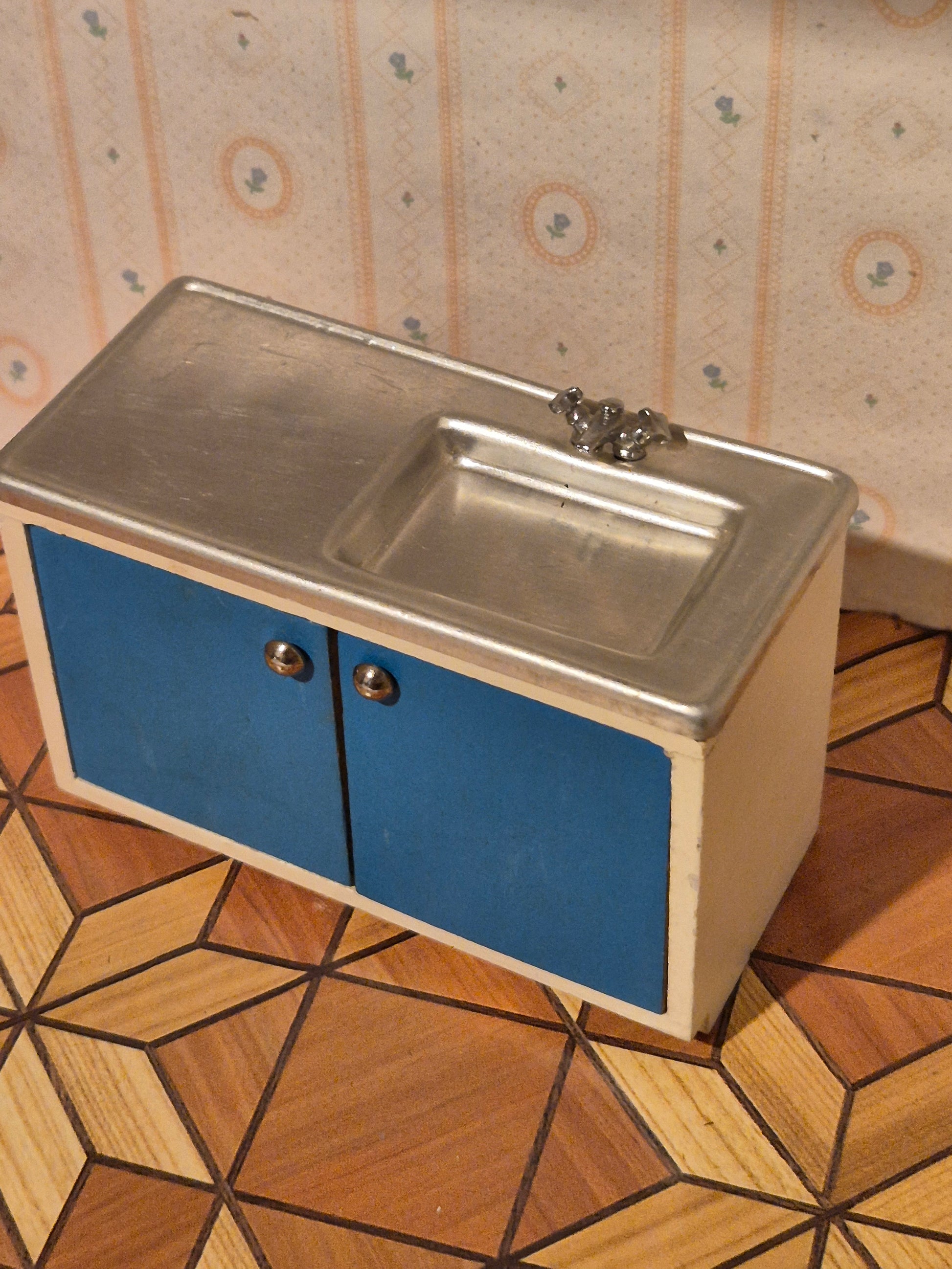 Ældre vask i træ og metal til Lundby dukkehuset. Det er fra 1950erne.