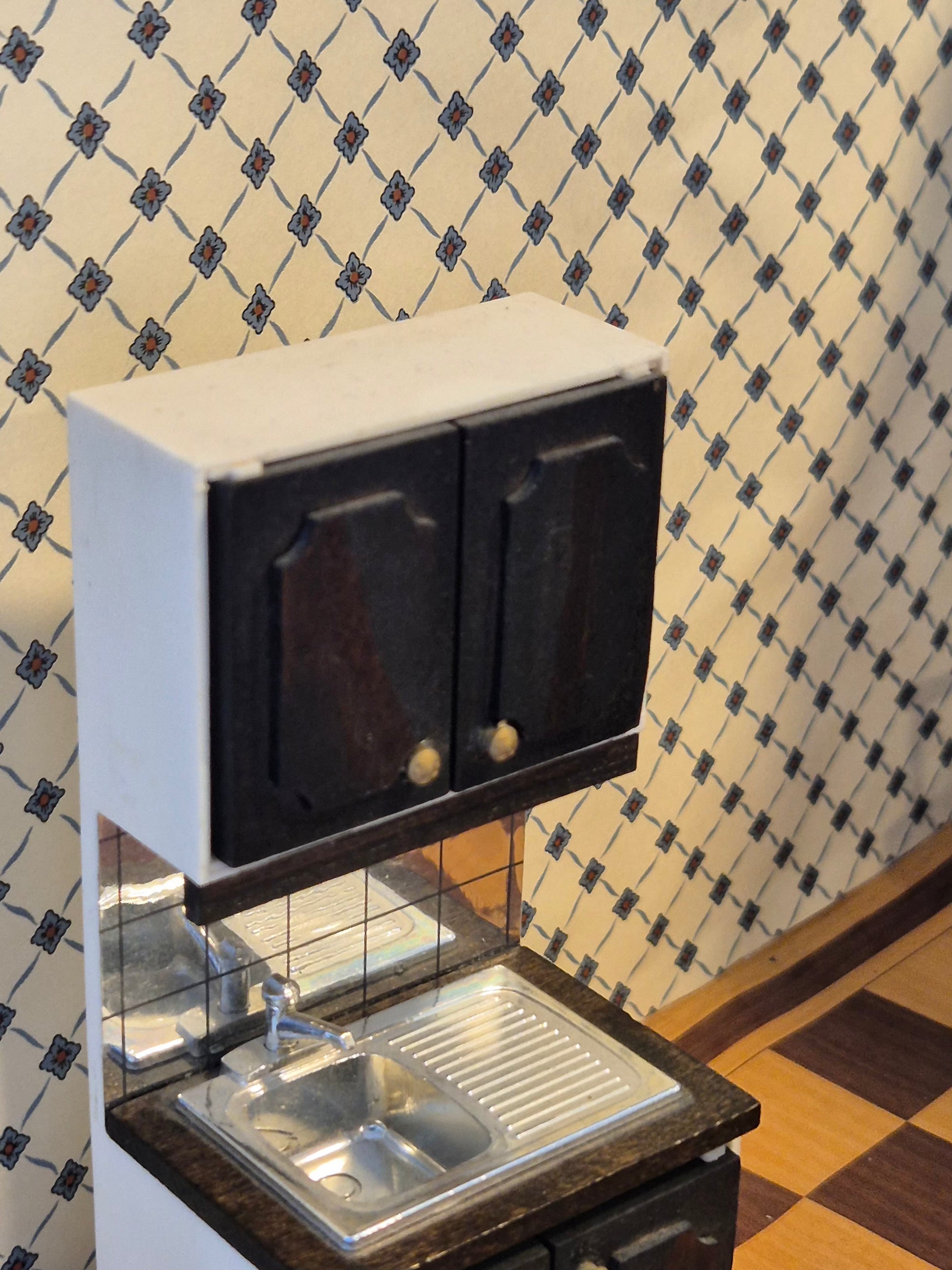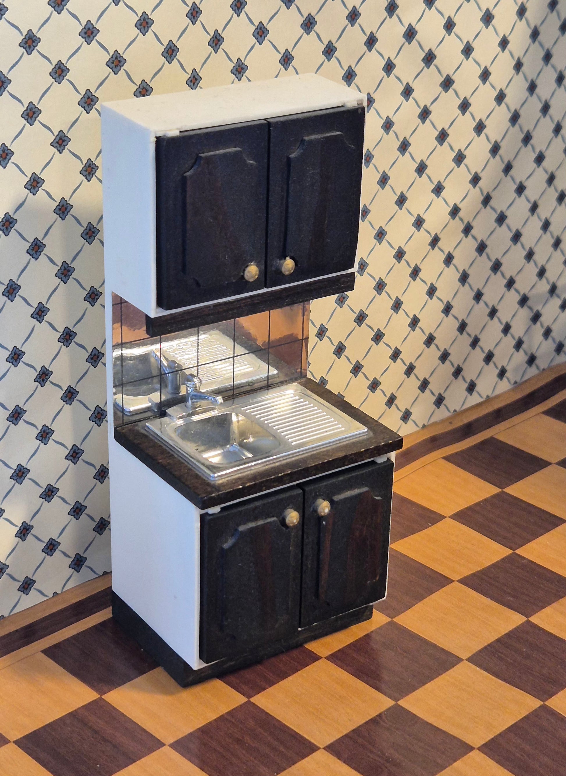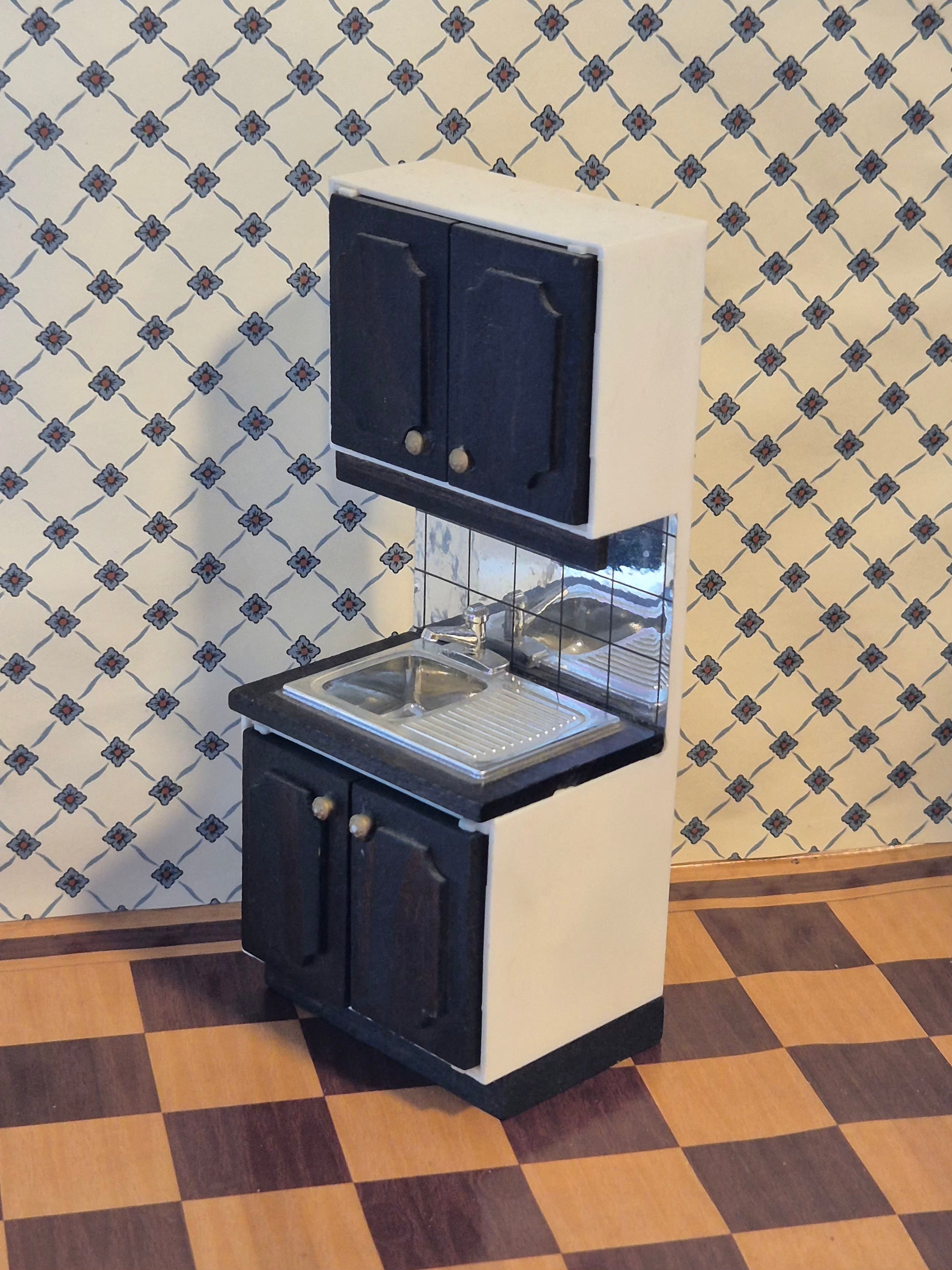 Pænt og fint Lundby køkkenvask element i mørk og med spejl-bagvæg til dukkehuset.