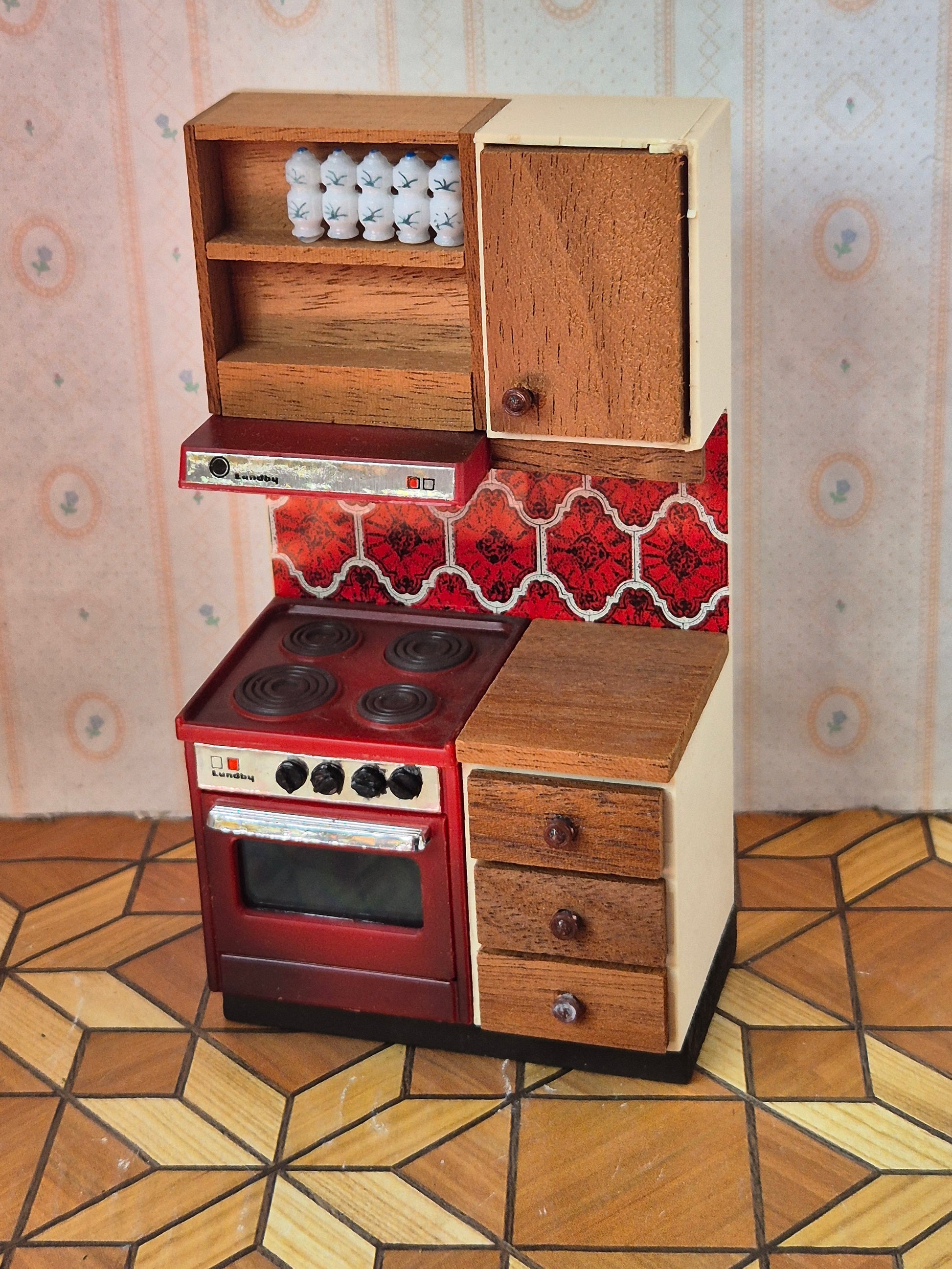 Pænt ældre Lundby komfur i den røde serie. Udmærket god stand.