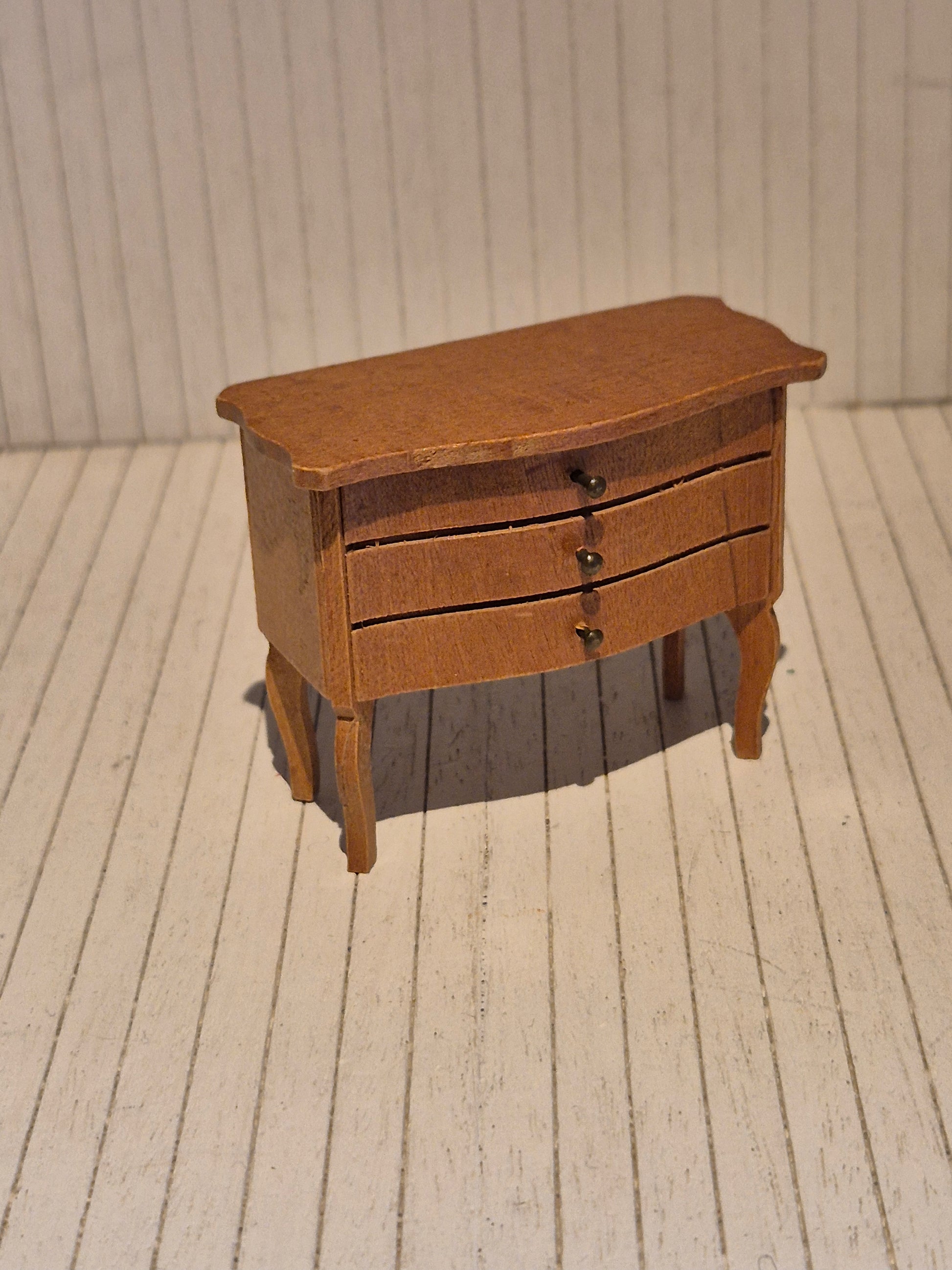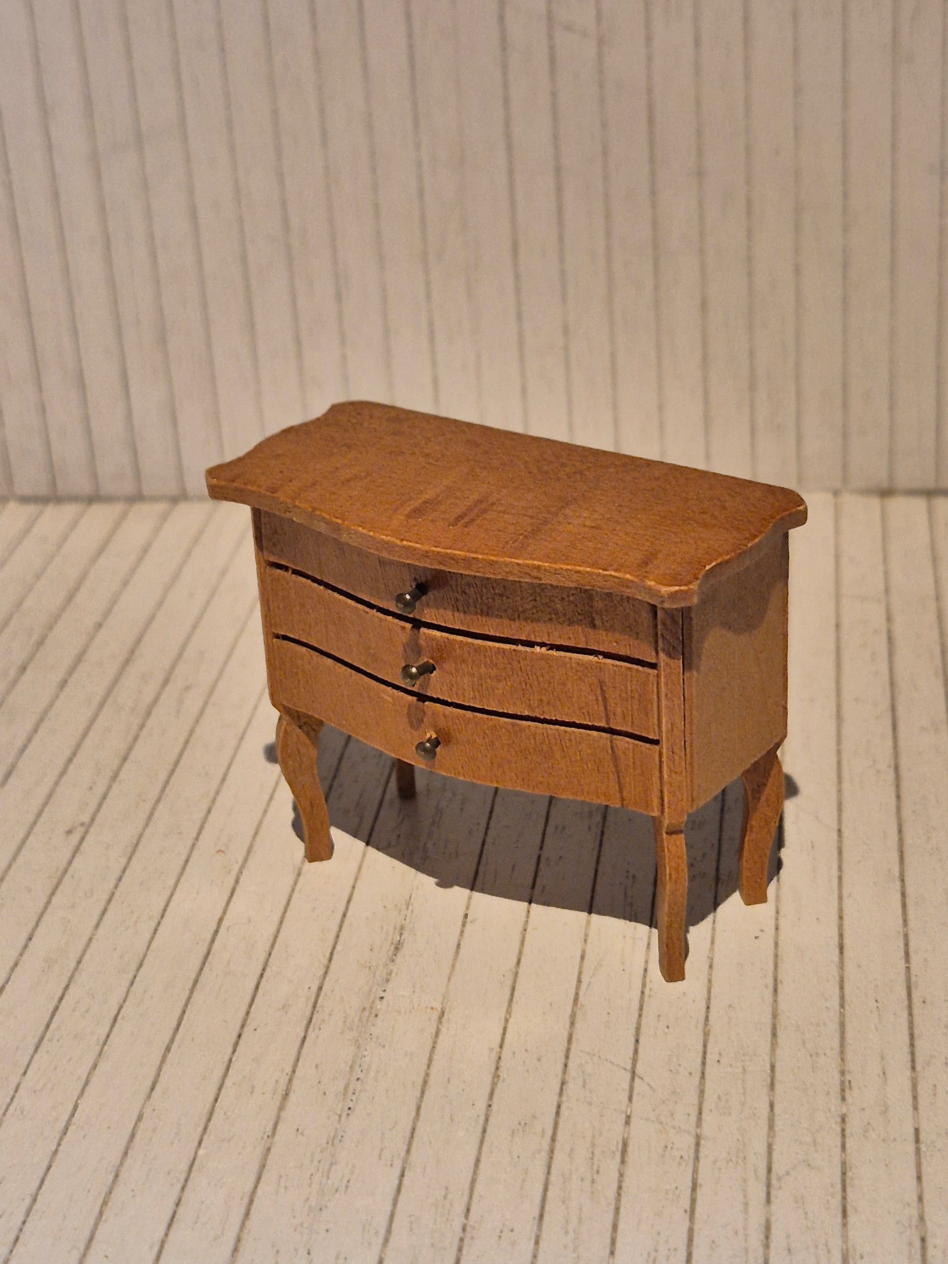 Fin kommode i lysebrunt træ med tre skuffer, der er kunstige og kan ikke åbnes.