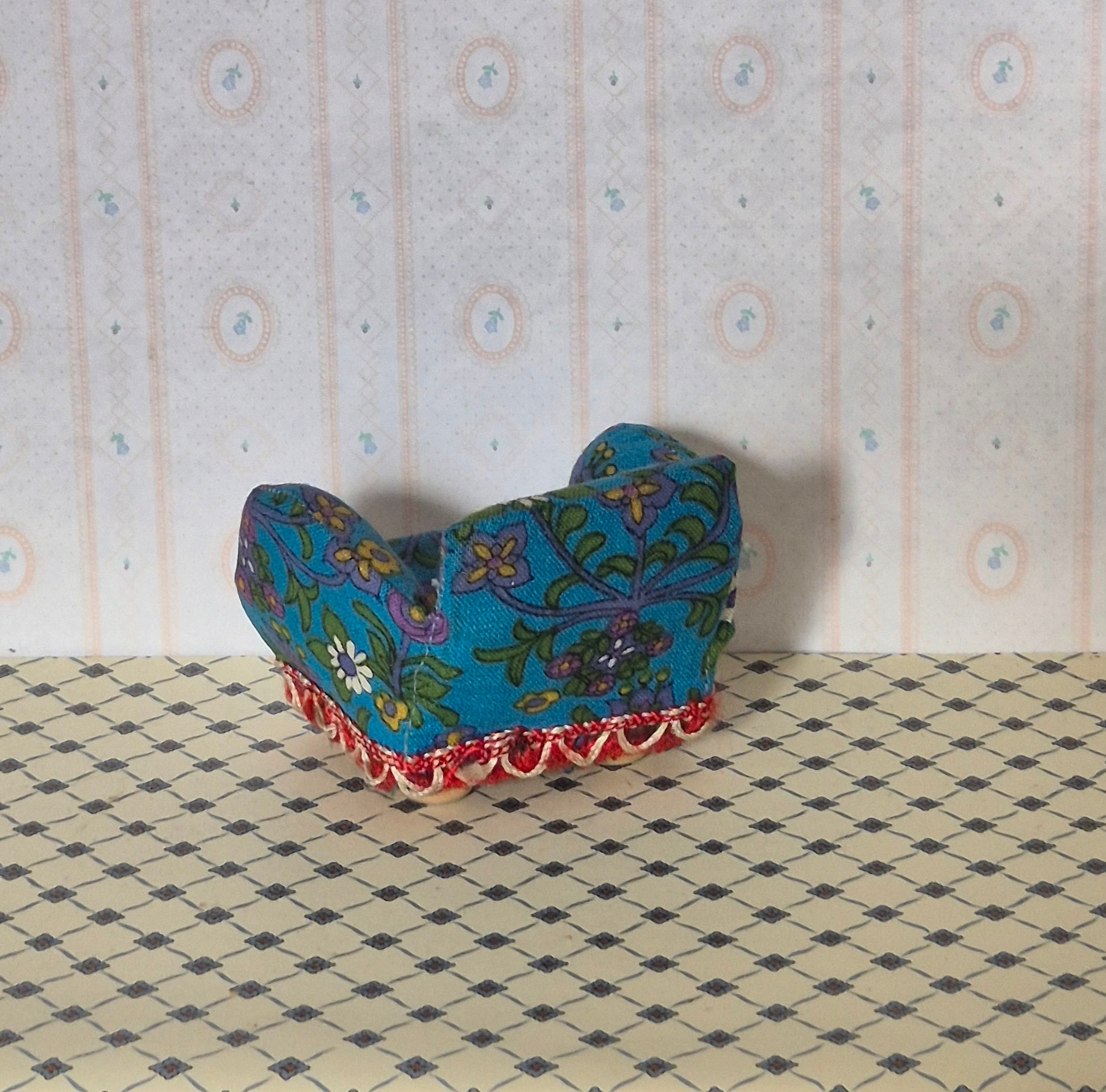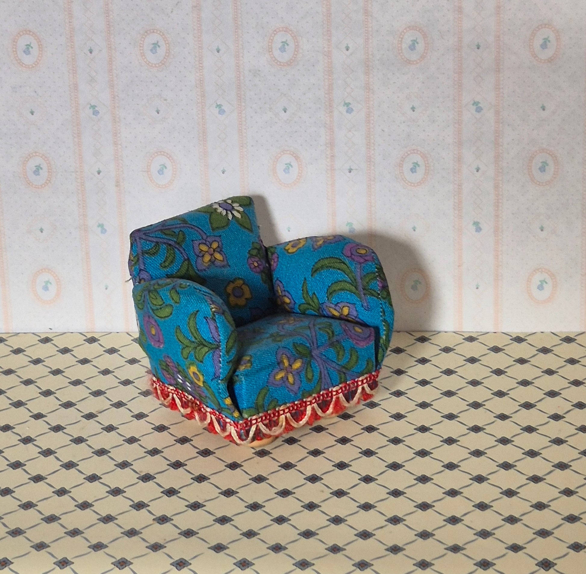 Vintage blå lænestol med blomstermotiv af Lundby fra 1950erne.  Der er brugsspor og patina. Den er ikke ny, men brugt.