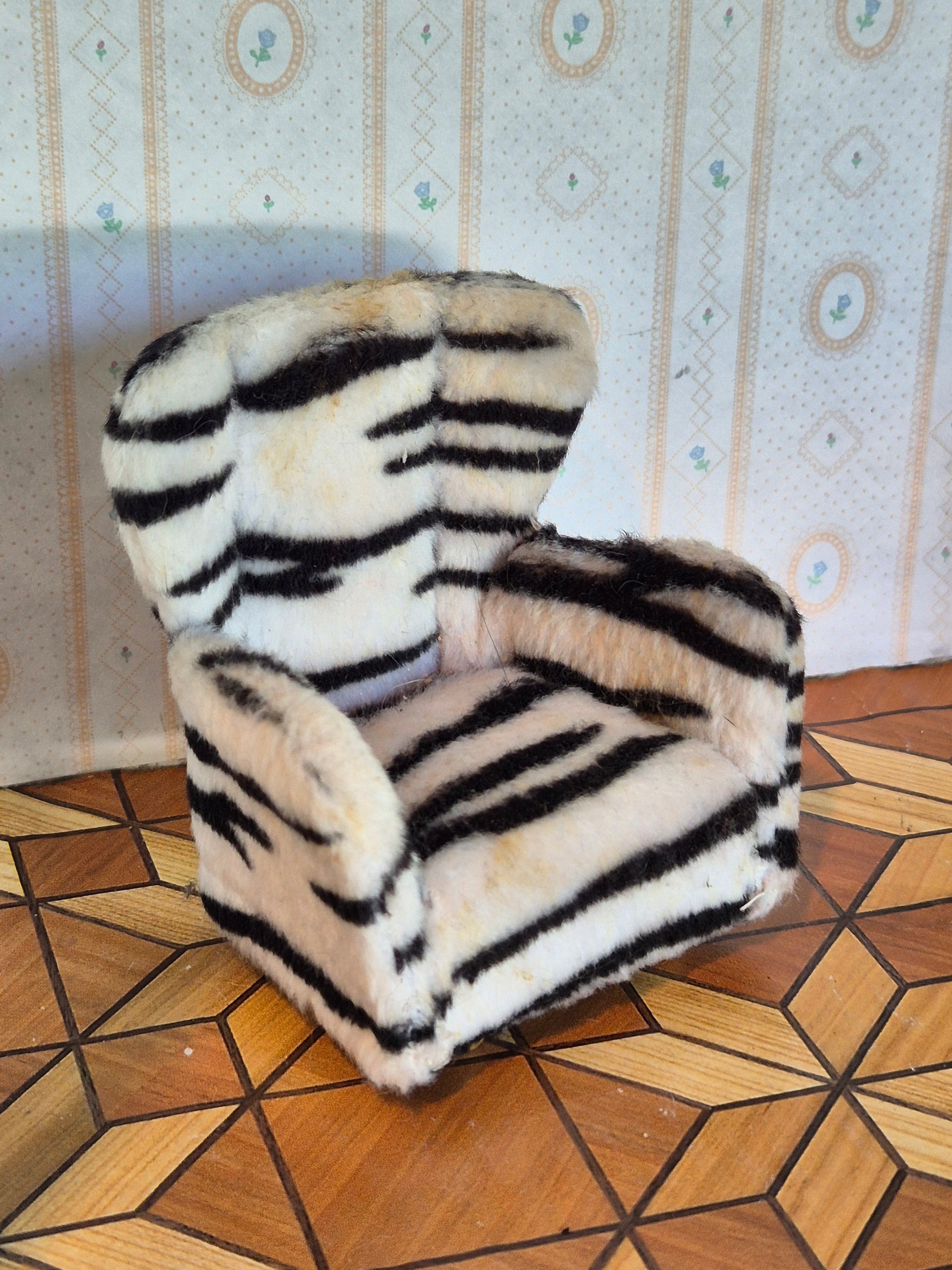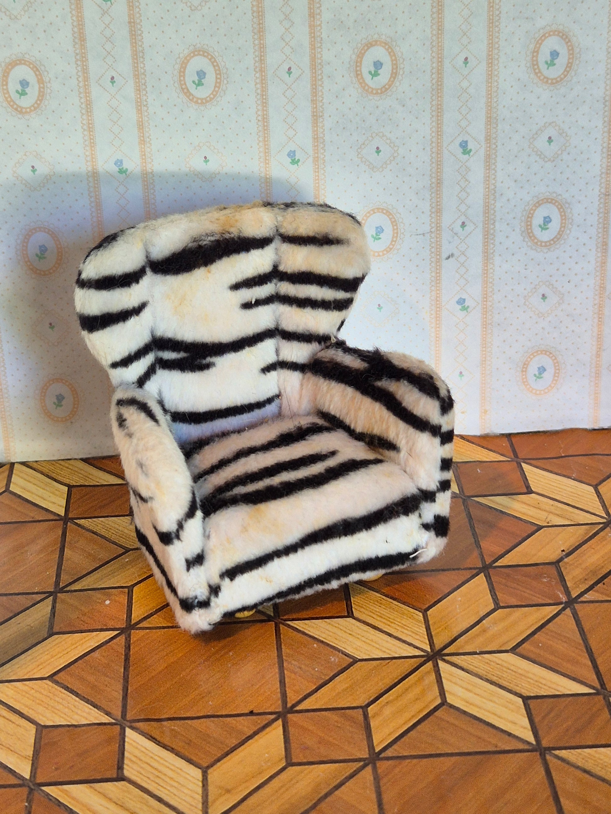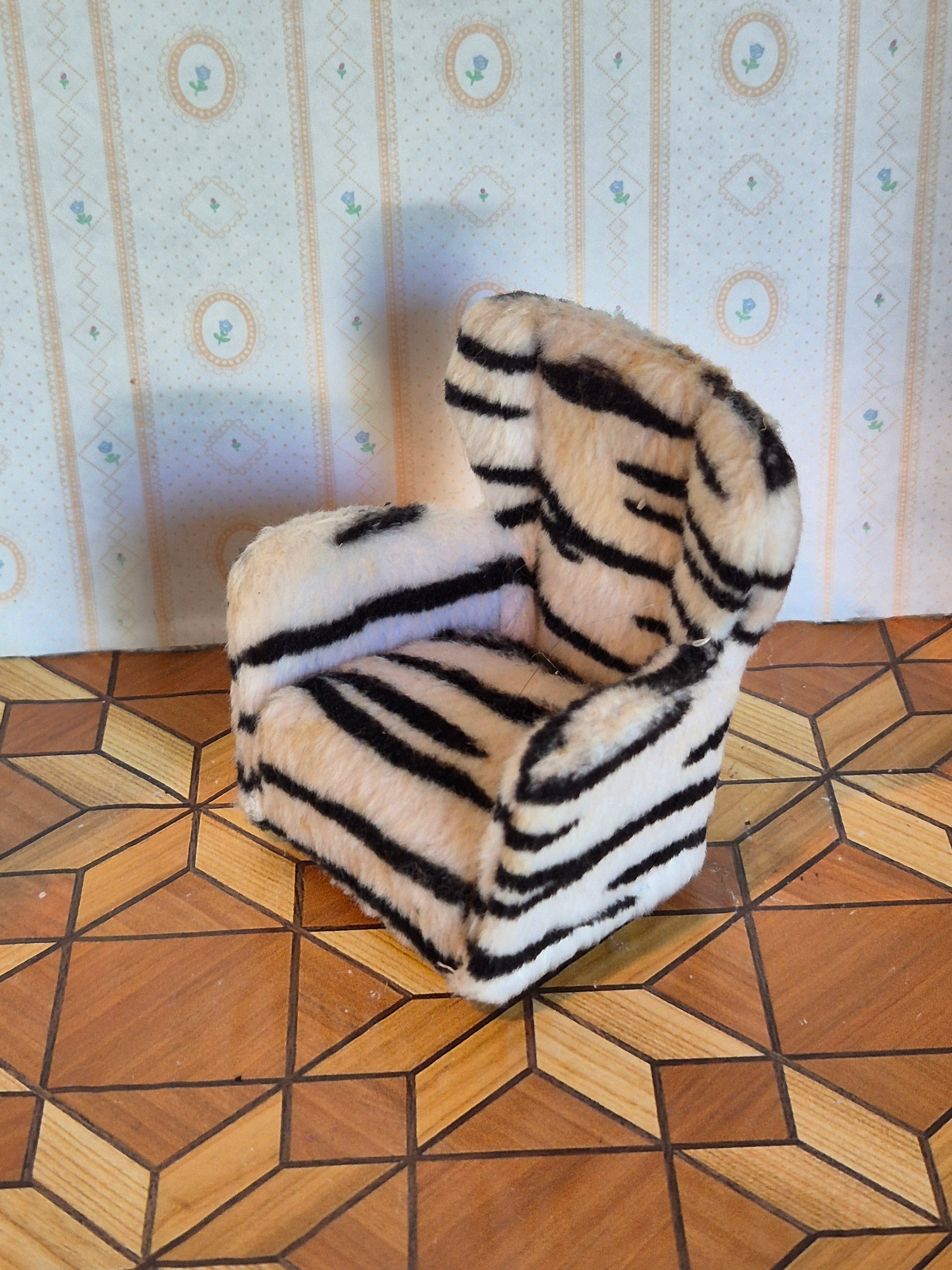 Fin og god Lundby Lænestol I zebrastribet plys betræk. Lidt patina og brugsspor, men rigtig god.