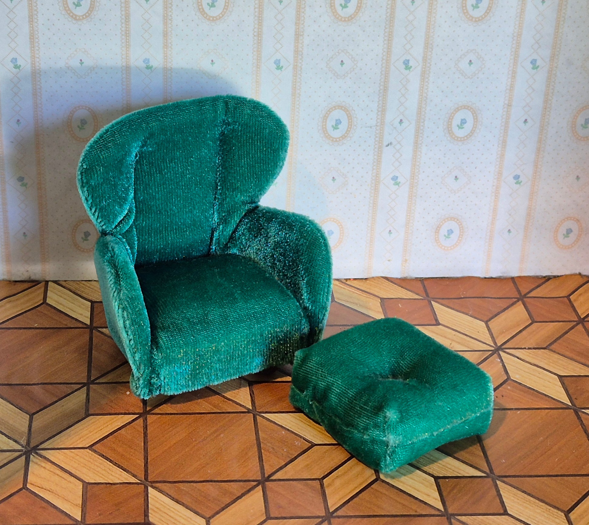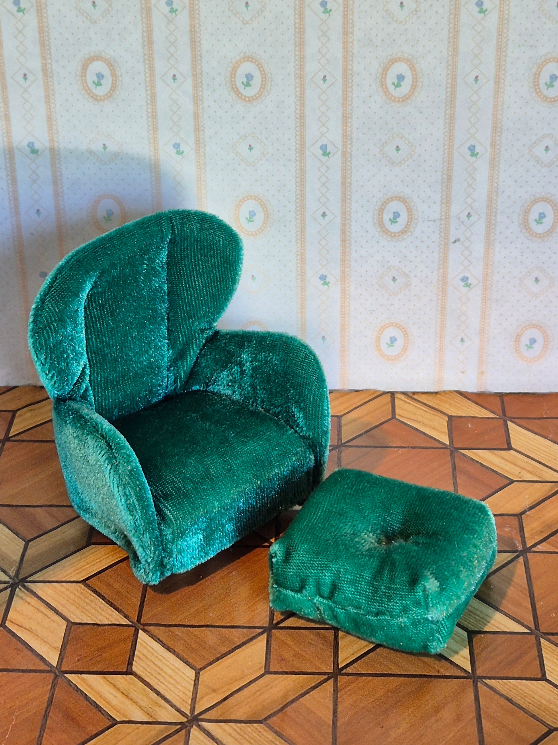 Fik grøn Lundby plys lænestol med puf. Rigtig god stand og meget pæn.