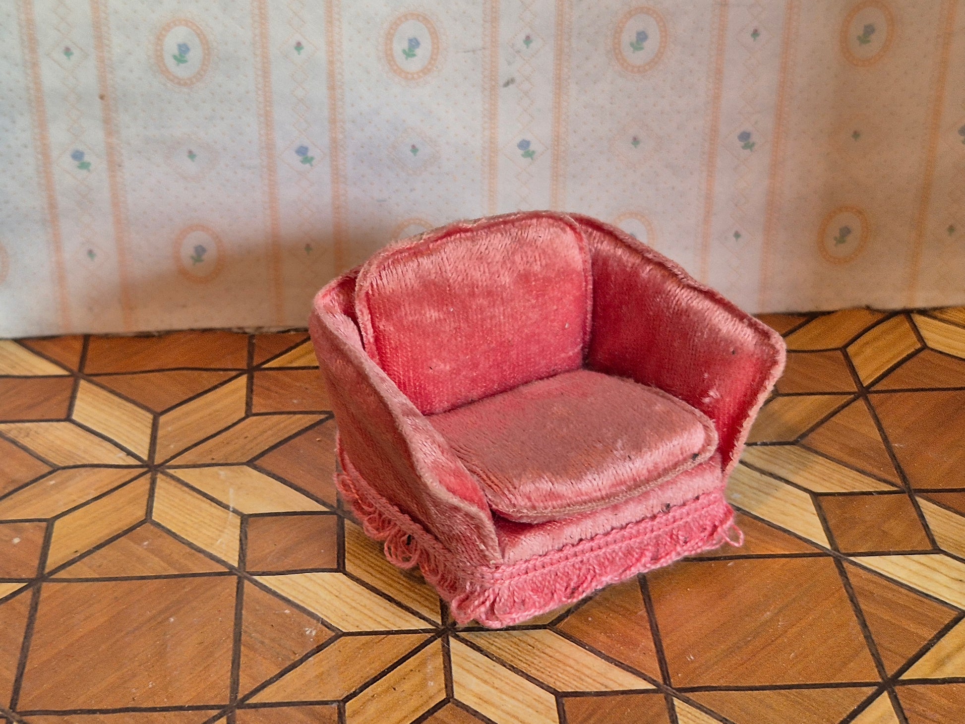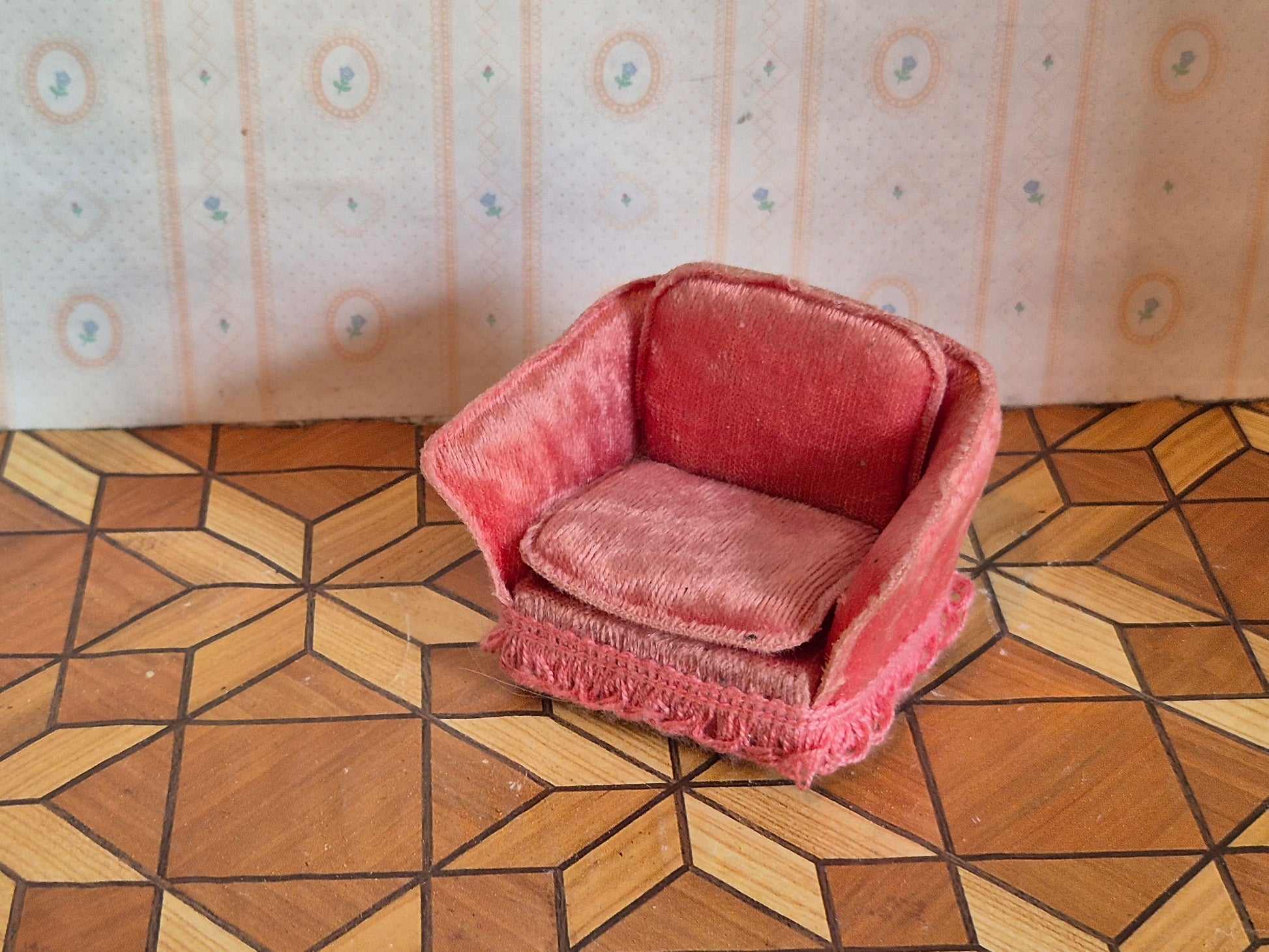 Pink plys lænestol af Lundby. Patina og lidt brugsspor må forventes.