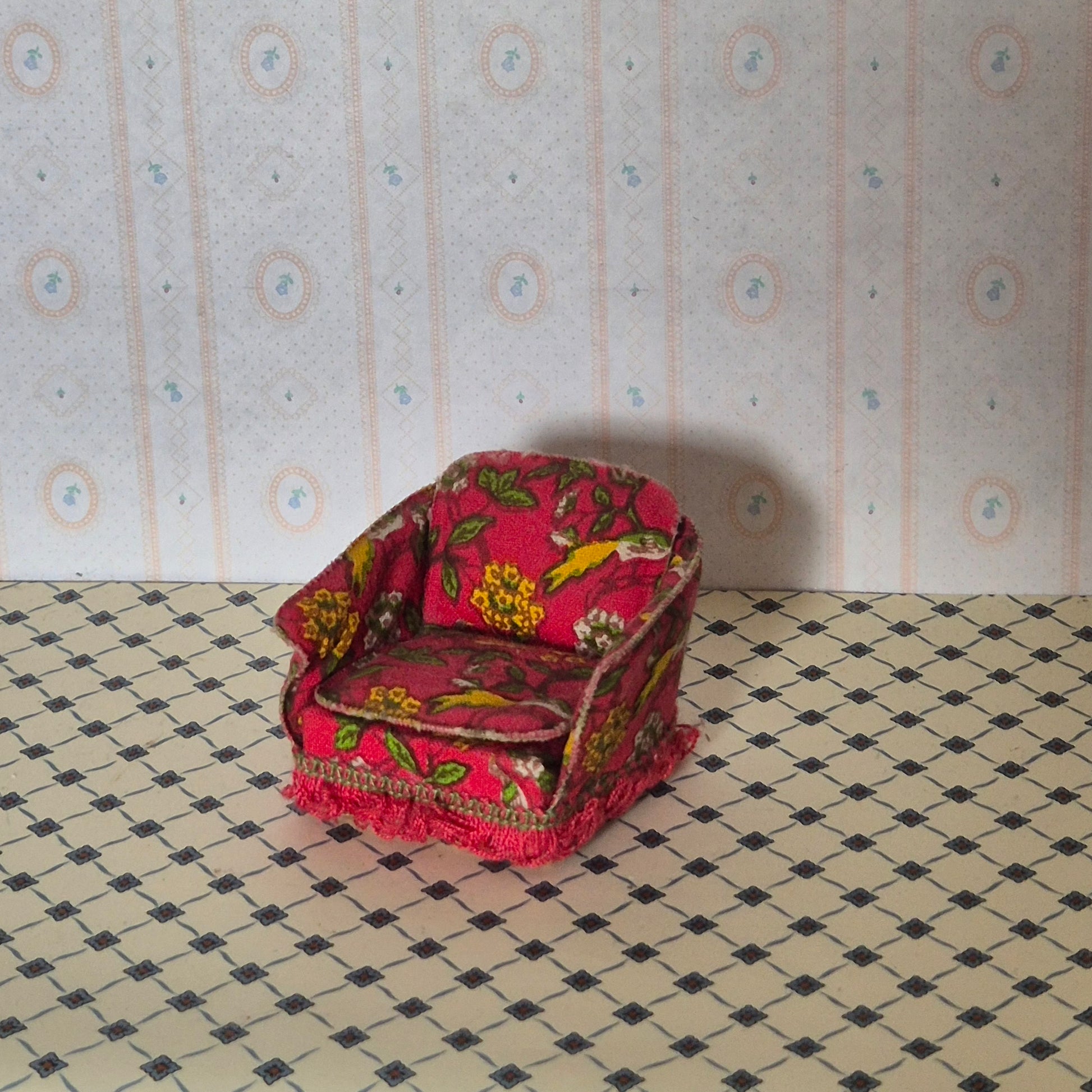 Pæn Lundby lænestol i lyserød med blomstermotiv.  Patina og brugsspor må forventes. Lidt bøjet armlæn.