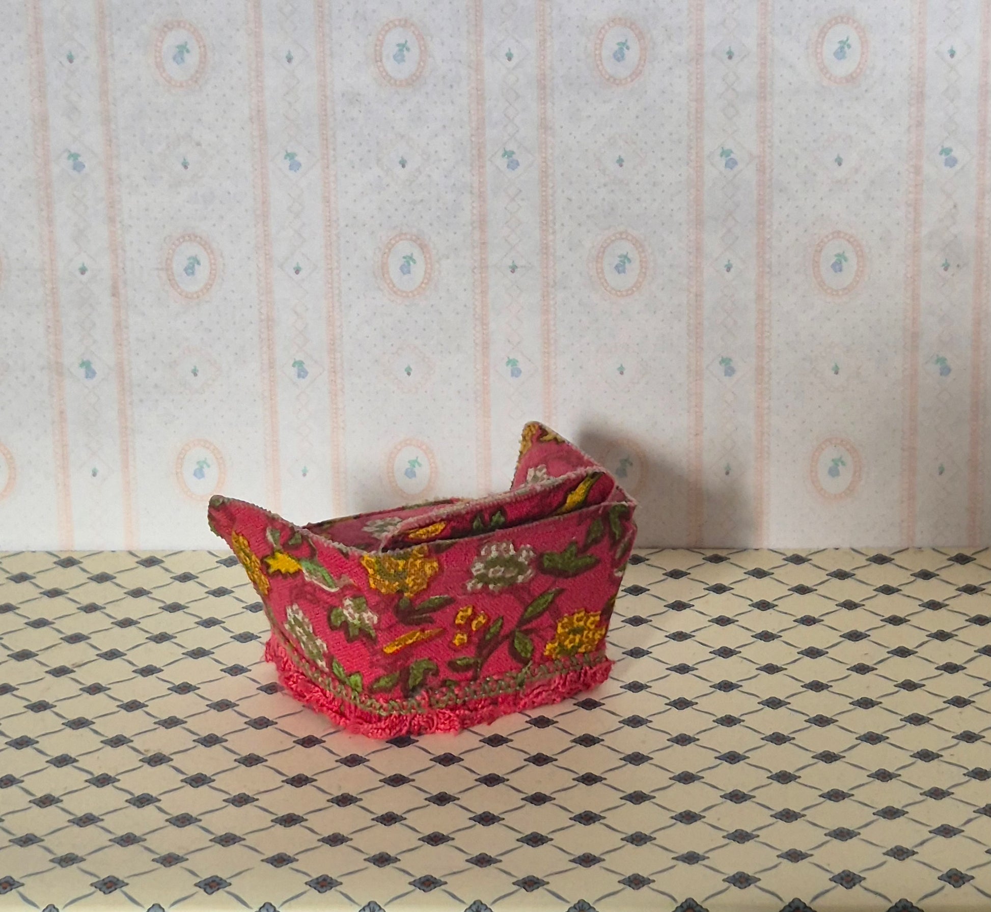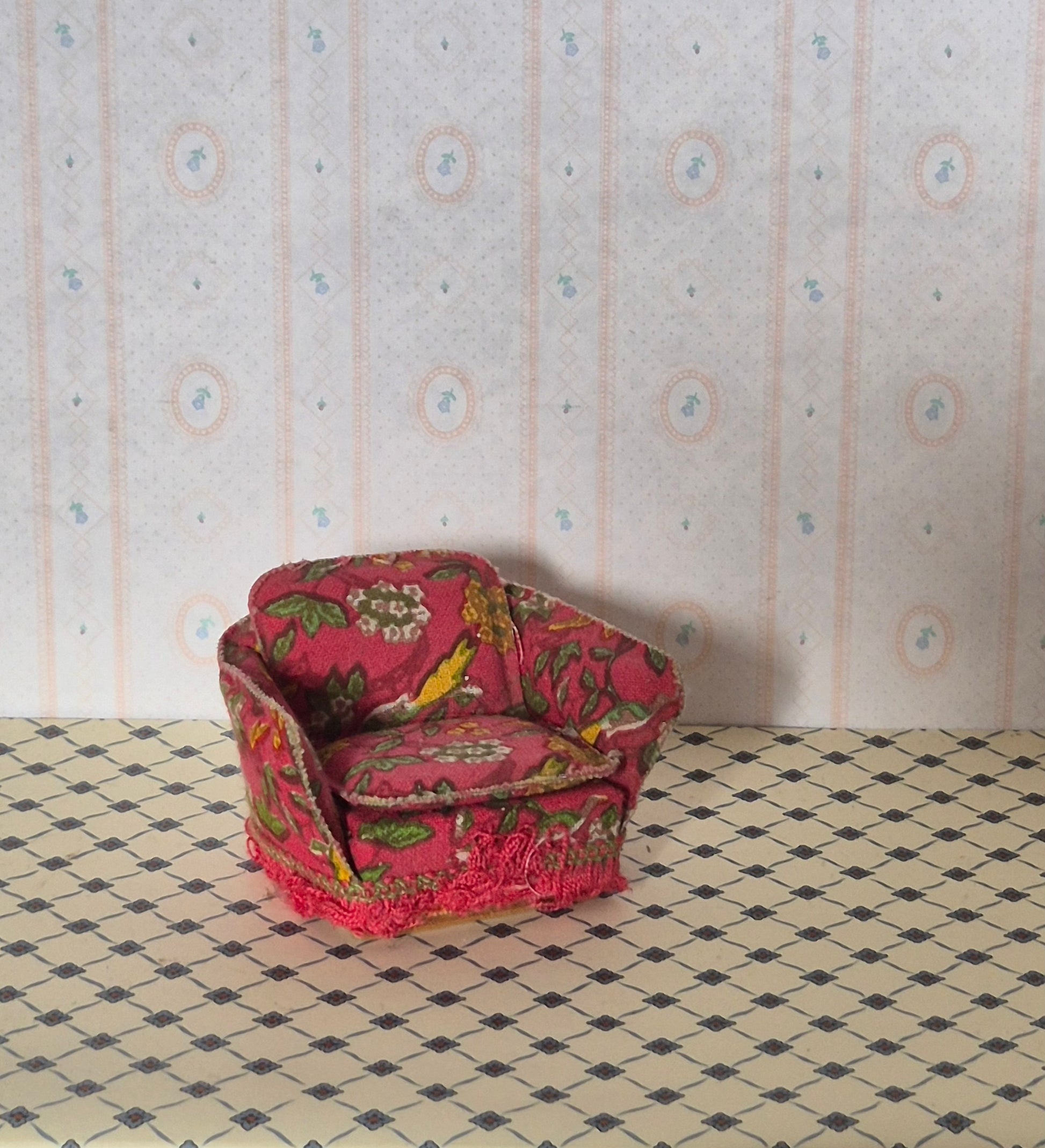 Pæn Lundby lænestol i lyserød med blomstermotiv. Patina og brugsspor må forventes.