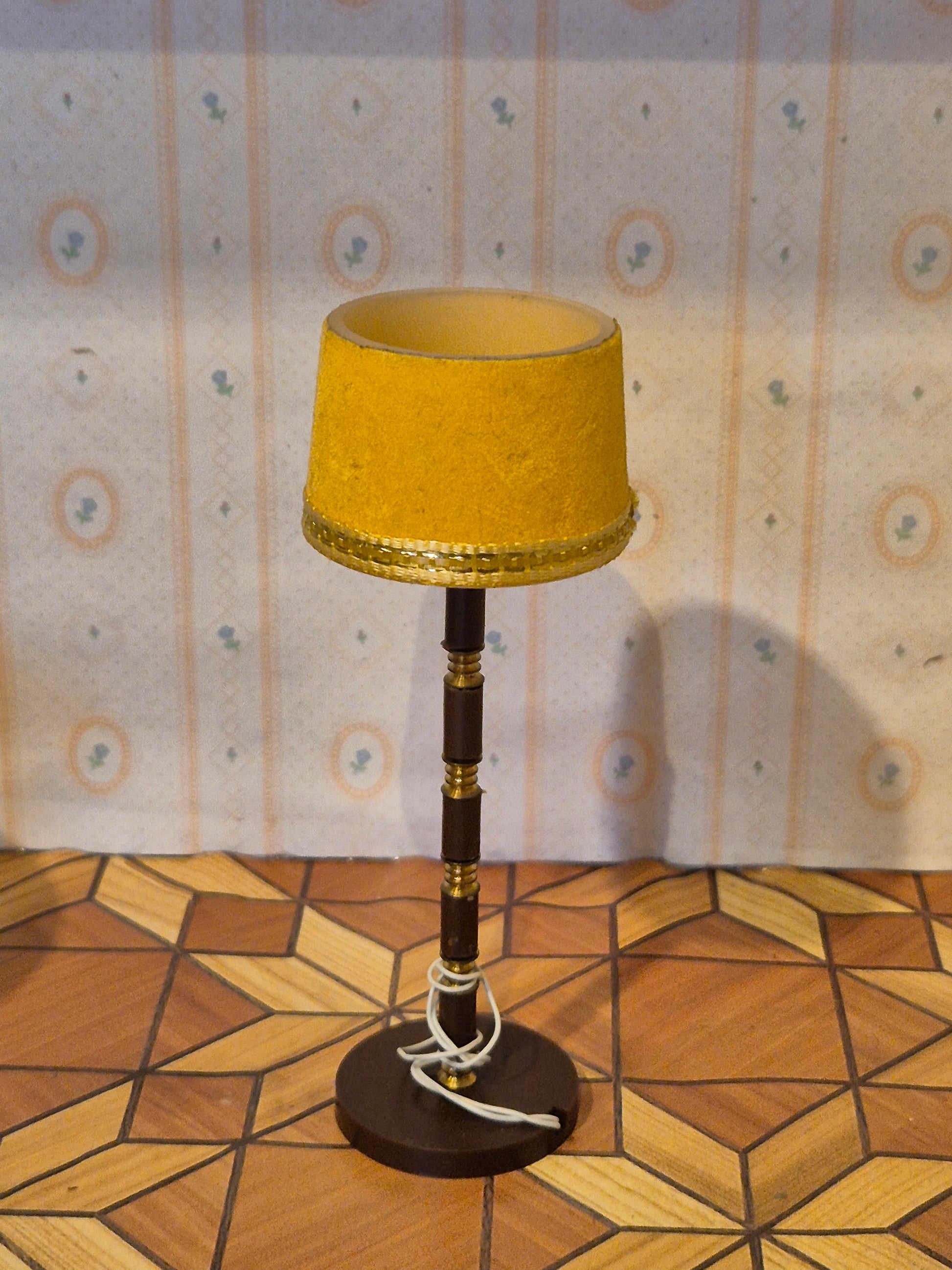 Lundby lampe, standerlampe med gul lampeskærm. Brugt og patina.