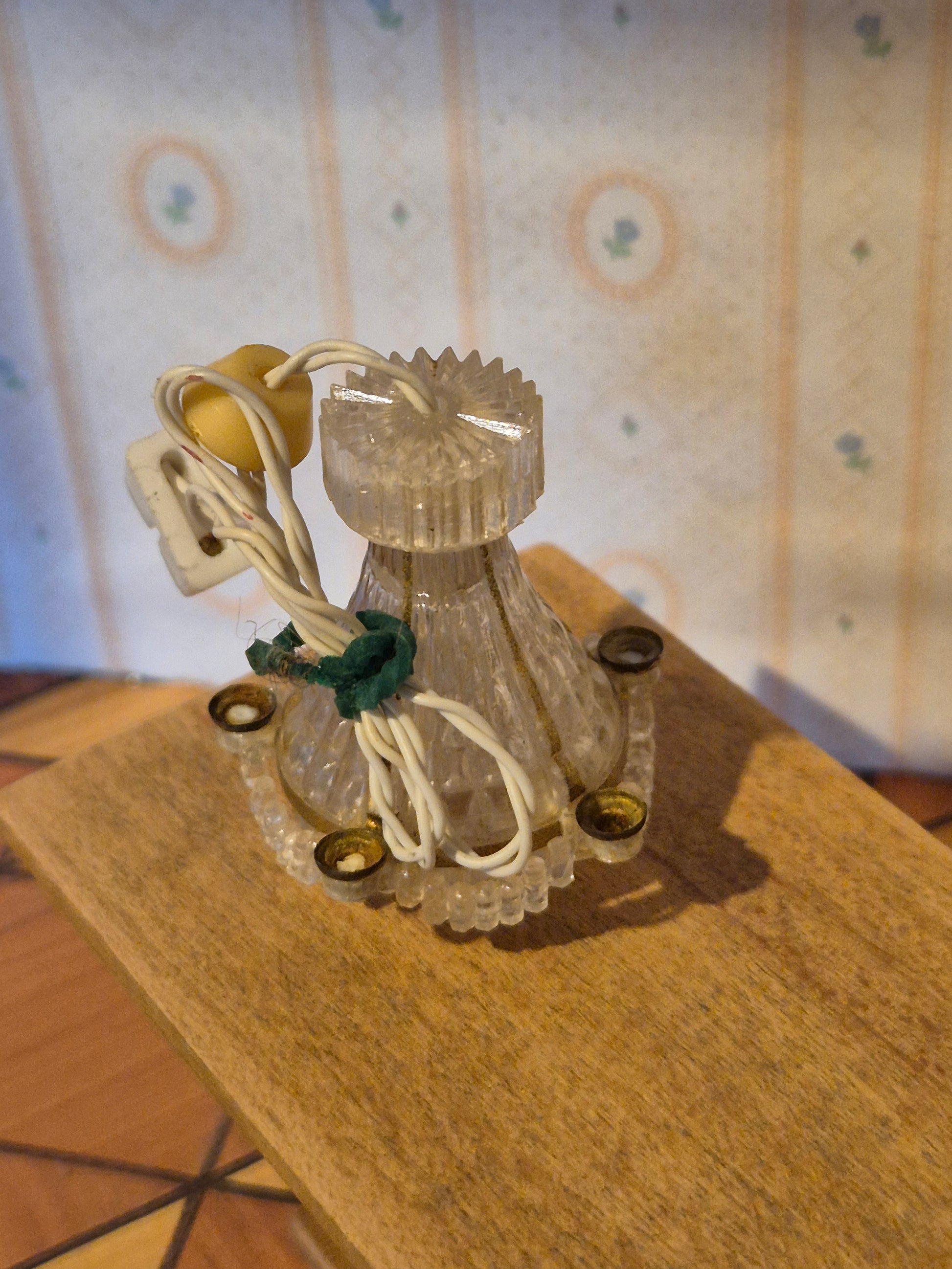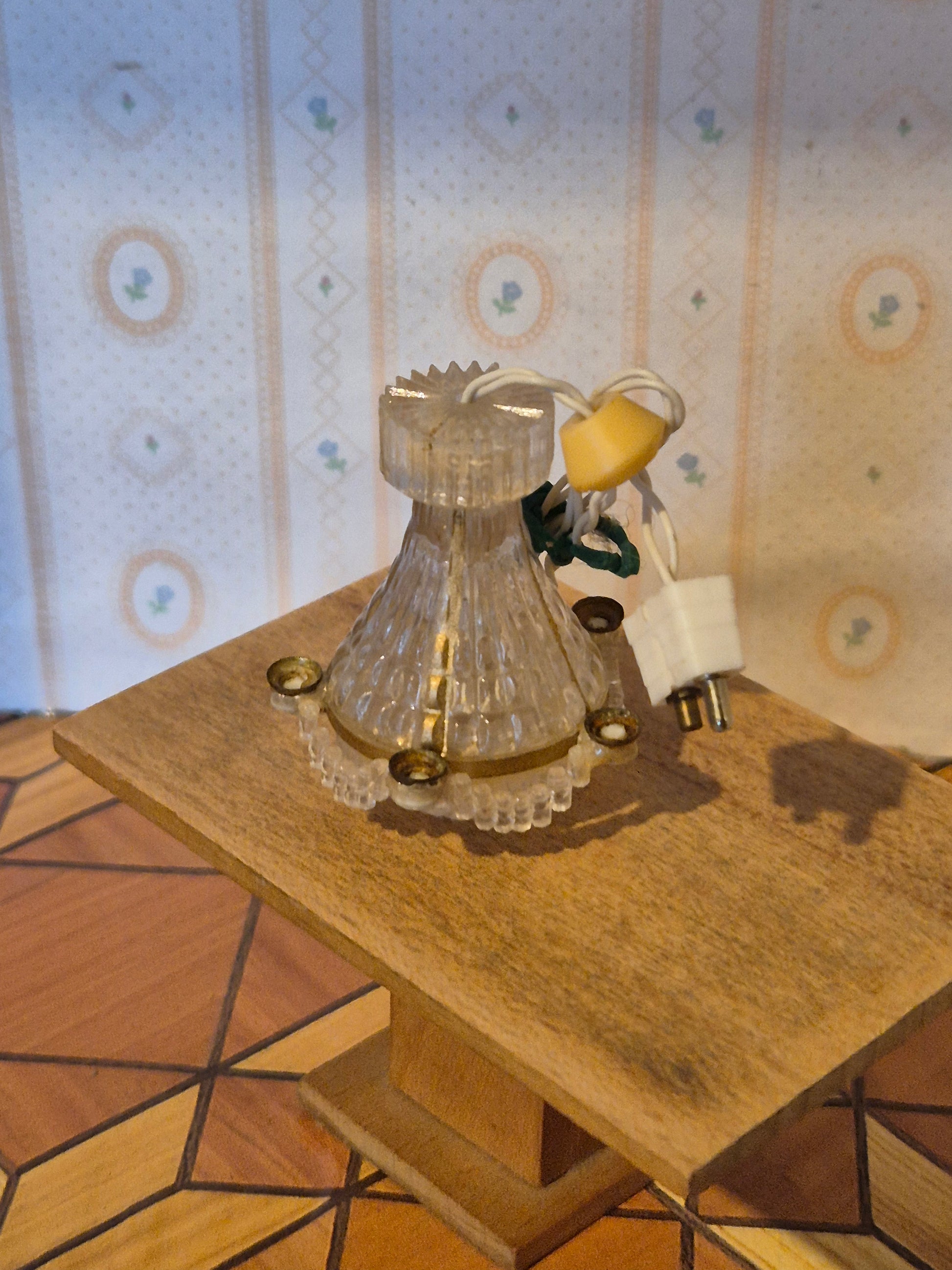 Lundby lampe, lysekrone, hvor de små lyseblå mangler. Den er ikke intakt.