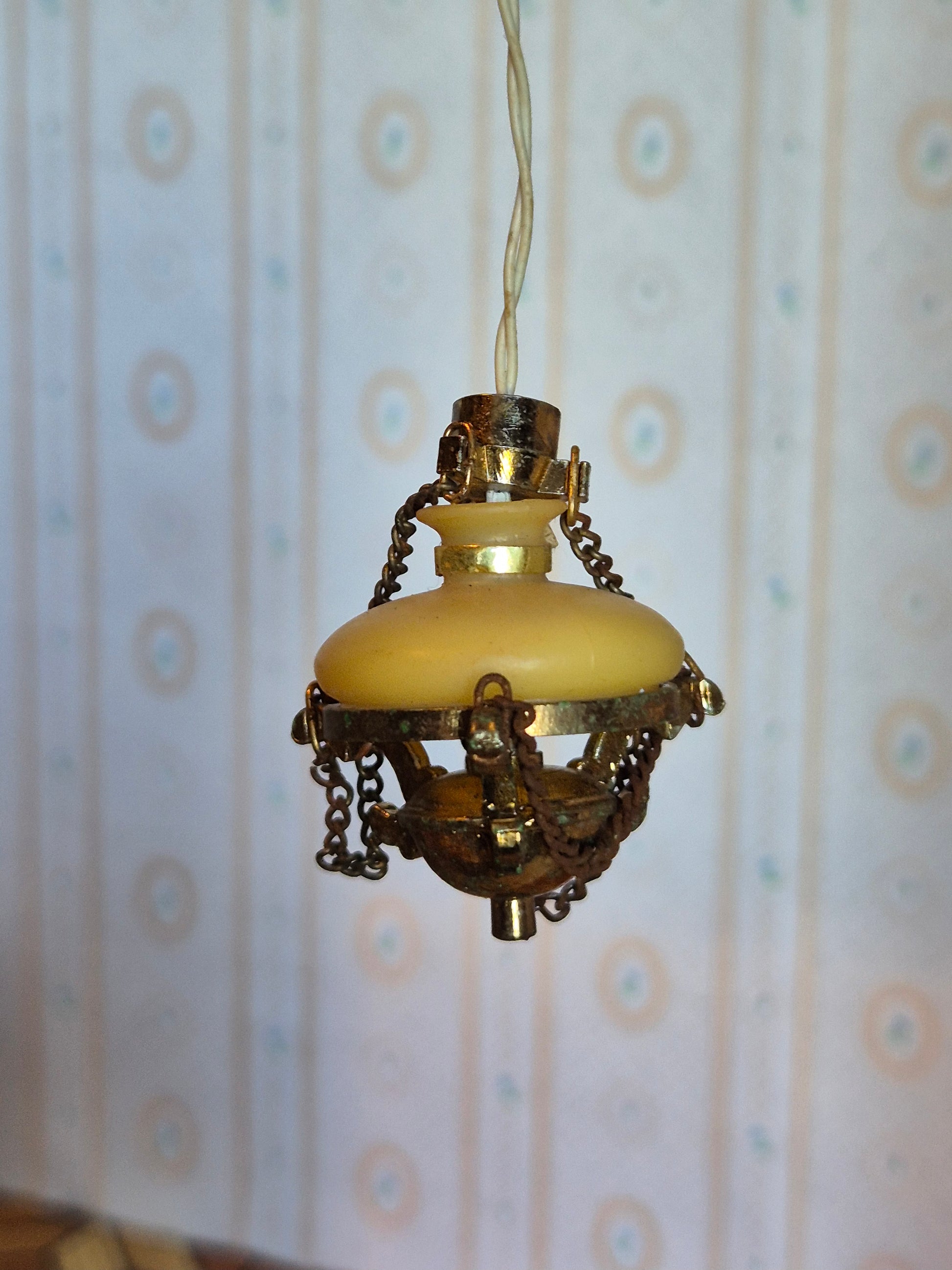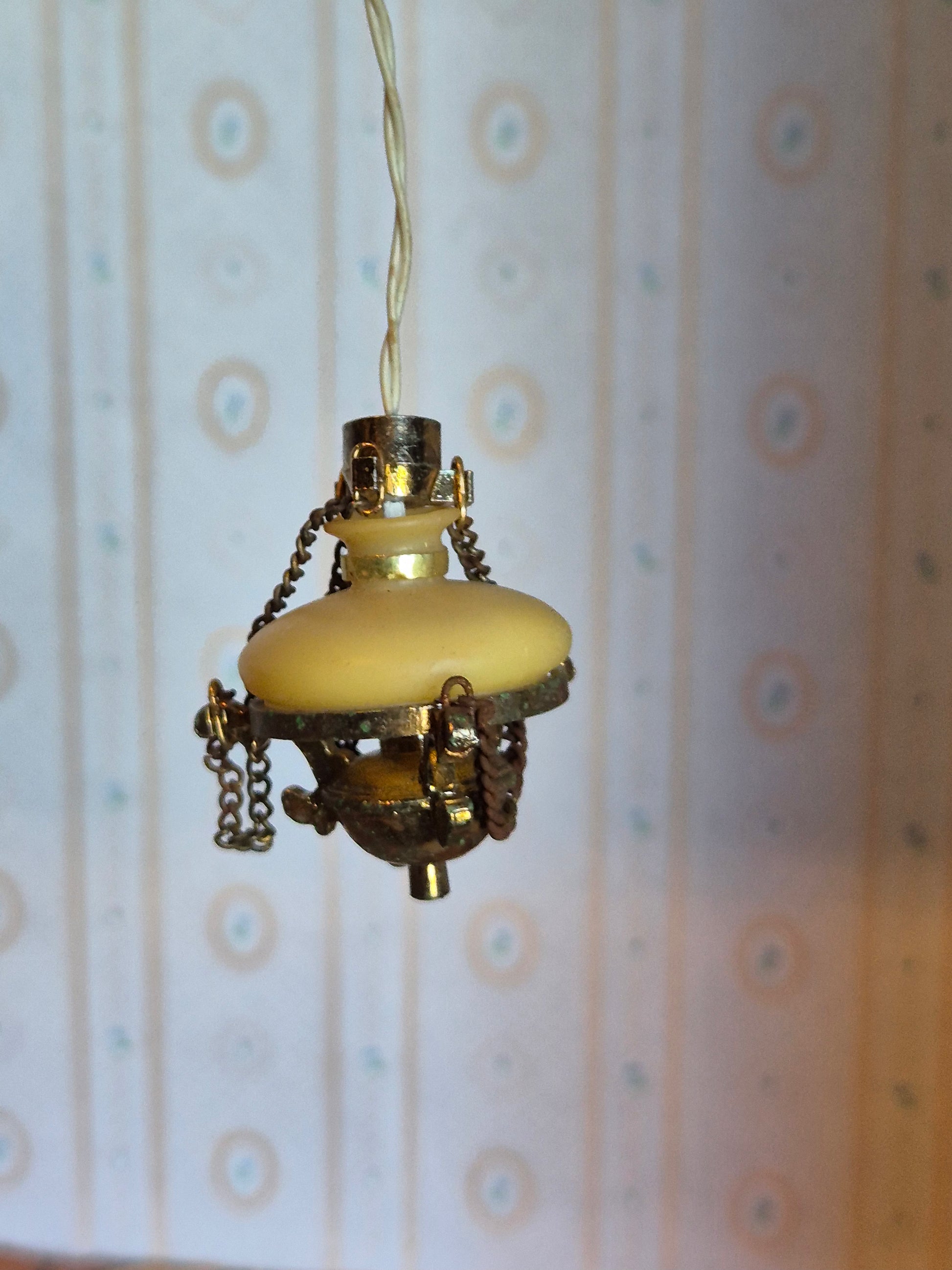 Lundby petroleumslampe til dukkehuset. Benytter 3v strømforsyning. Udmærket stand, dog gullig af patina. Brugsspor og lignende.