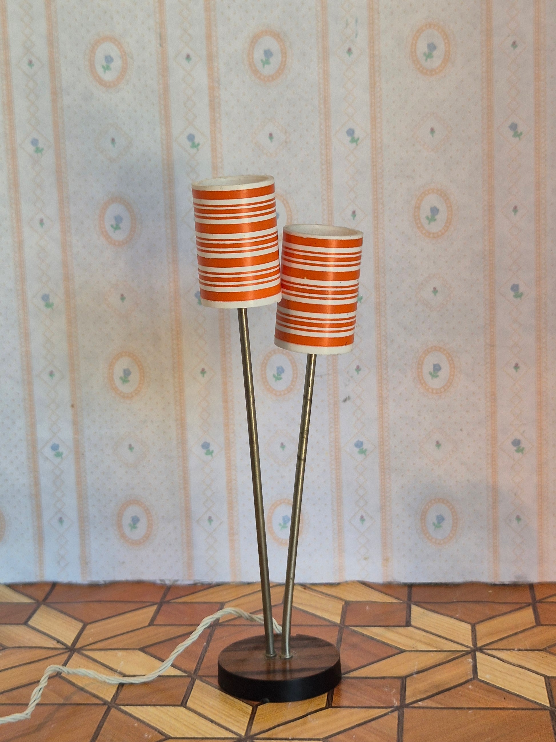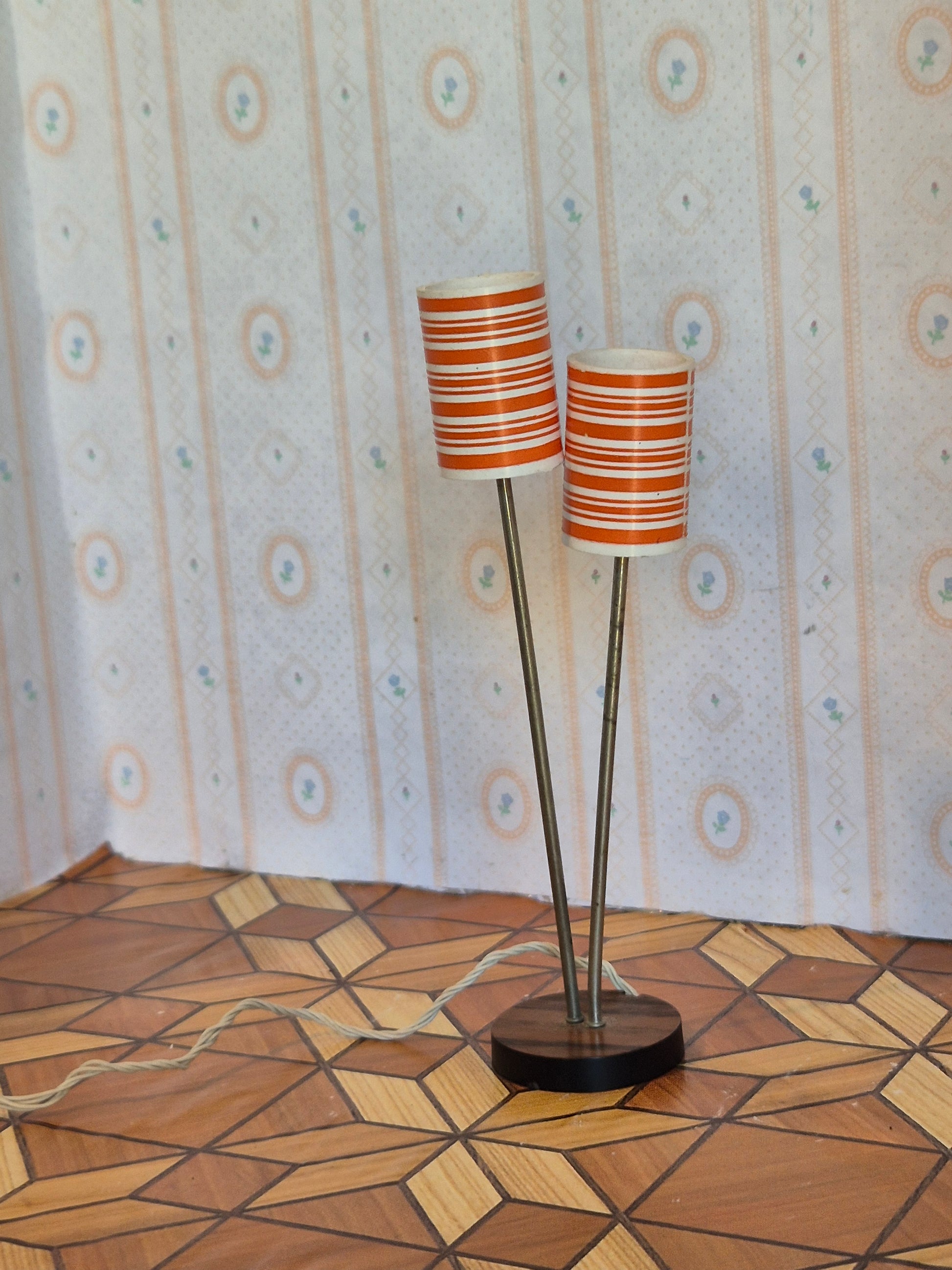Særlig lettere sjælden standerlampe med rød og hvid stribede skærme og metal stel. Rigtig pæn og fin.