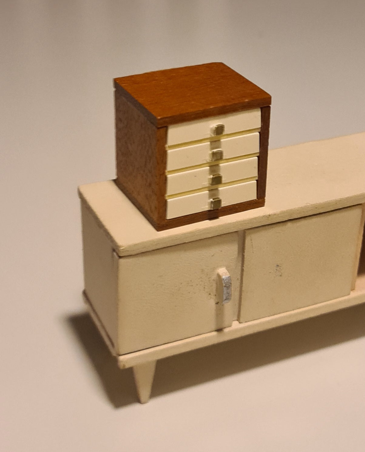 LIDO skuffe-kabinet af træ med 4 smalle hvide skuffer. Et udsøgt dukkehusmøbel. De er forholdsvis sjældne og svære at få fat på.