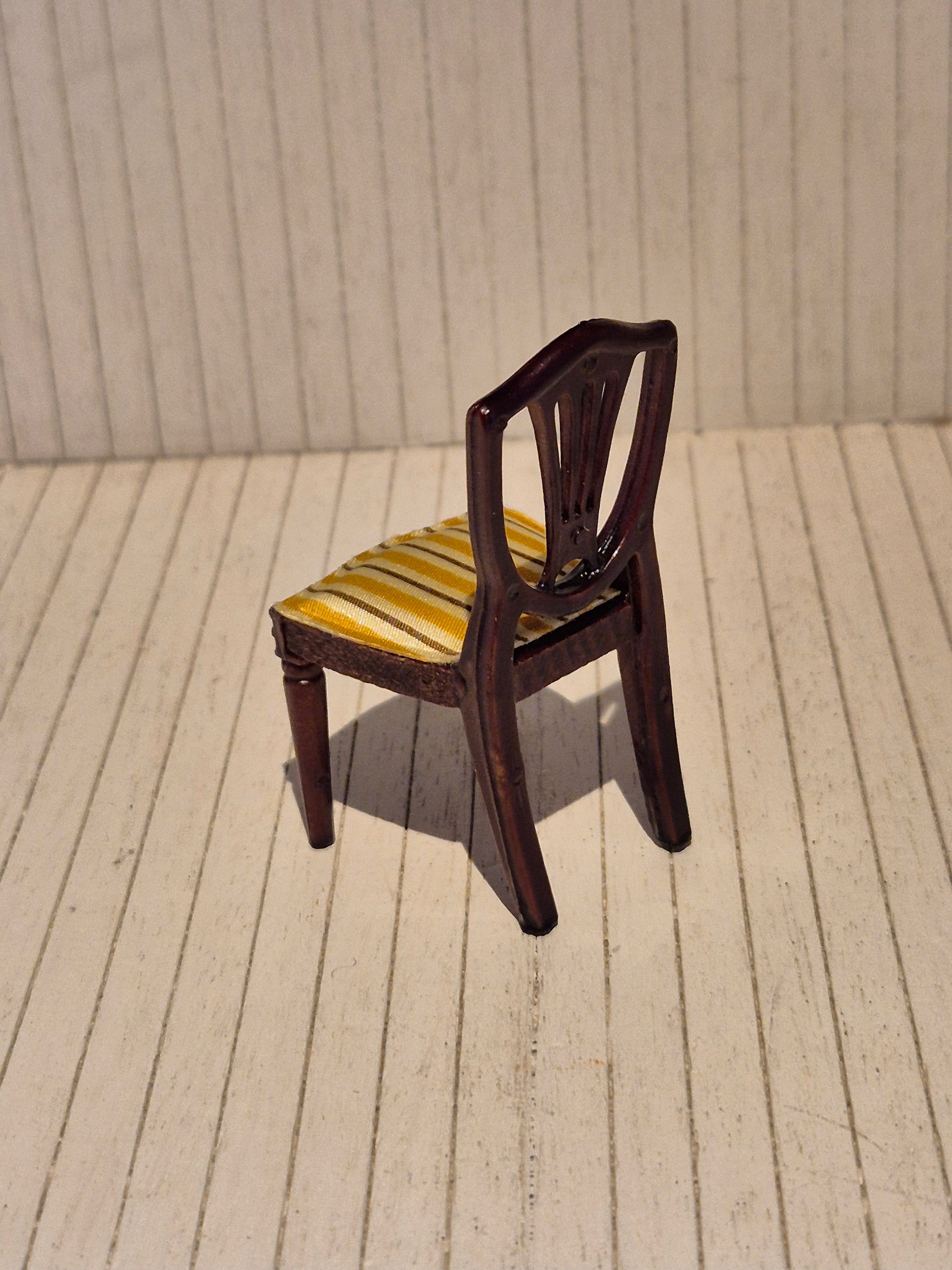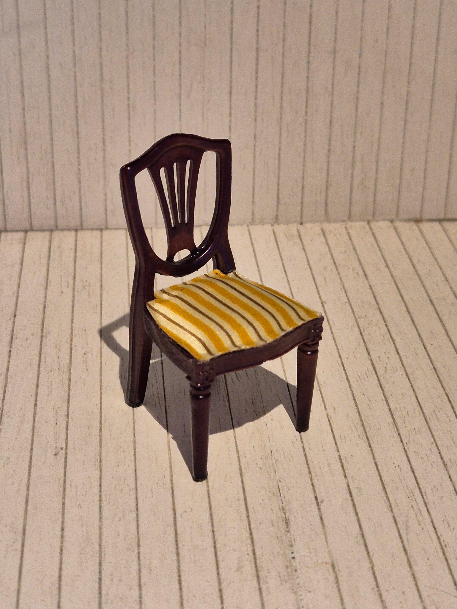Pænt mørkt stol i træ med gyldent striber sædebetræk, der hører til klassiske serie, Lundby mørk royal.