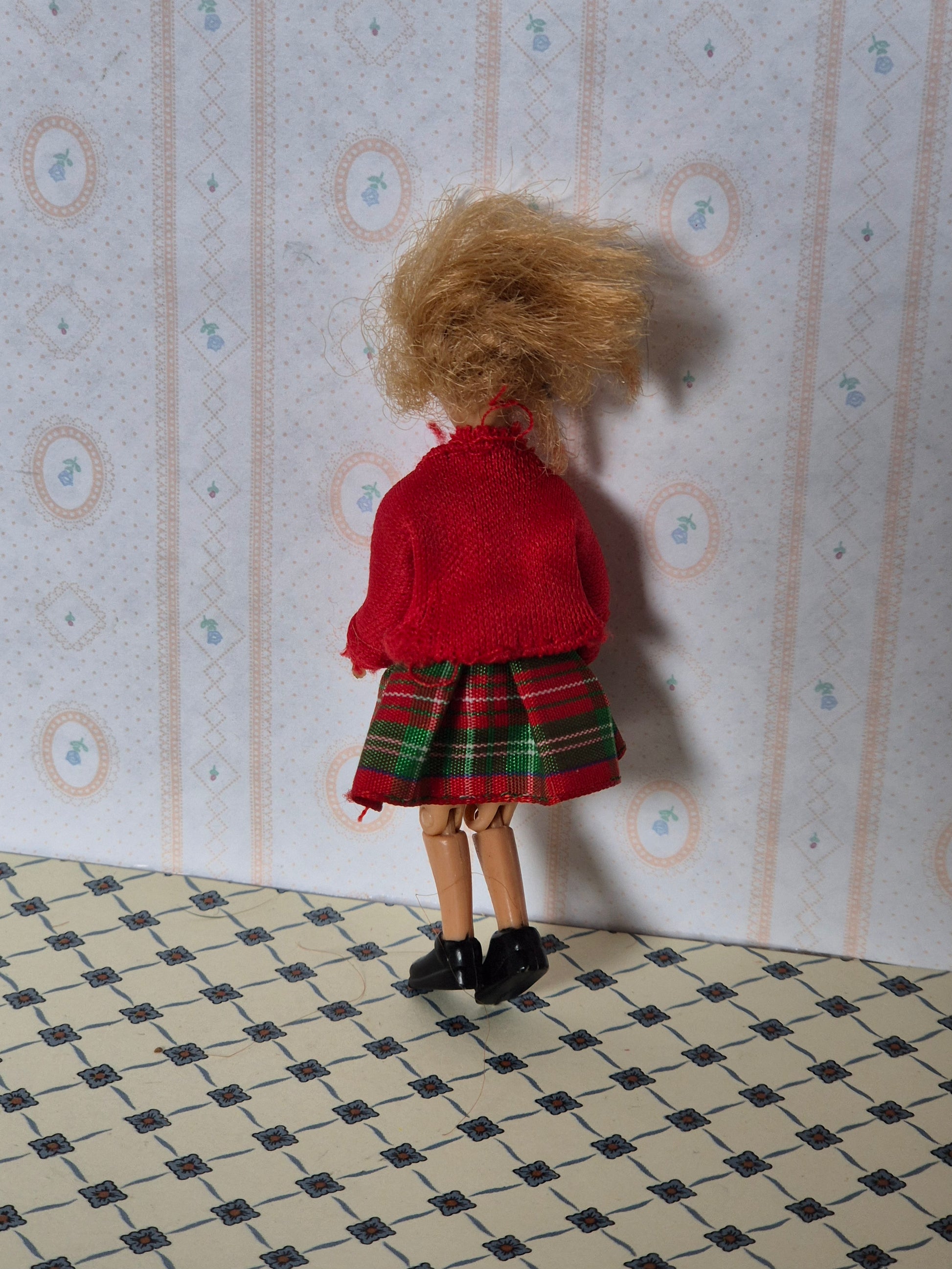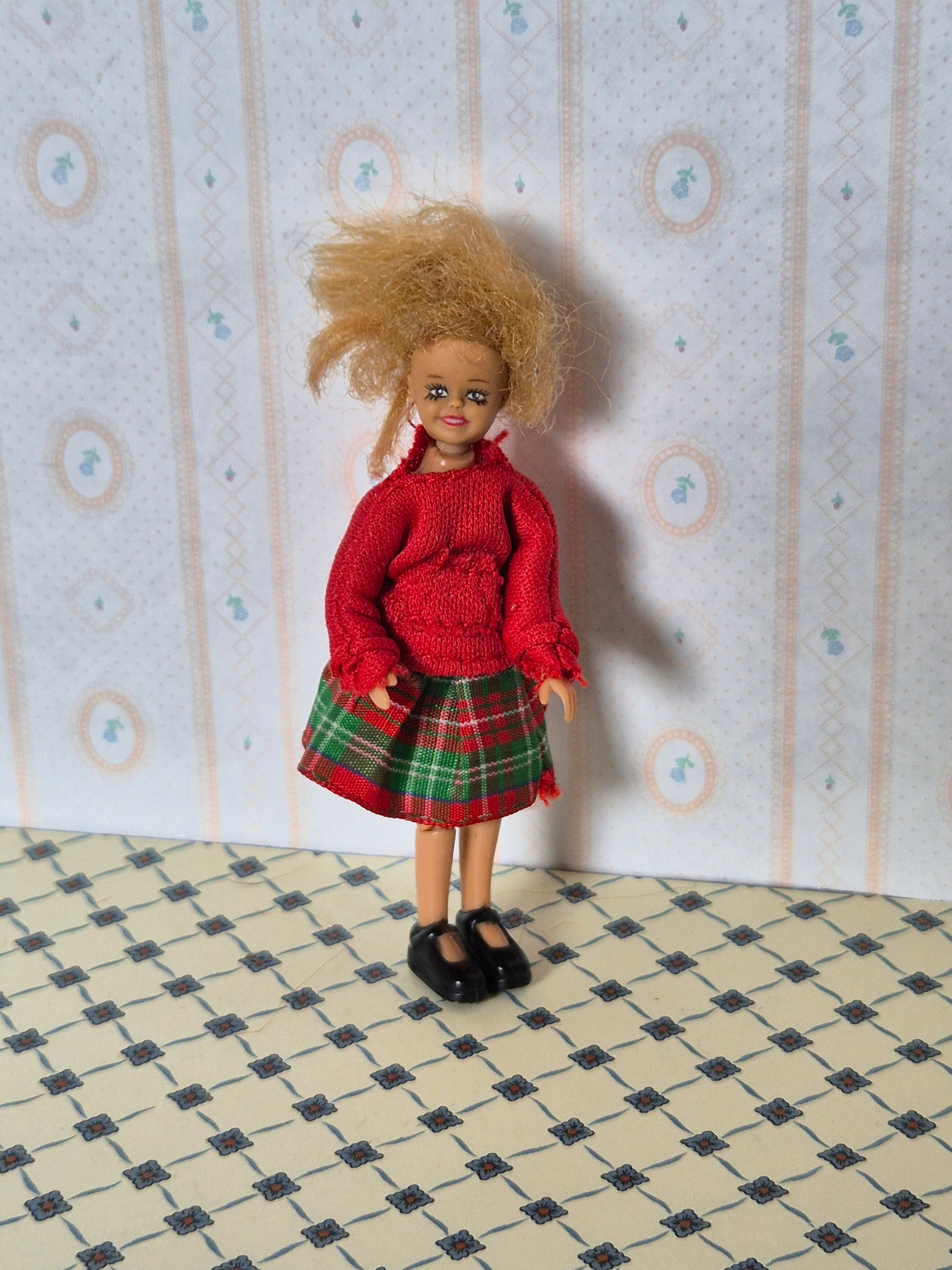 Sød Lundby pige i originalt tøj. Udmærket stand. Fin dog med brugsspor og patina.