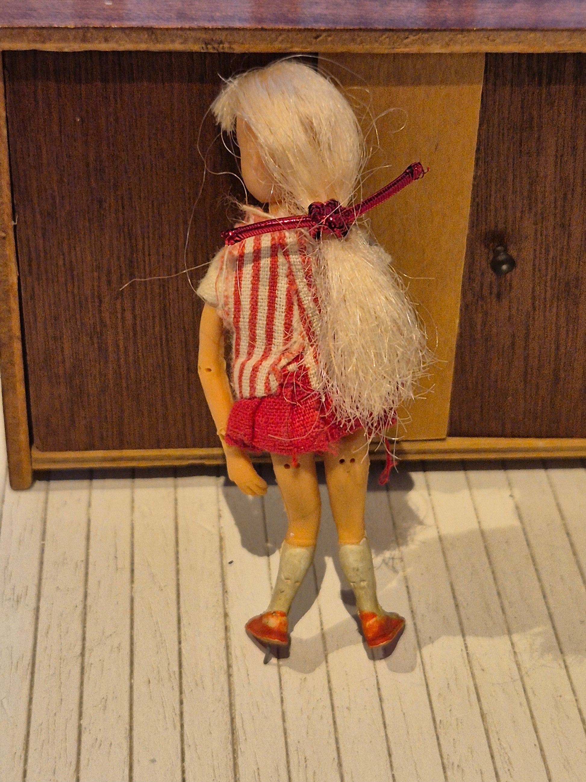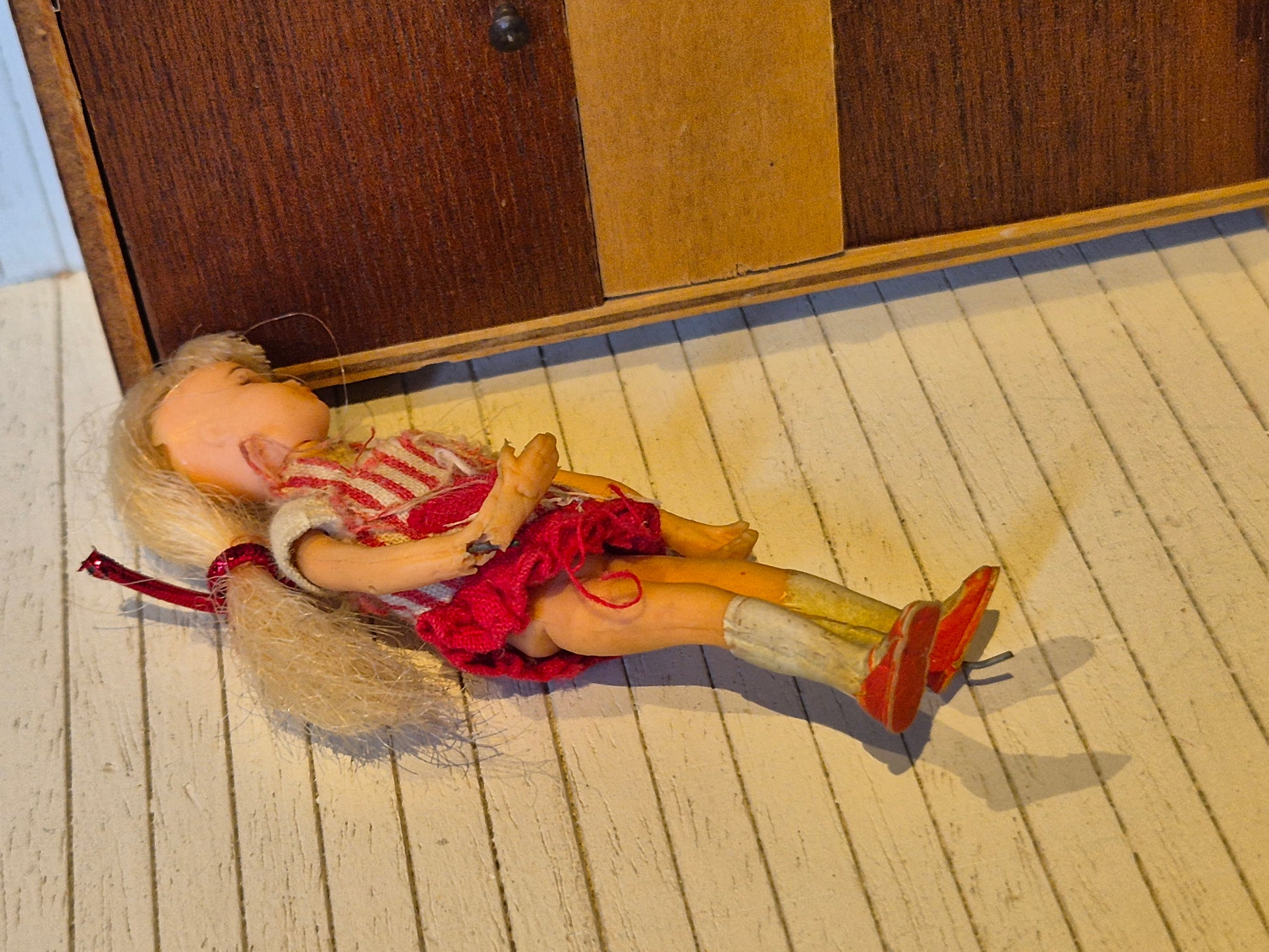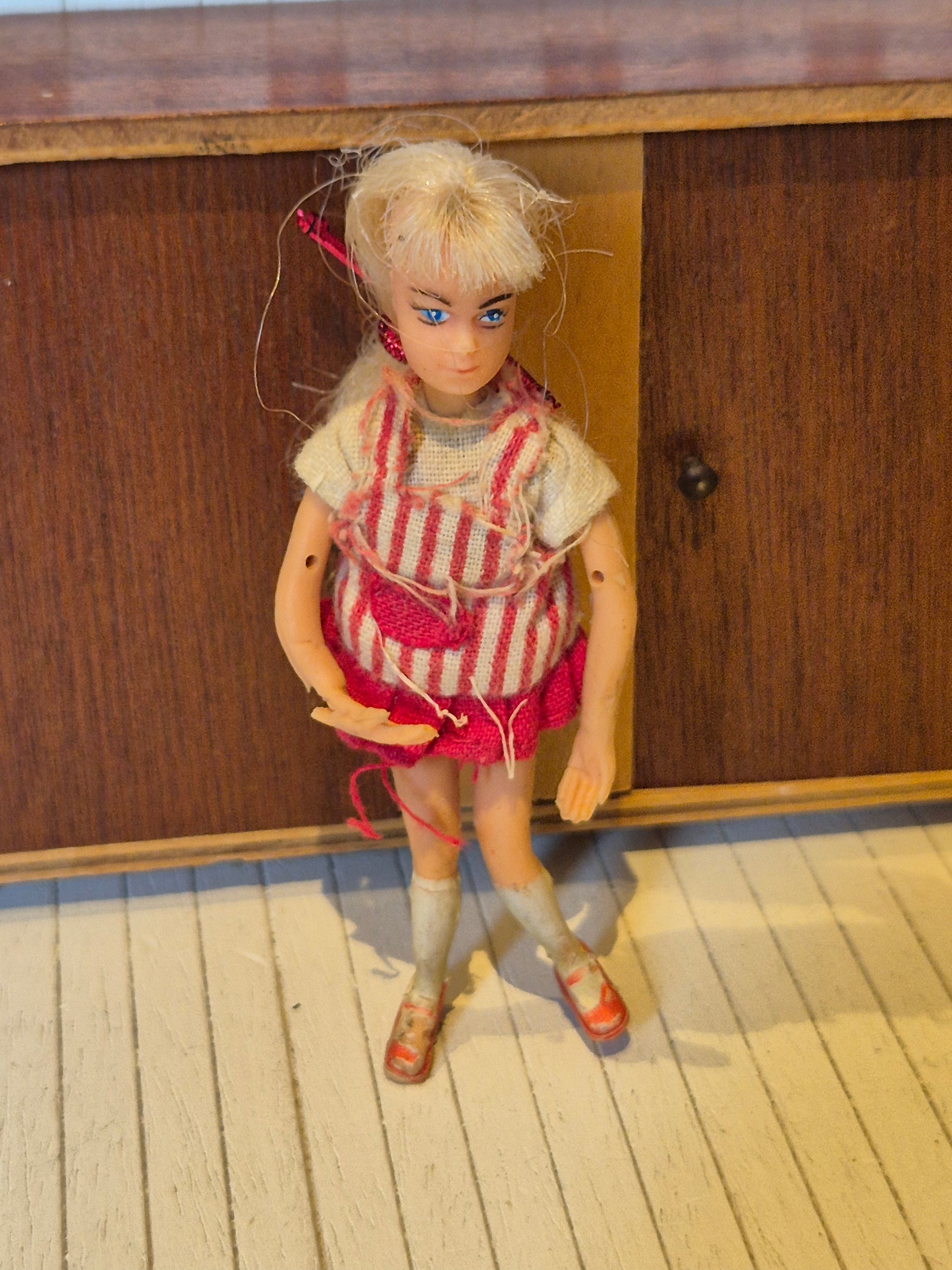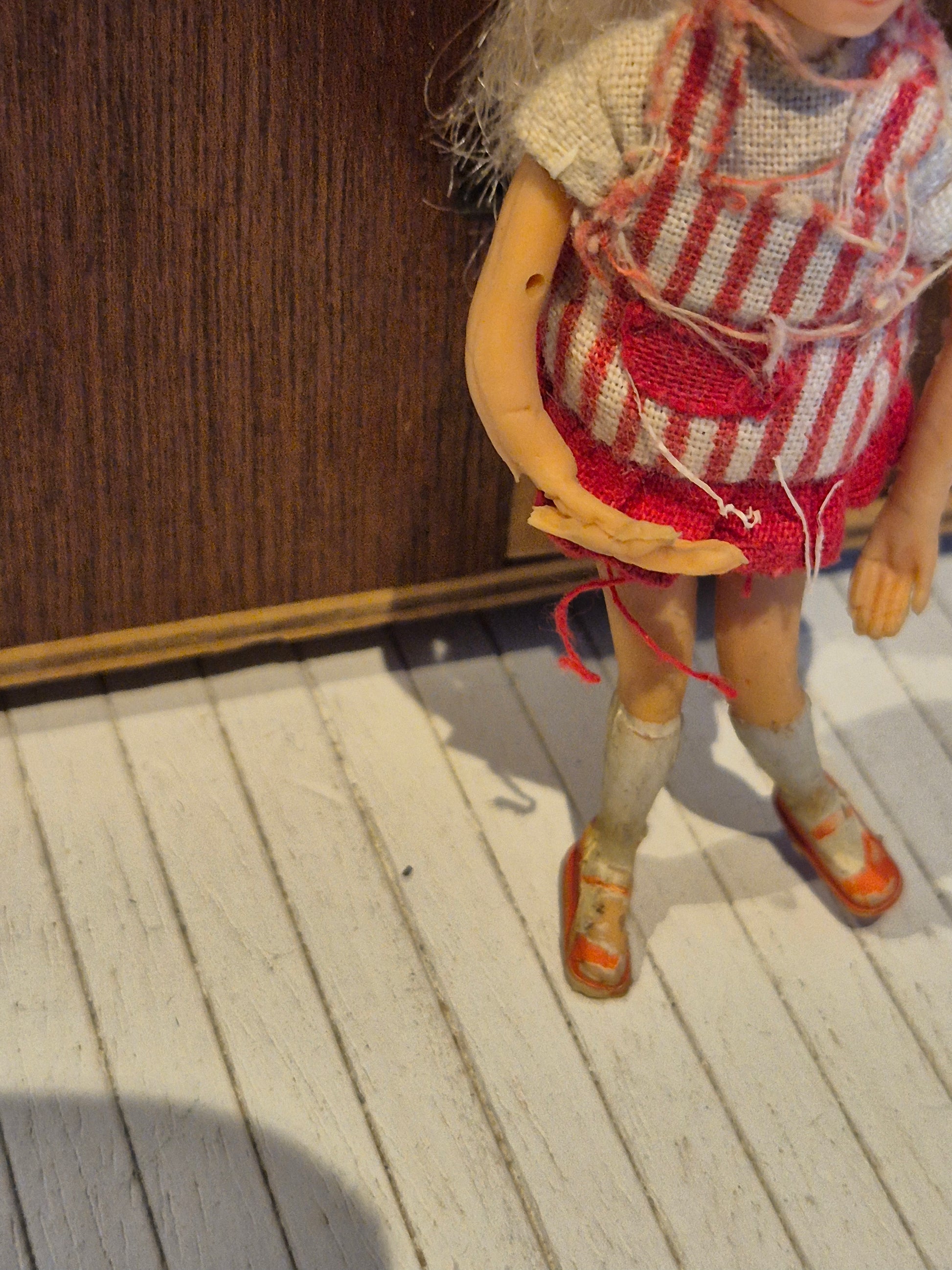 Sød pige dukke fra starten af 1970erne. Den er af gummi. Den er godt brugt og slidt, en del patina, som tydeligt kan ses, særligt på hånd og arm.