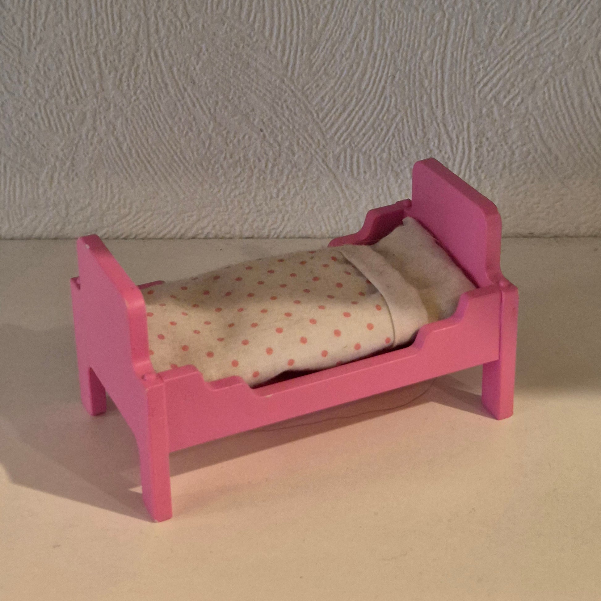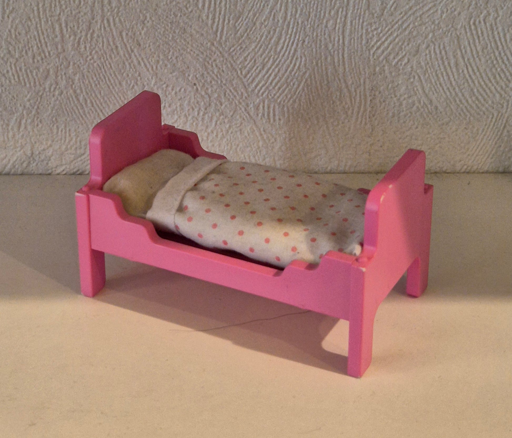 Pink træ seng til dukkehuset, del af køjeseng til lundby børneværelset med sengetøj/madras.