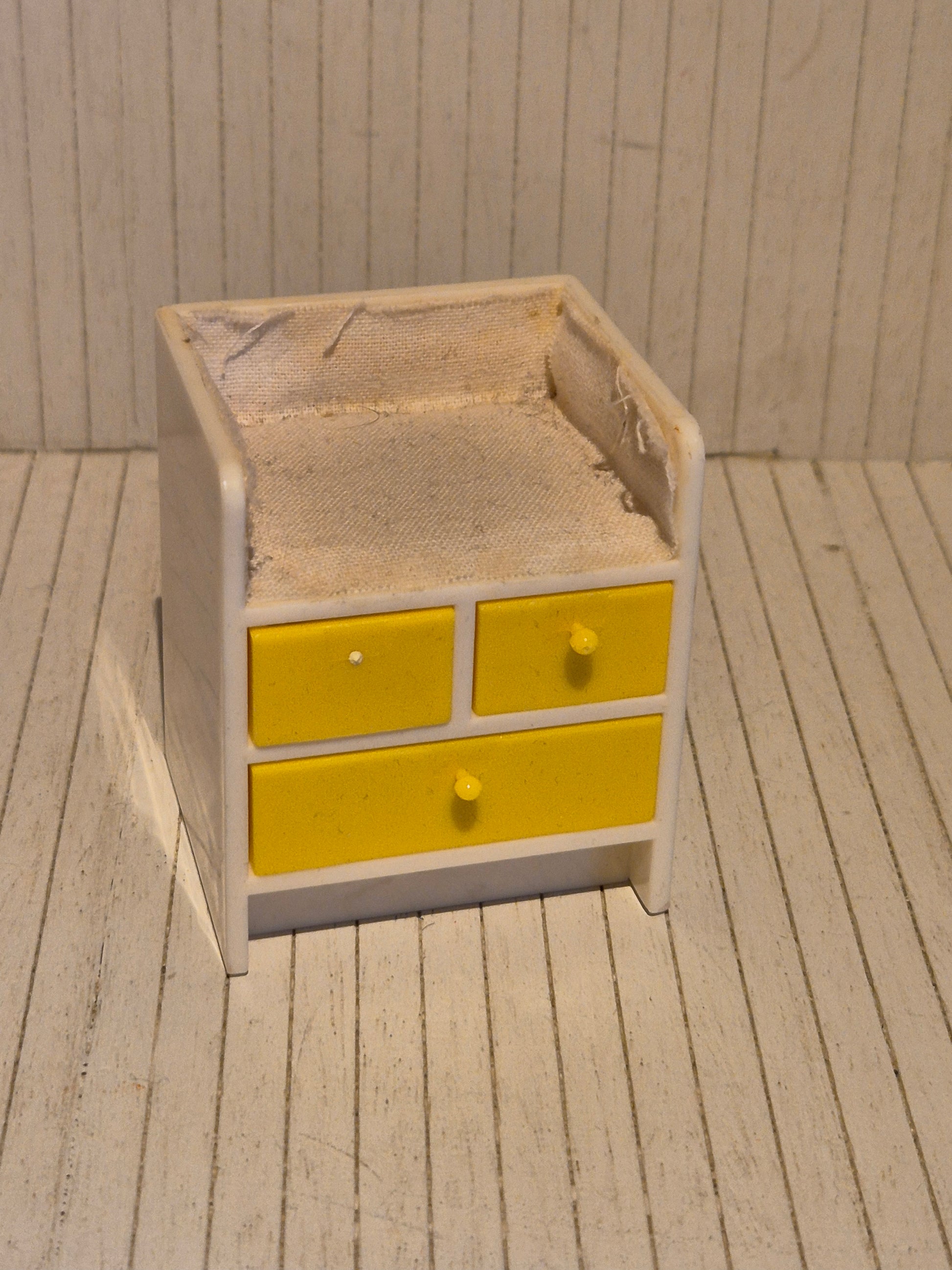 Lundby puslebord med gule skuffer til dukkehuset. Det er af hård plast. Puslepuden er hvid og temmelig nusset, efter brug. Der er brugsspor og patina. Der er knækket et greb af den ene skuffe.