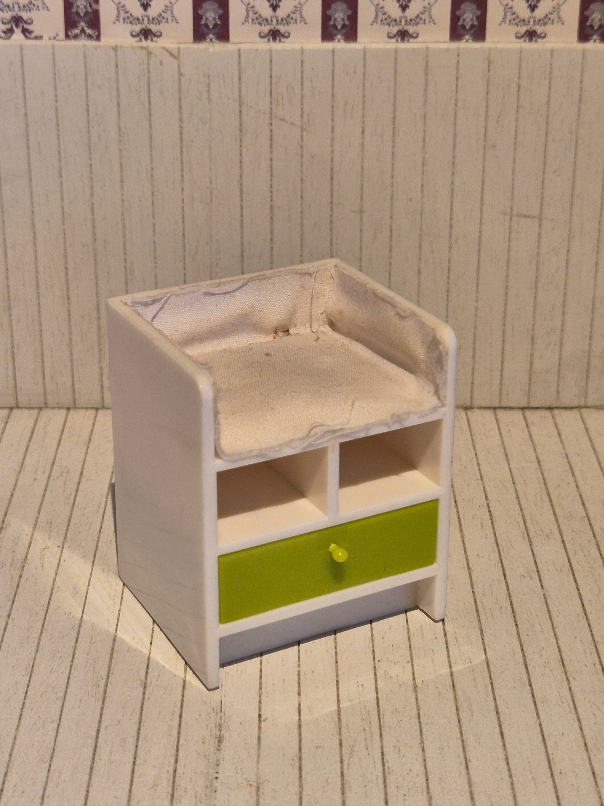 Lundby puslebord til dukkehuset, hvidt med grøn skuffe. Det er af hård plast. Puslepuden er stribet hvid og temmelig nusset. Der er patina og brugsspor. Der mangler 2 skuffer.