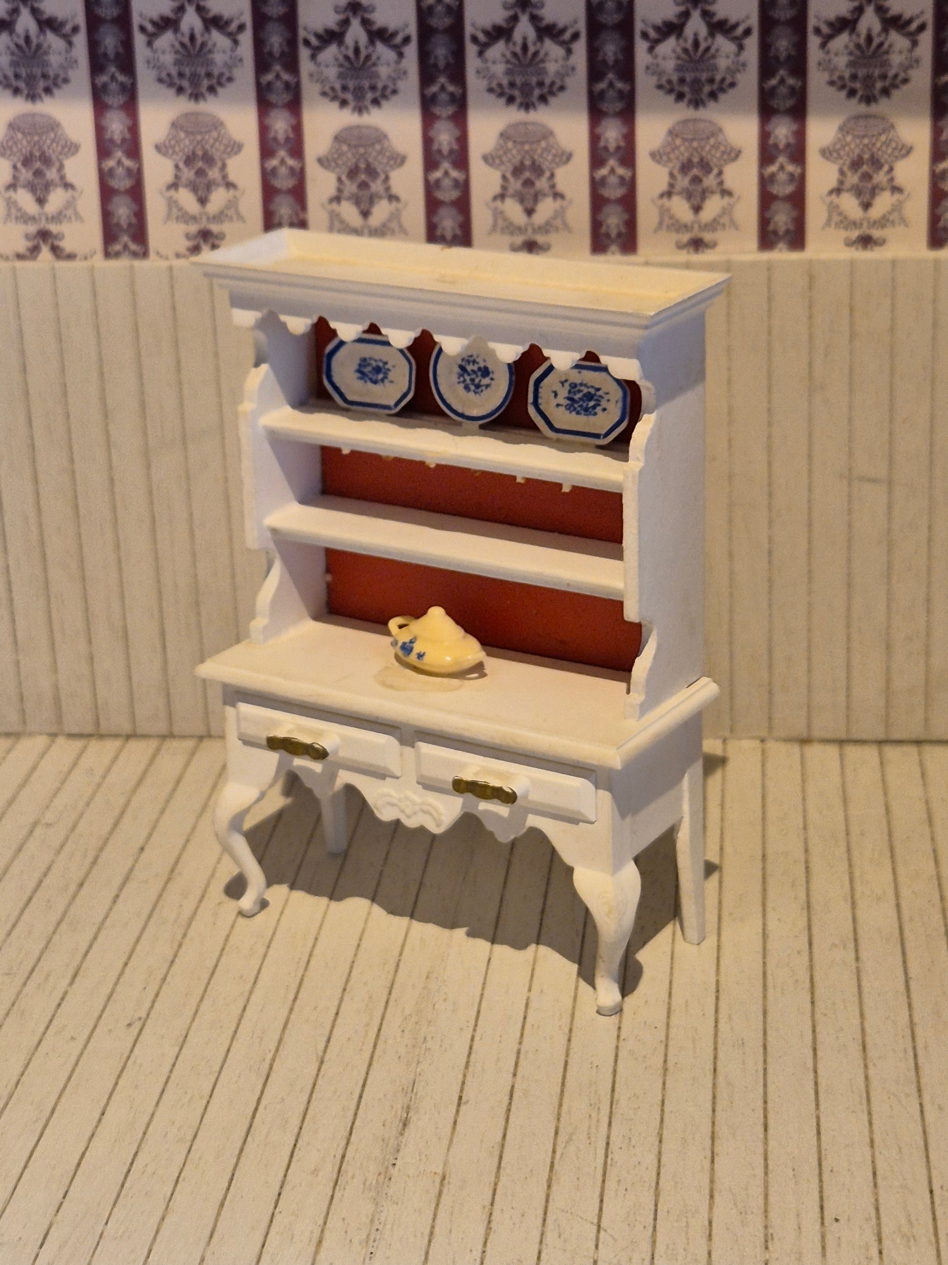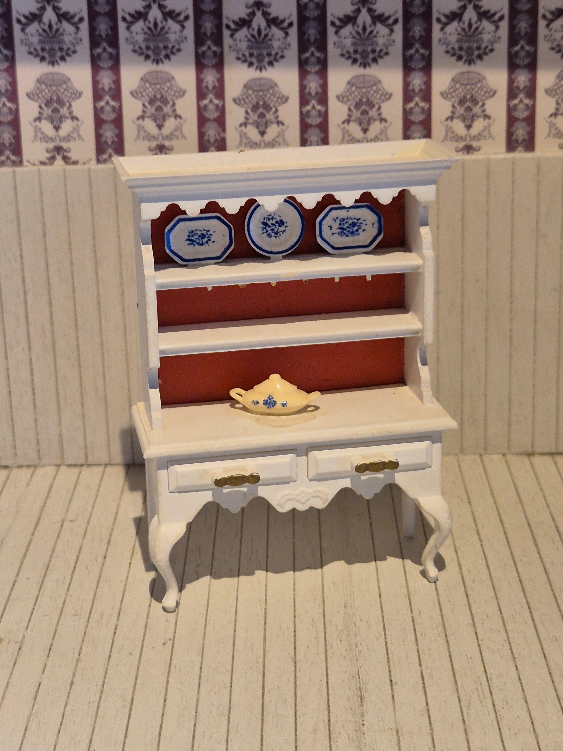 Lundby kabinet eller vitrine, hvid plast med rød baggrund. Det har mangler, alle kopperne mangler. Det har patina og brugsspor.