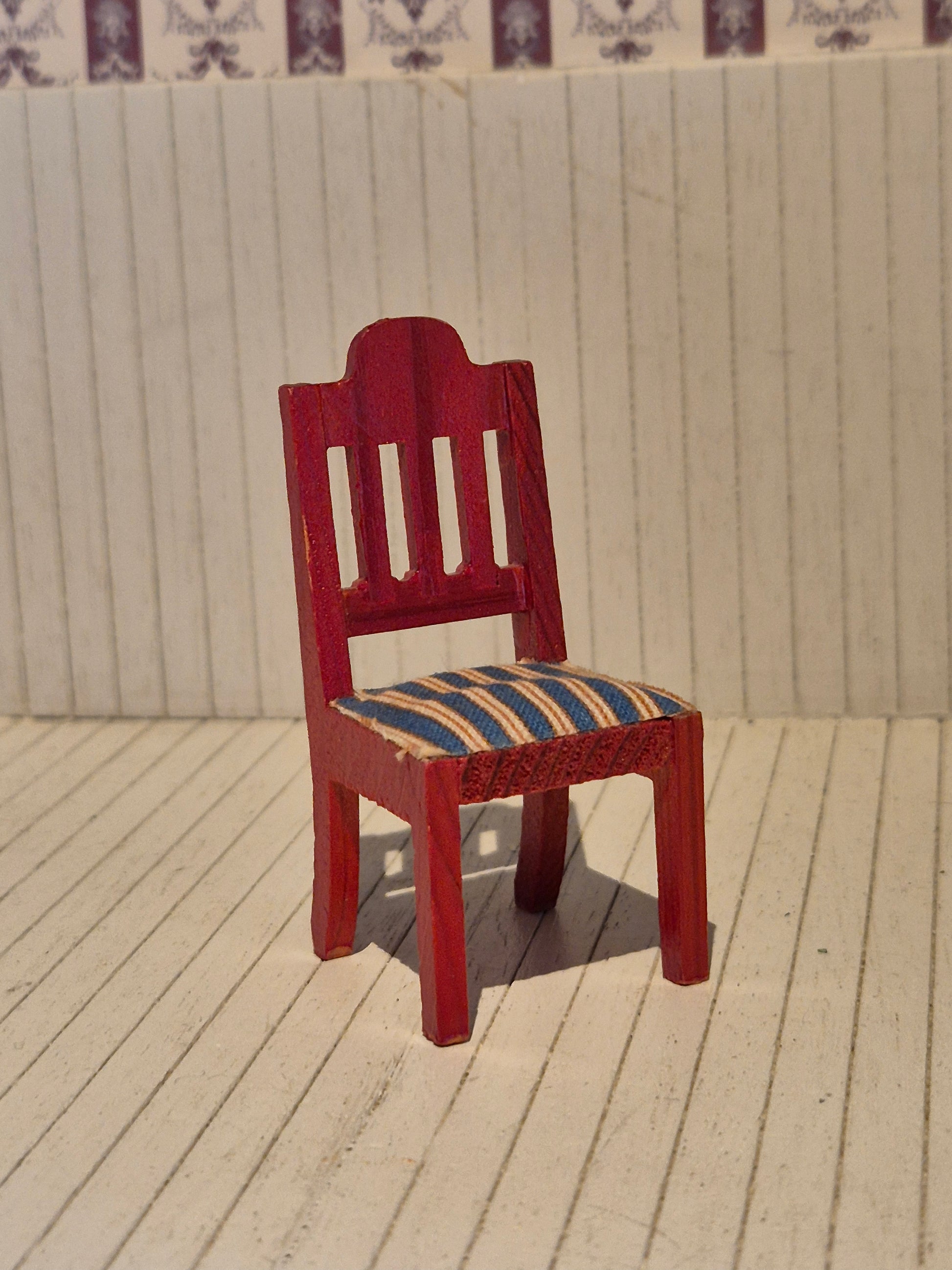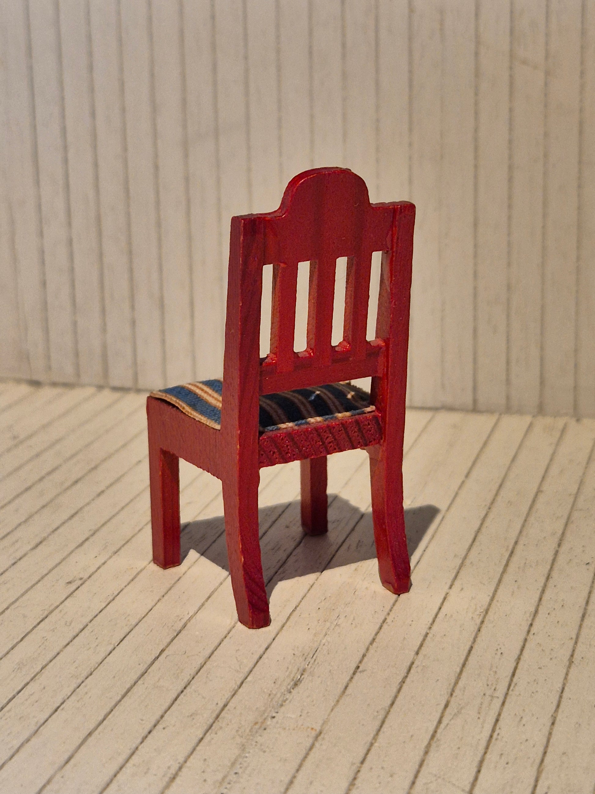 Stolen er af rødt træ med blåt og gyldent stribet sædebetræk. Udmærket / pæn stand. Den er ældre, men fin. God spisebordsstol.