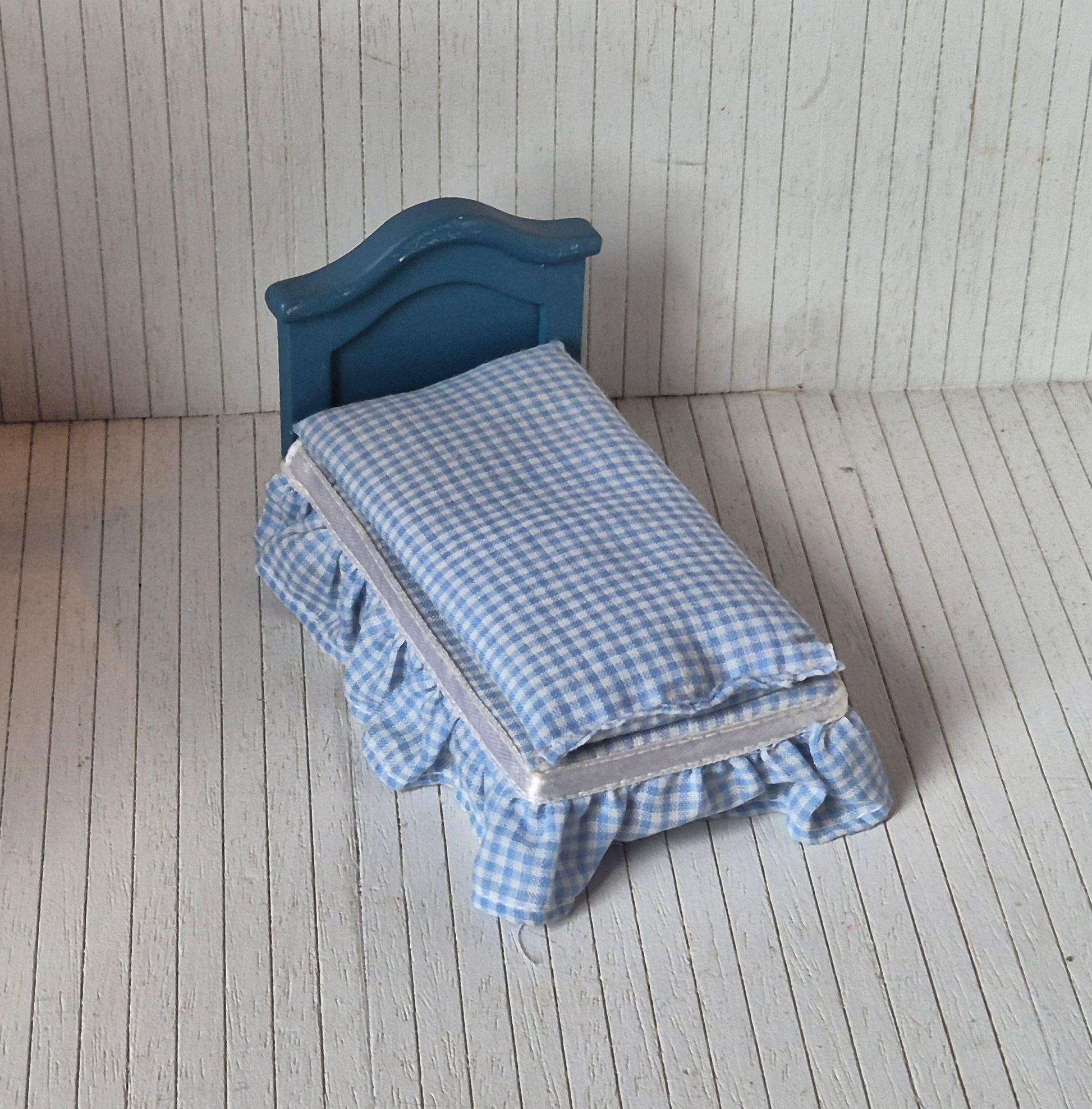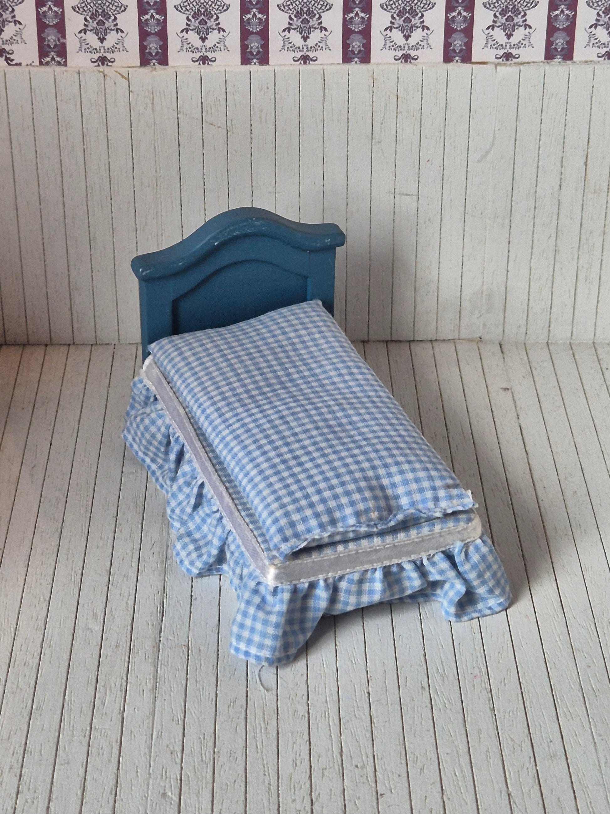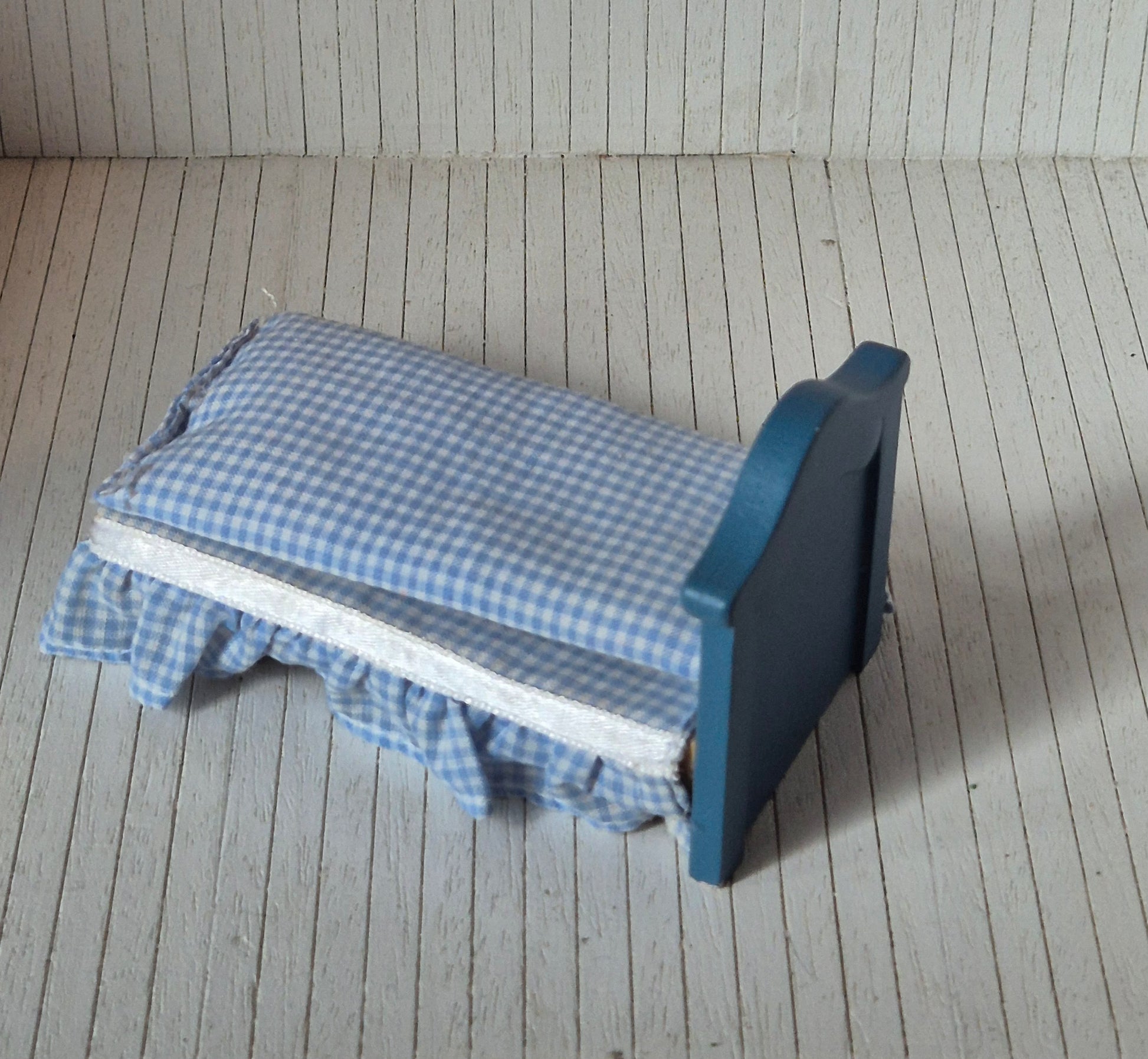 Pæn og fin lundby seng, lyseblå med dyne. Idyllisk stil. Ældre seng. En hovedpude mangler
