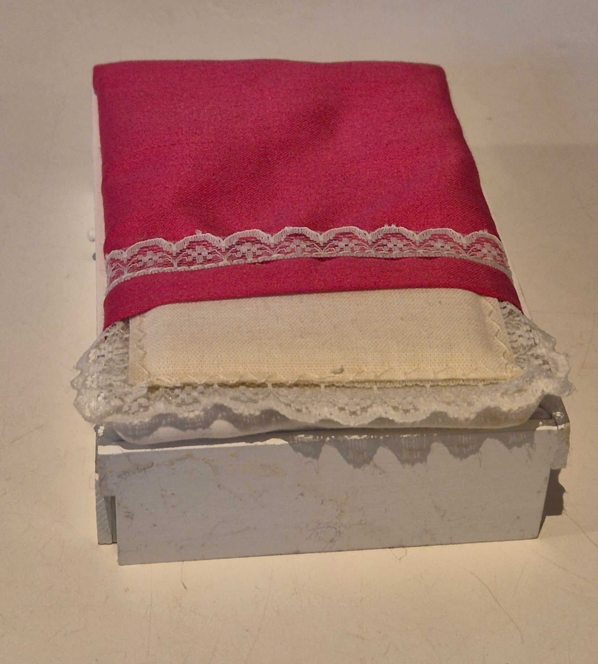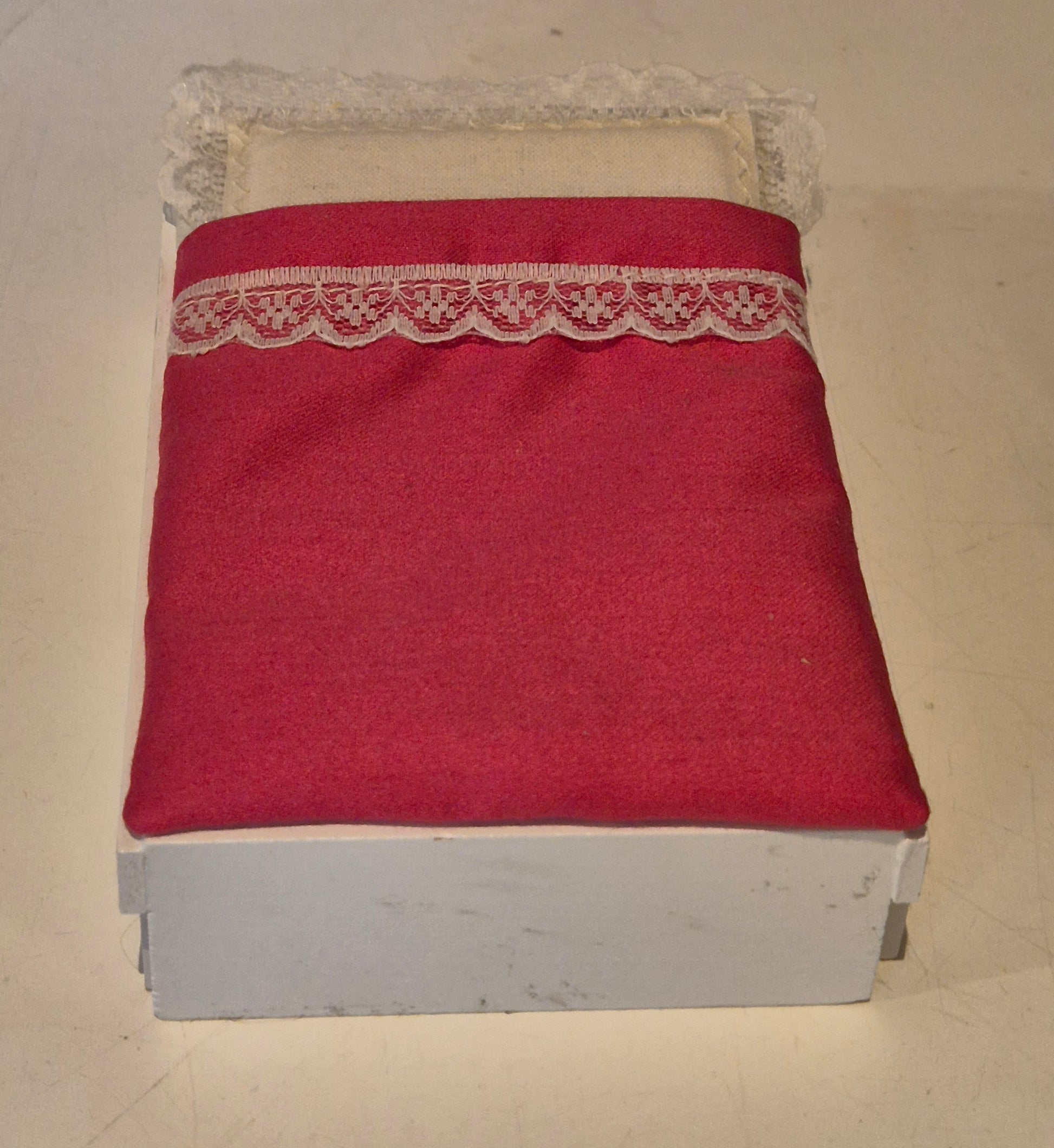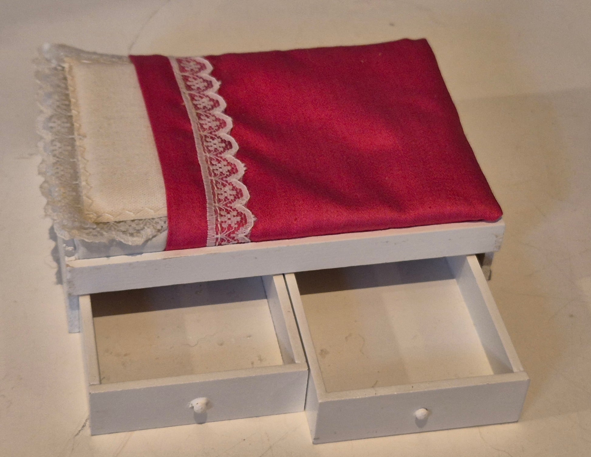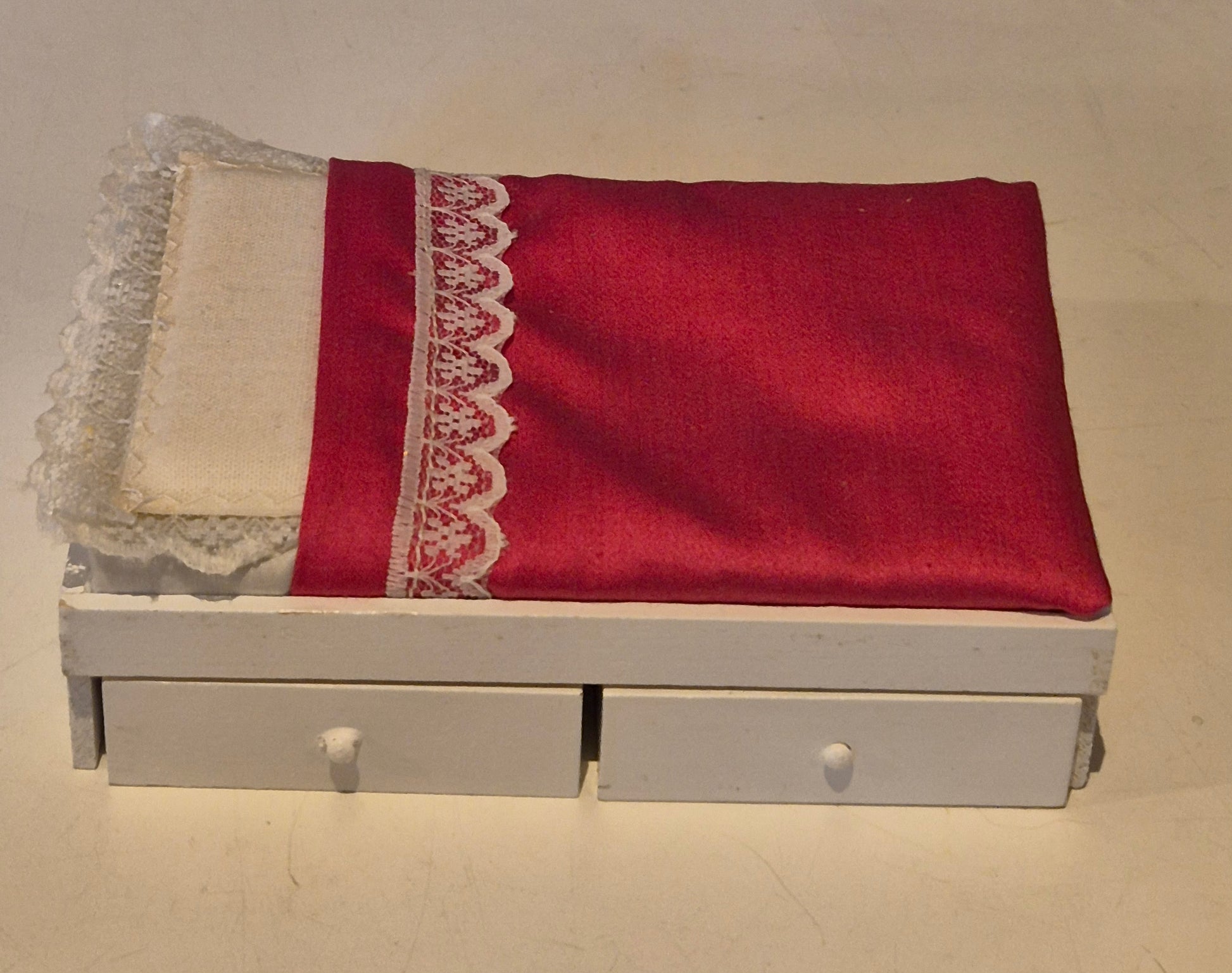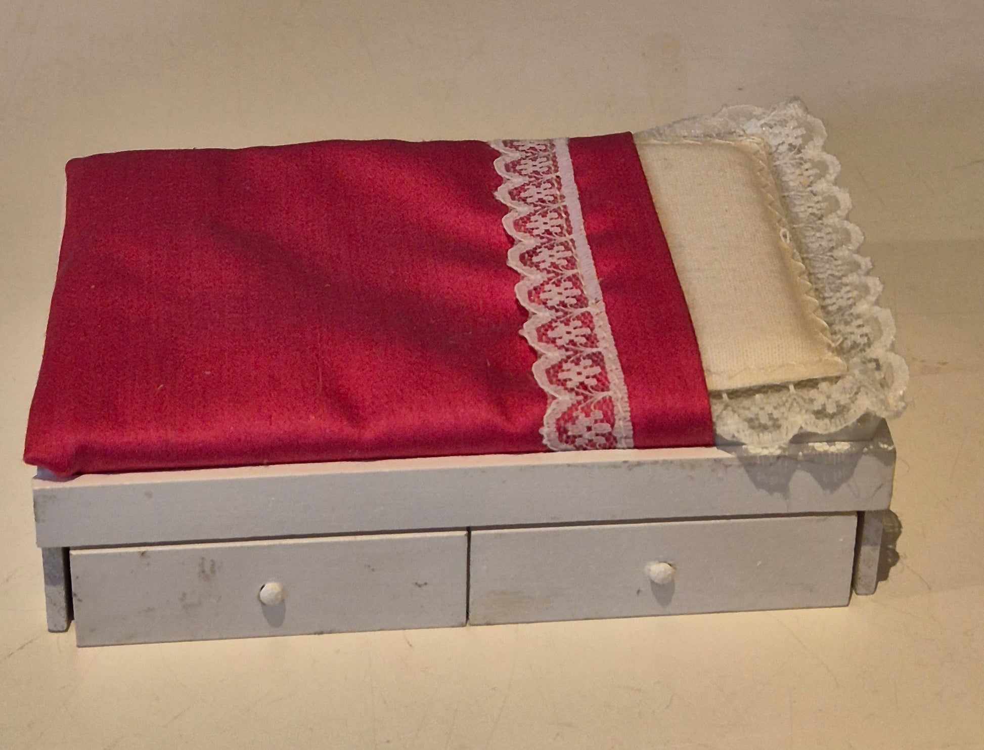Fin lundby seng med udtræks skuffer. Den er original med sengelinned. Udmærket stand. Er pæn, dog er der patina, brugsspor og nogle pletter.