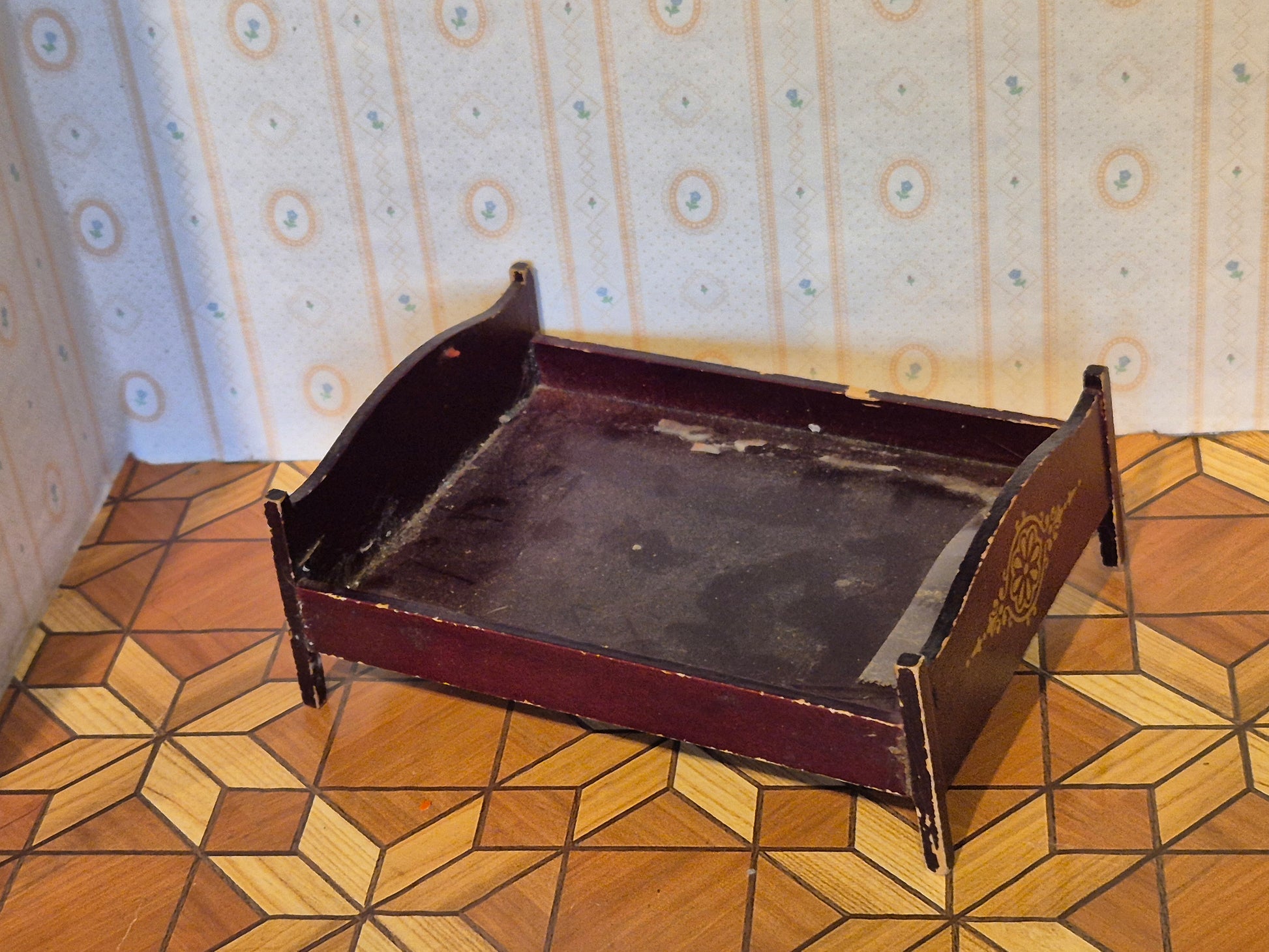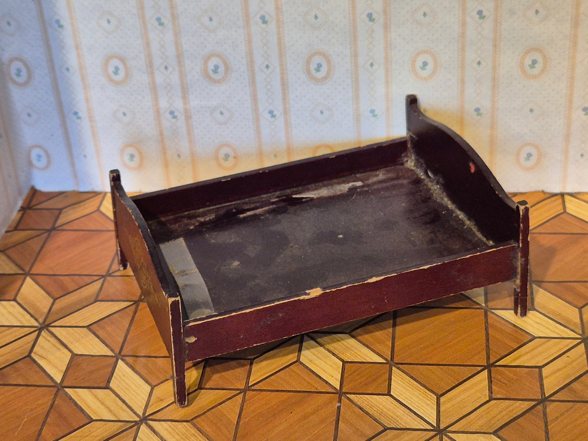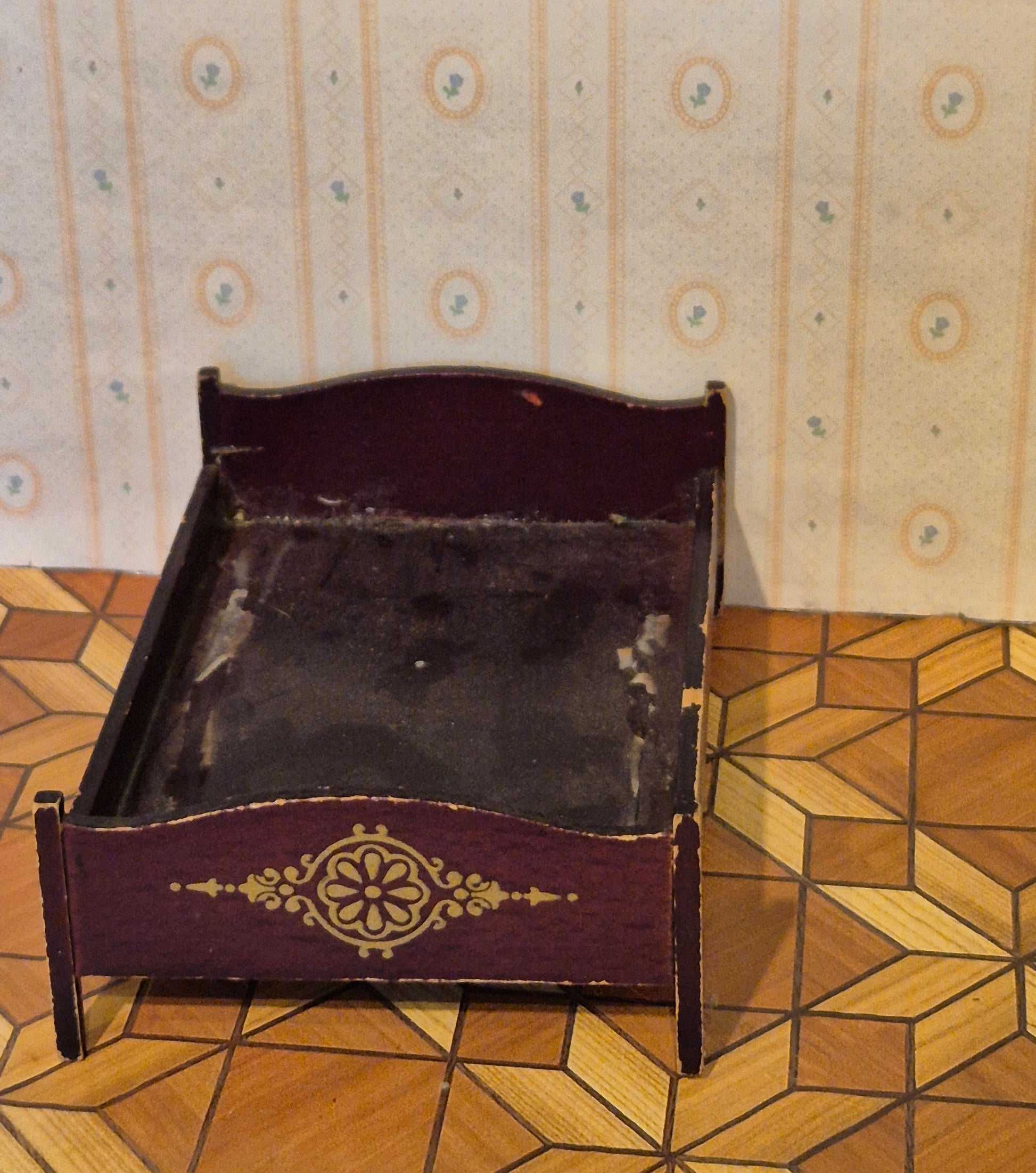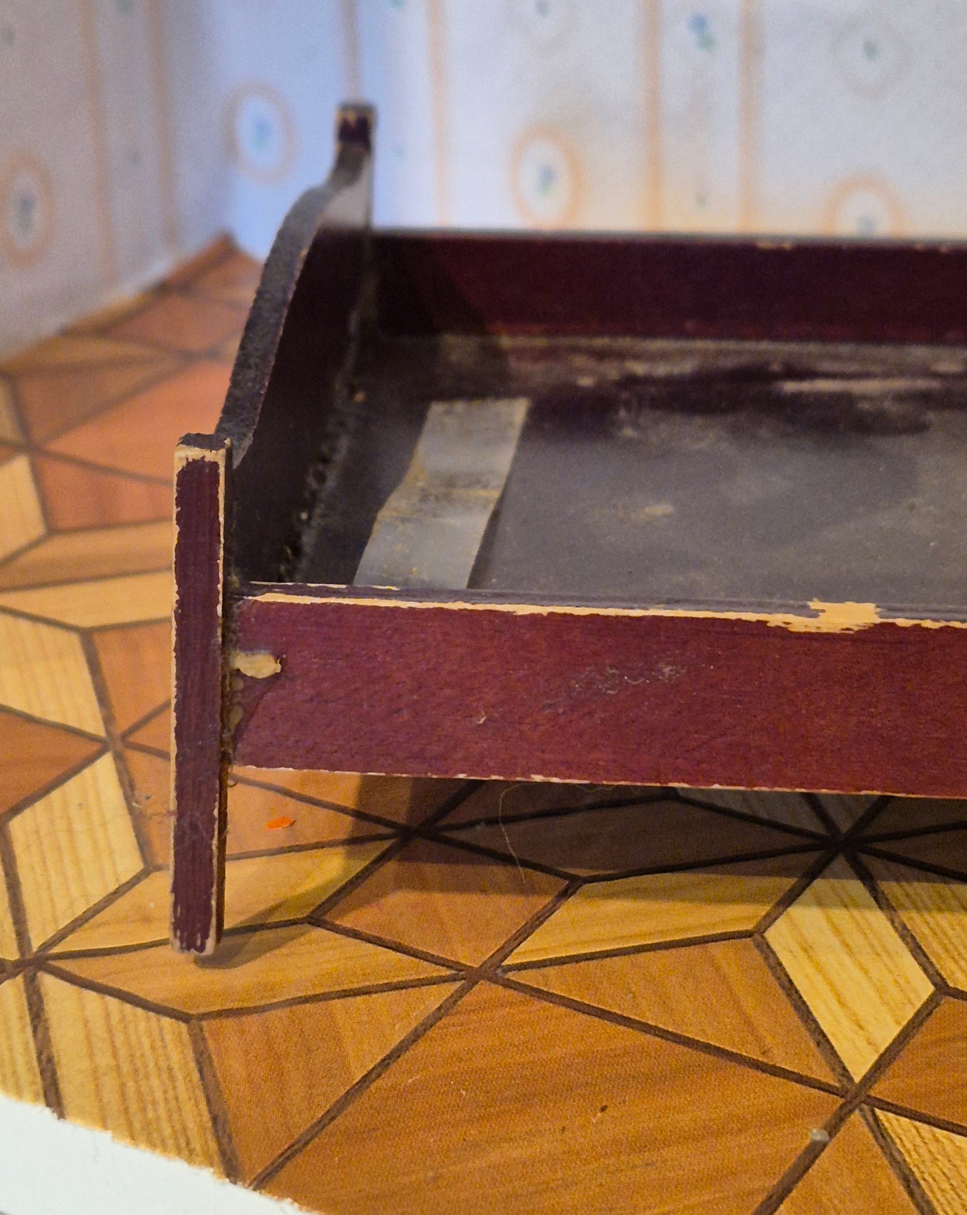 Mørk klassisk seng i mørkebrunt træ. Den er godt brugt med patina og den vipper lidt, da det ene ben sidder skævt.