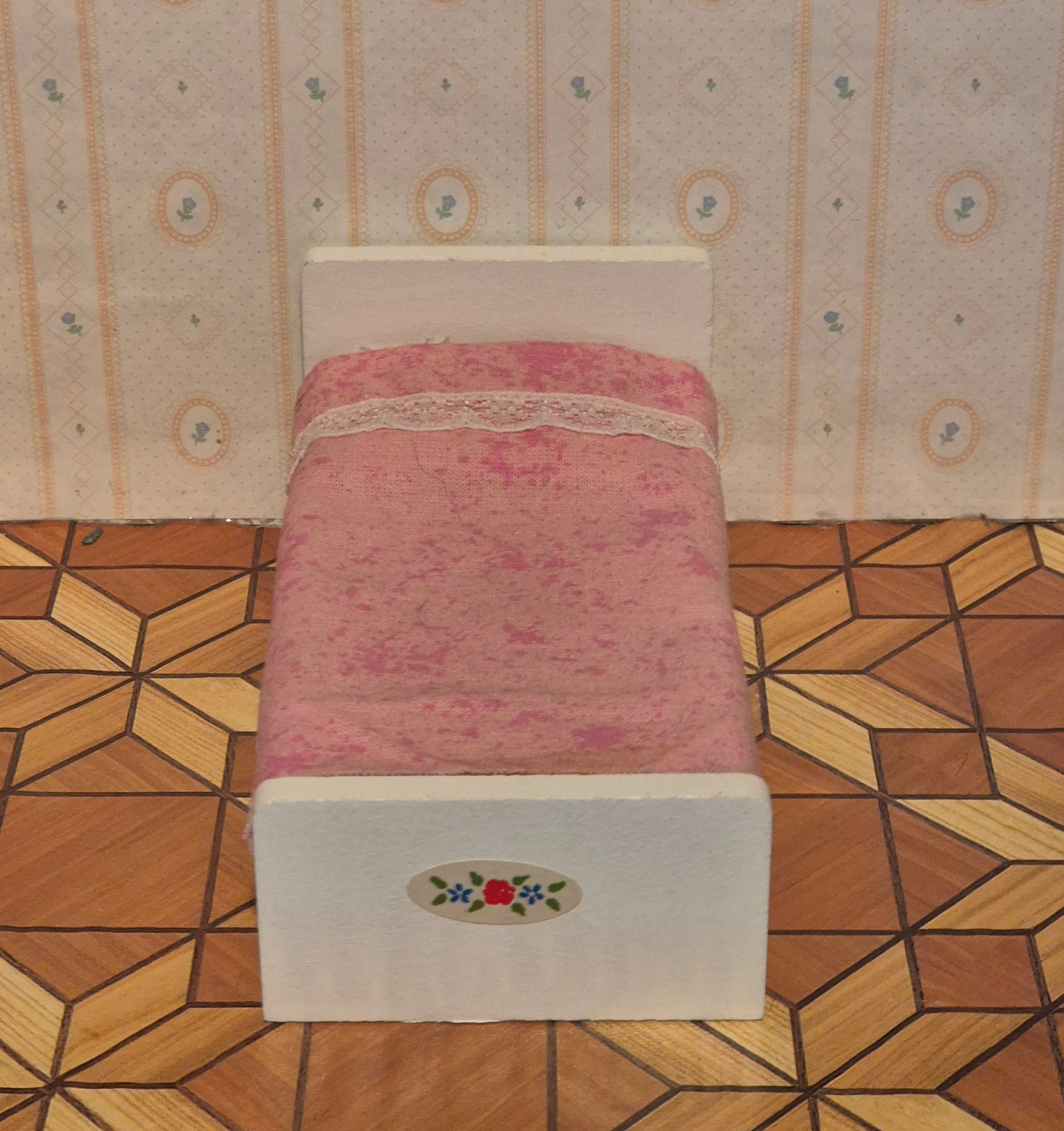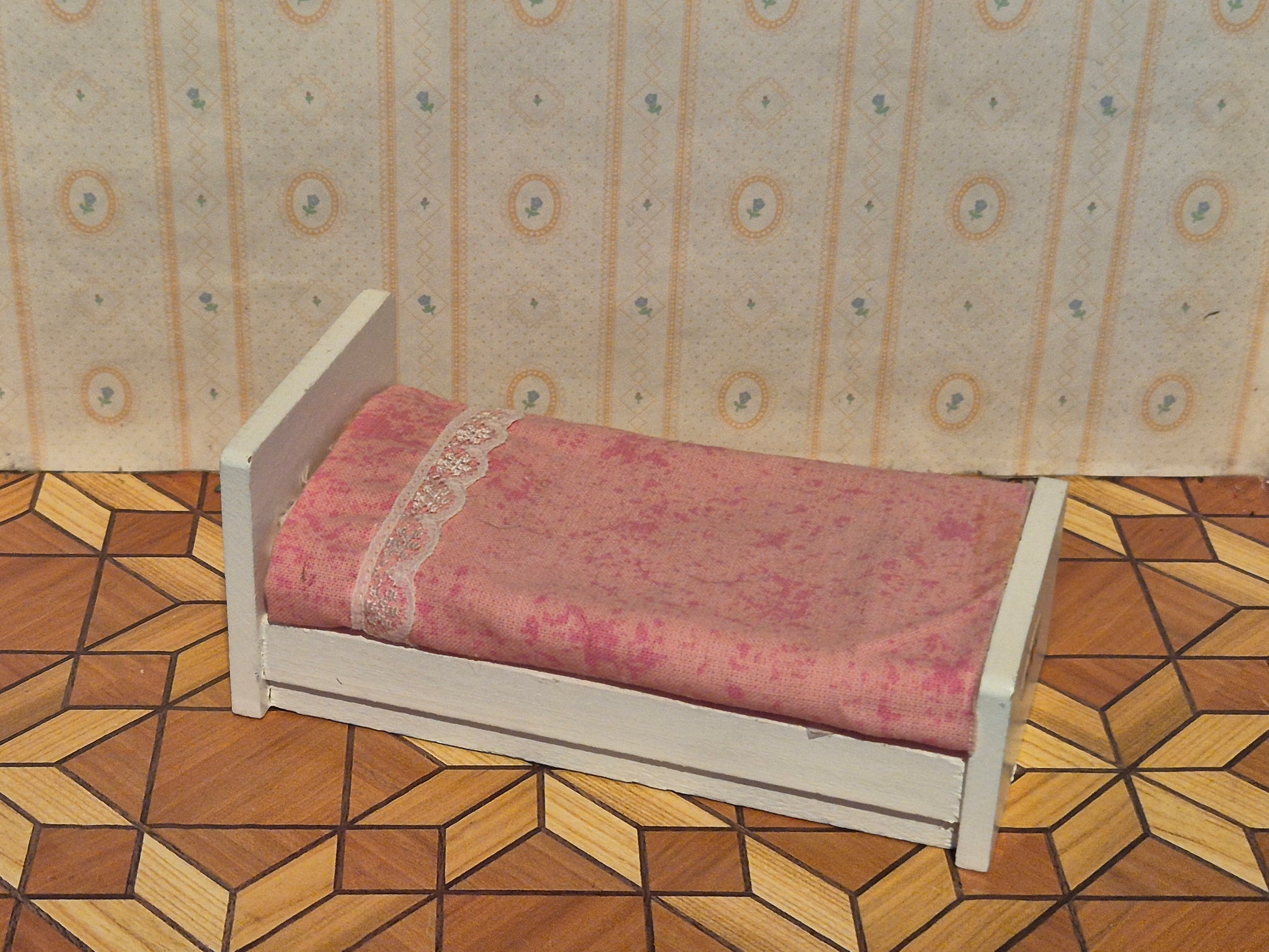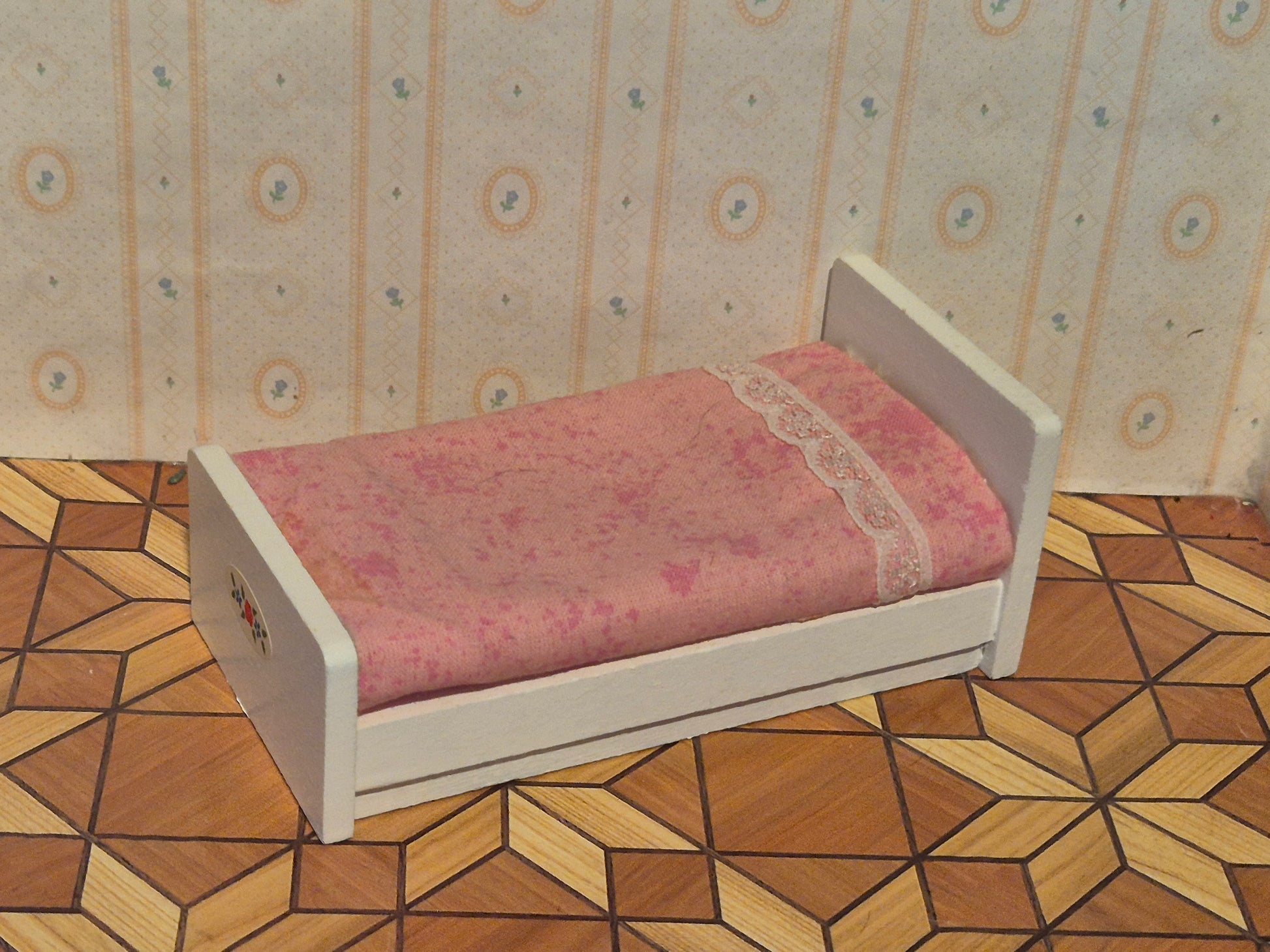 Fin pige seng i hvid træ med lyserødt sengetøj. Rigtig god stand. Sød børneseng til lundby dukkehus børneværelse.
