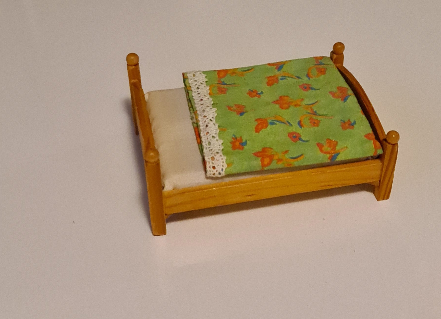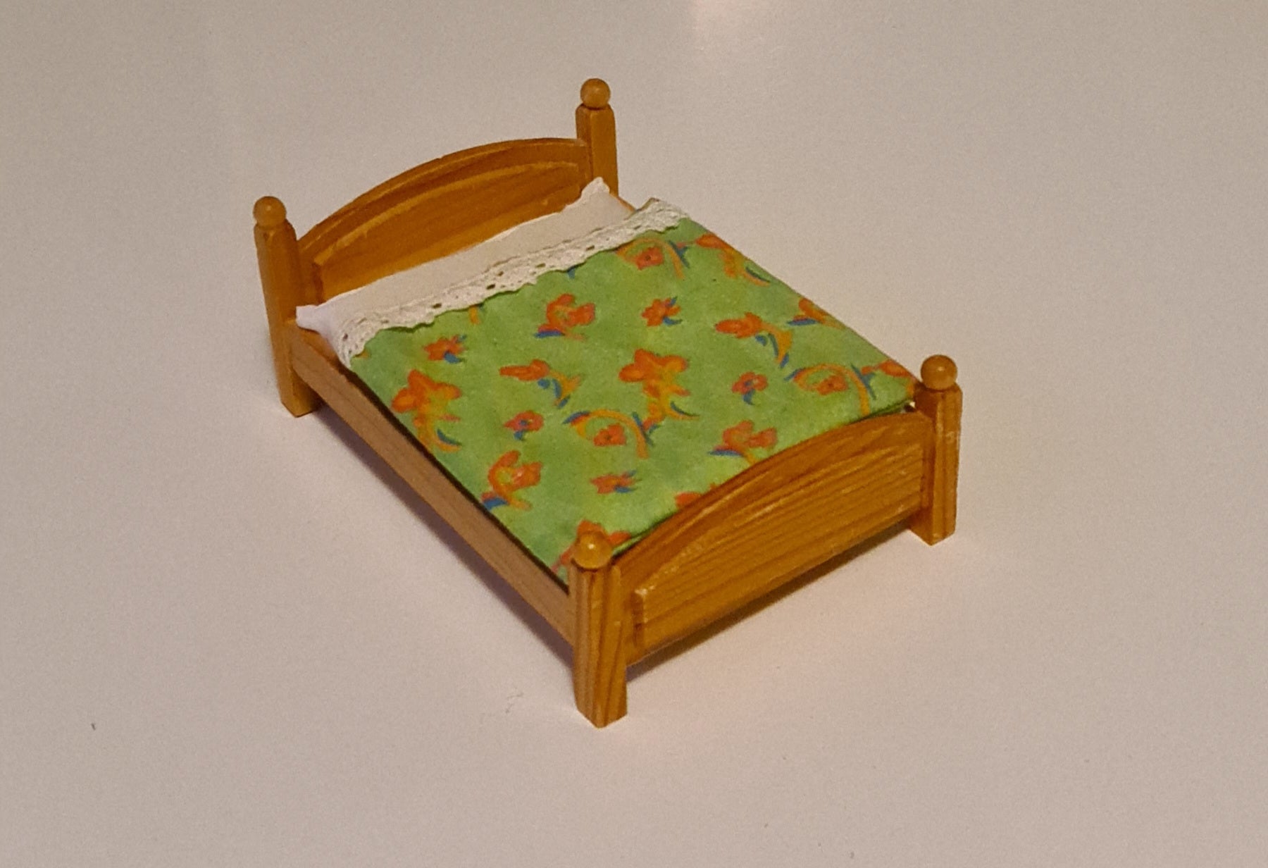 Pæn Lundby seng af træ med grønt sengelinned. Pæn stand