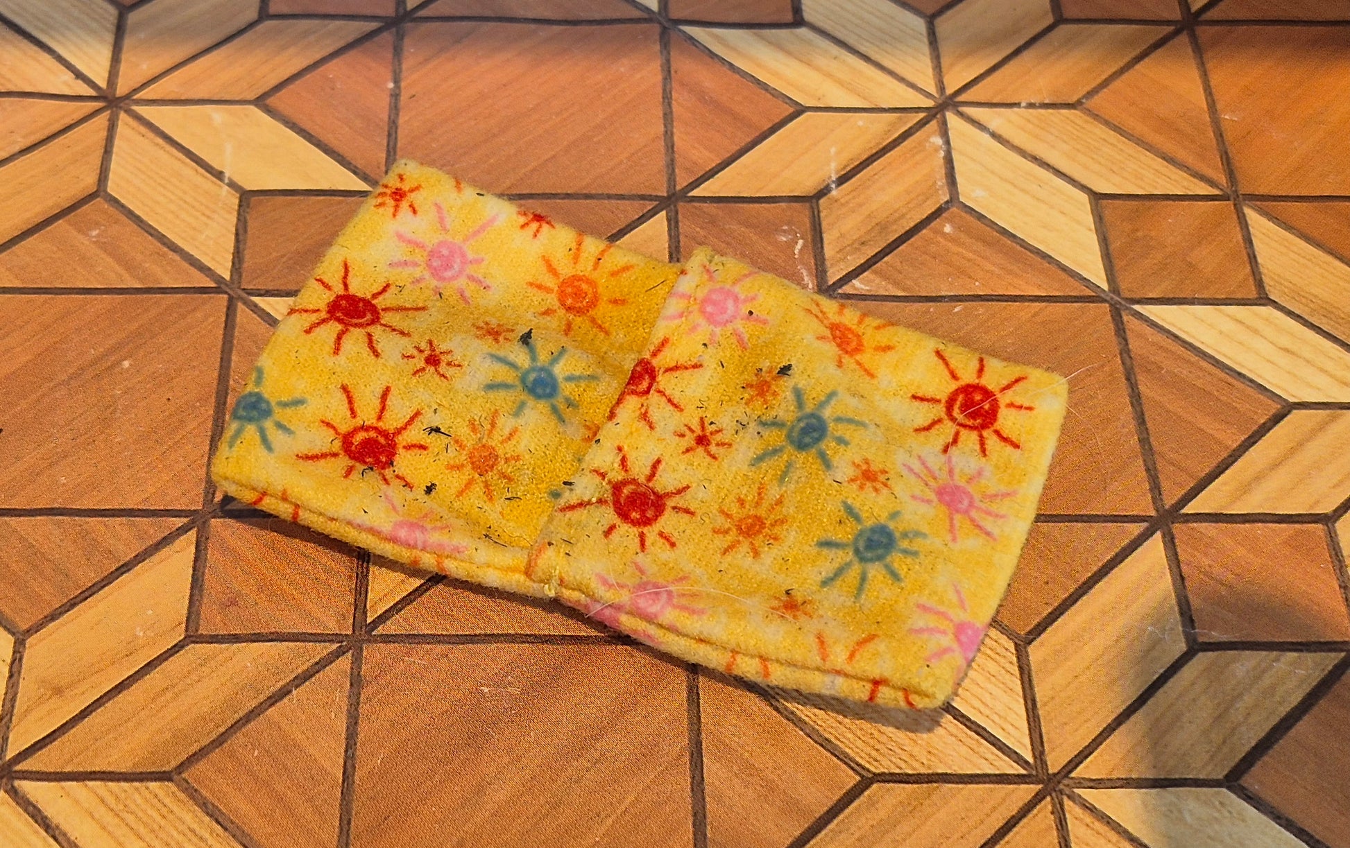 Det er syet af et gult mønstret Lundby tæppe / plaid.