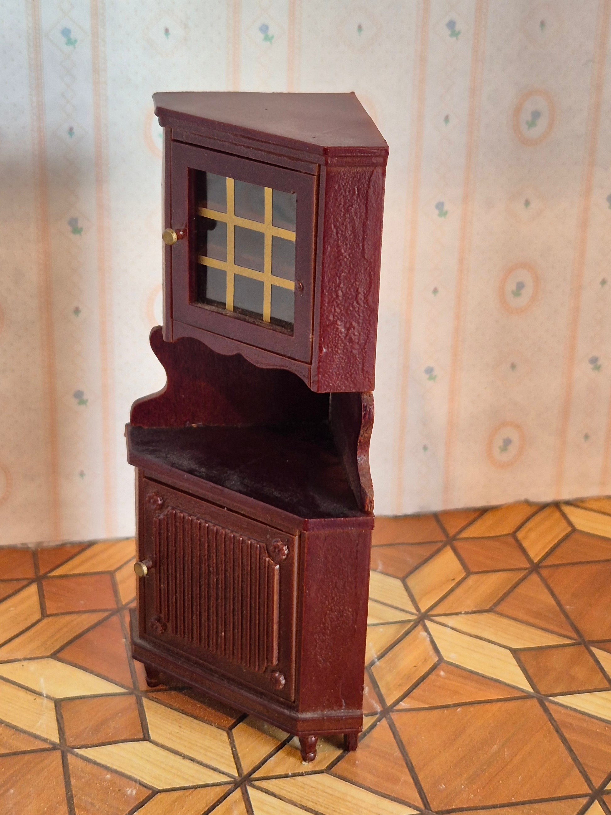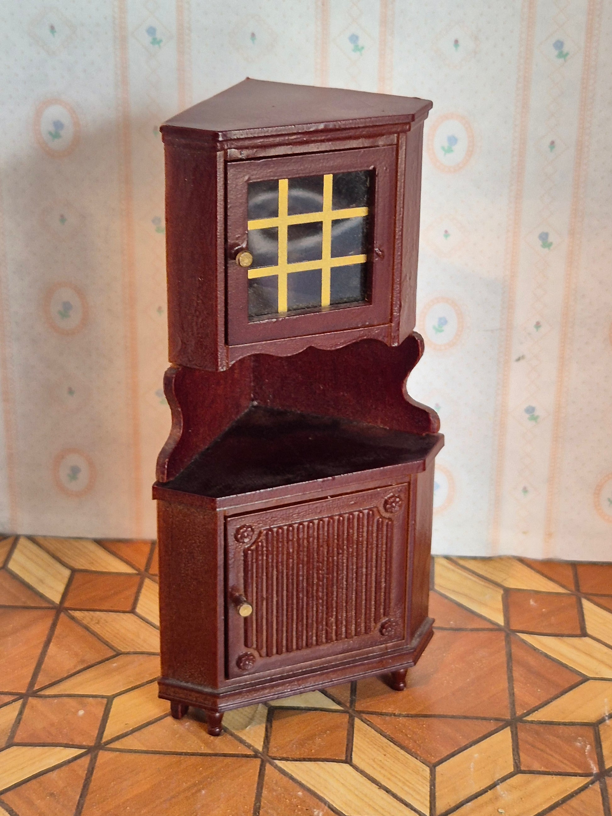 Pænt Lundby hjørneskab i serien Mørk classic der minder meget om Lundby royal dukkehusmøblerne.