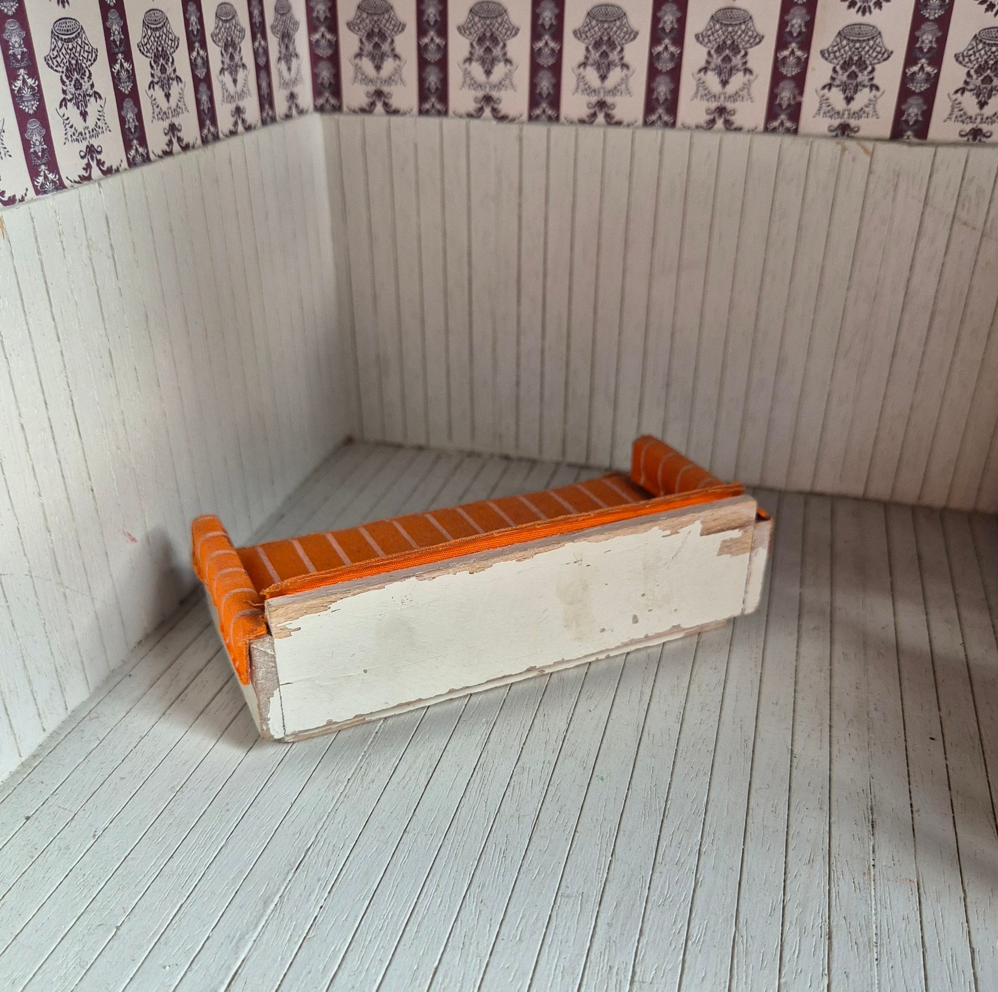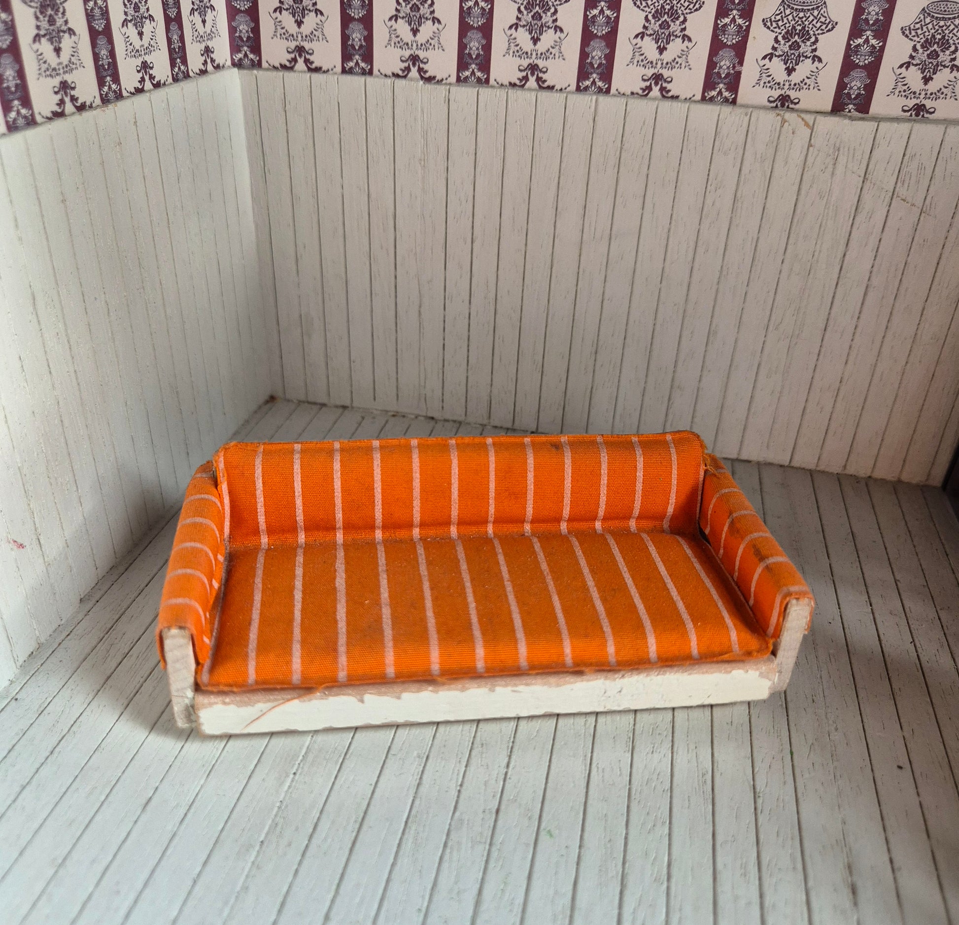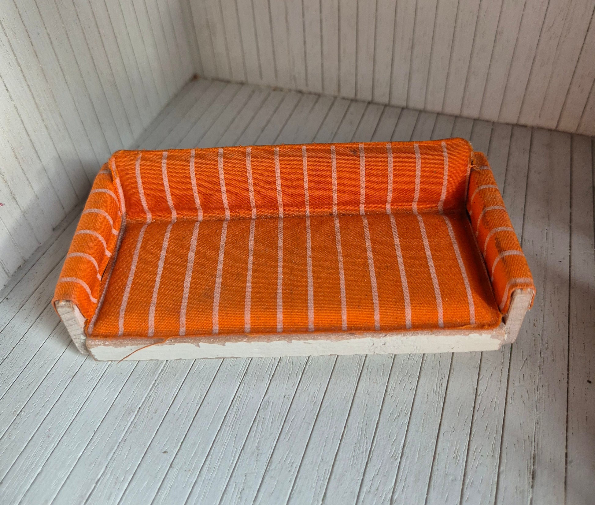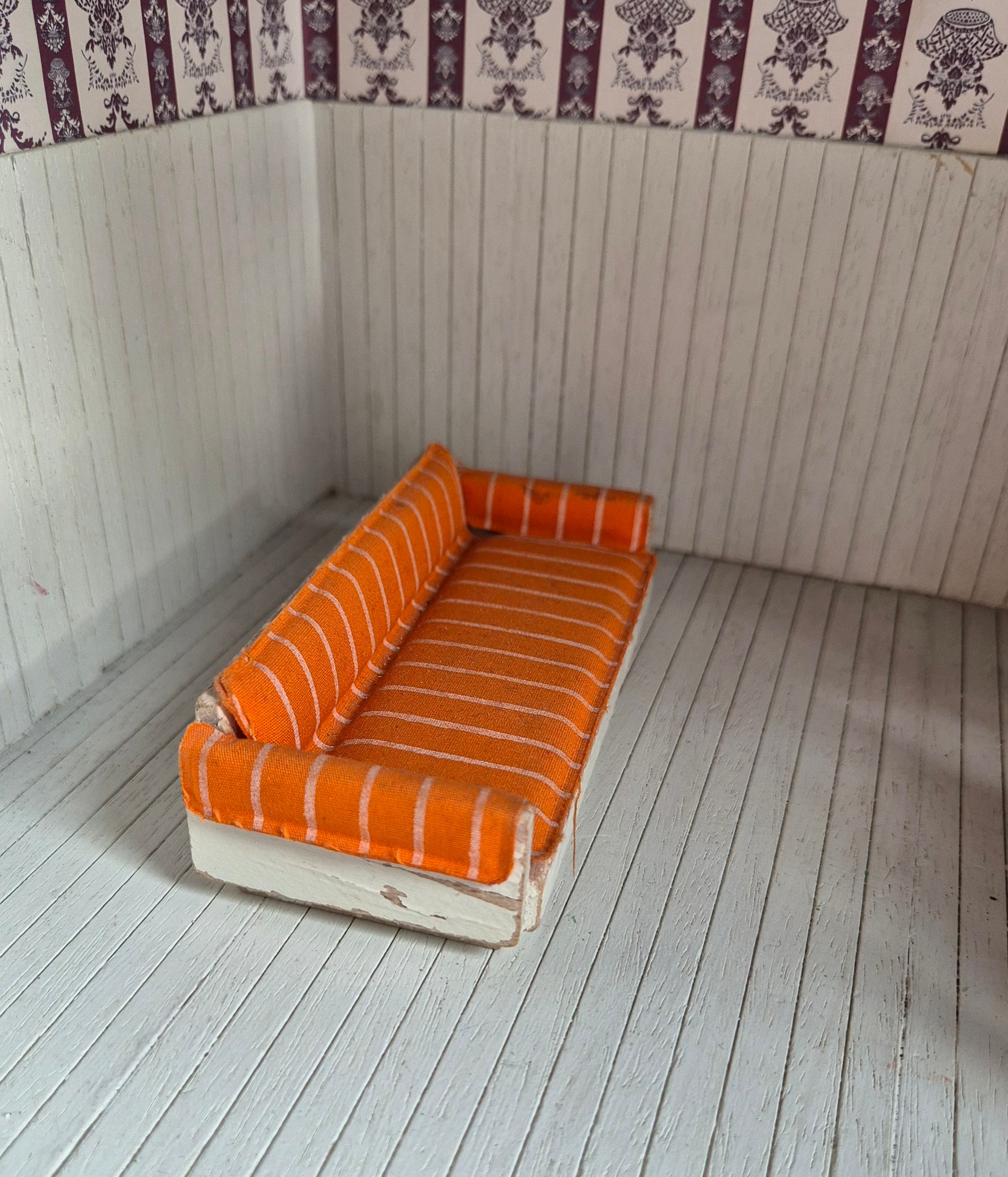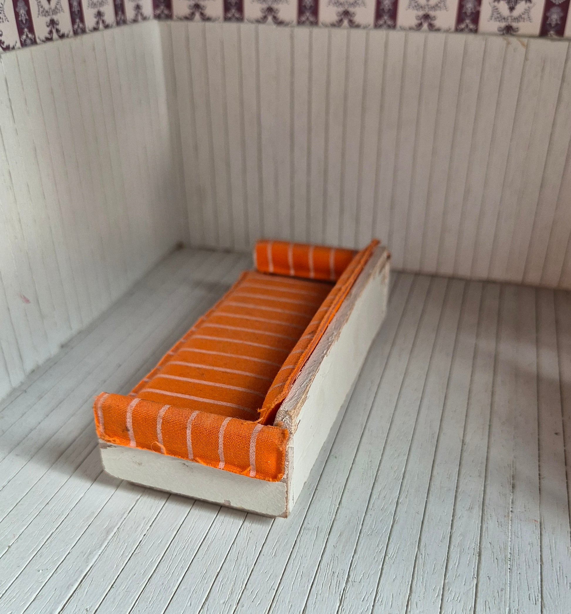 Pæn karakteristisk Lundby sofa til dukkehus stuen. Den har en skarp klar orange farve med hvide striber. Den er lavet af hvidt træ og sædebetræk. Da den er ældre og brugt er der en del patina og brugsspor, men den er stadig ret pæn.