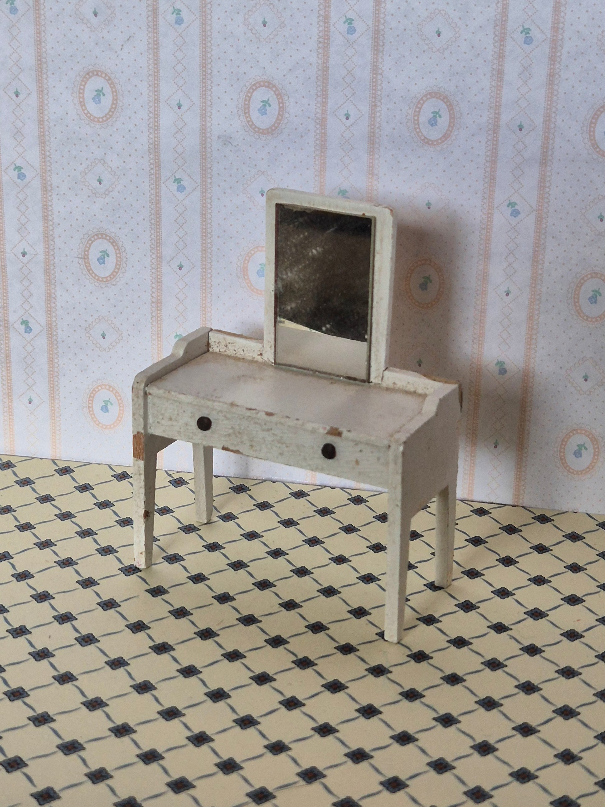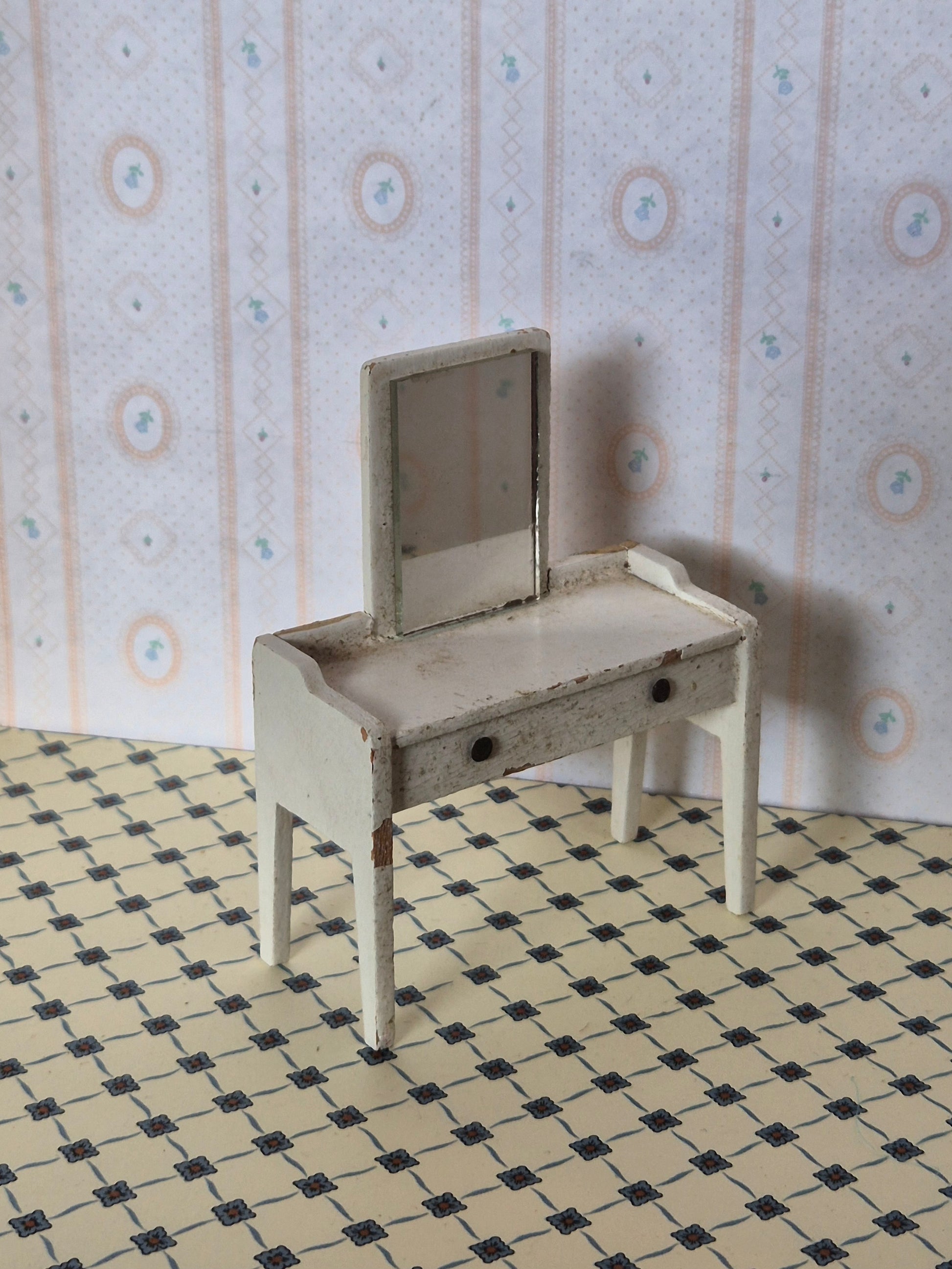 Vintage Lundby sminkebord af hvidt træ. Der er en del patina og brugsspor, pletter.