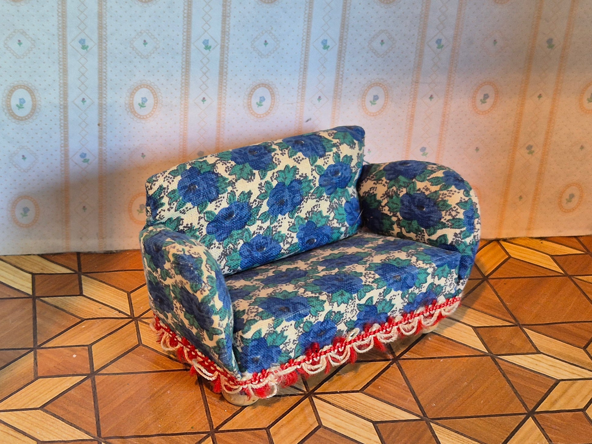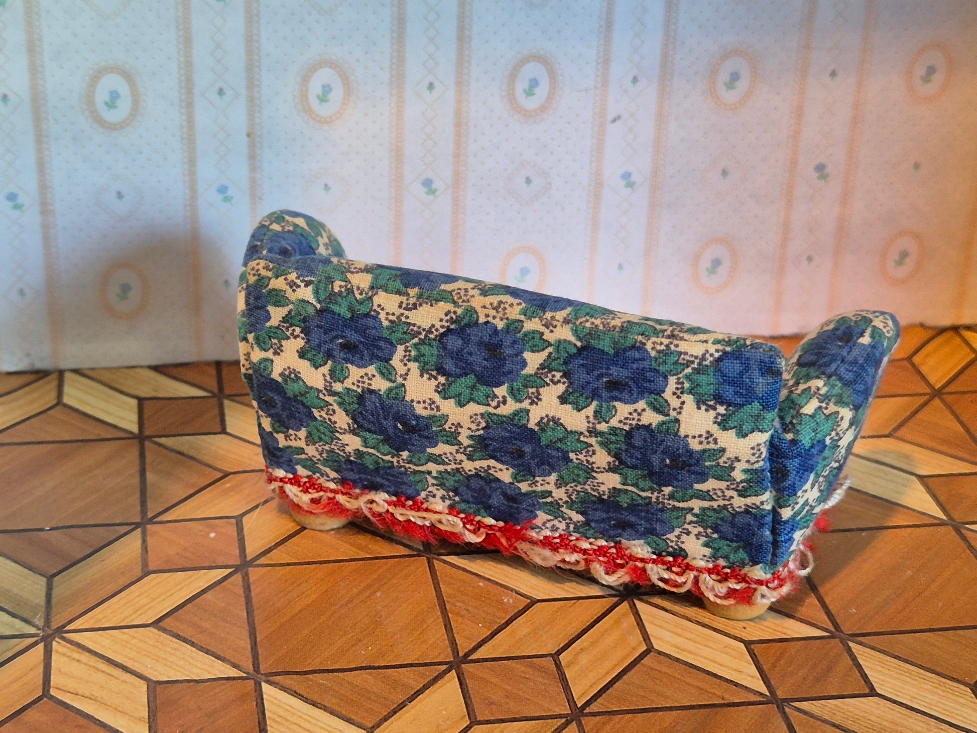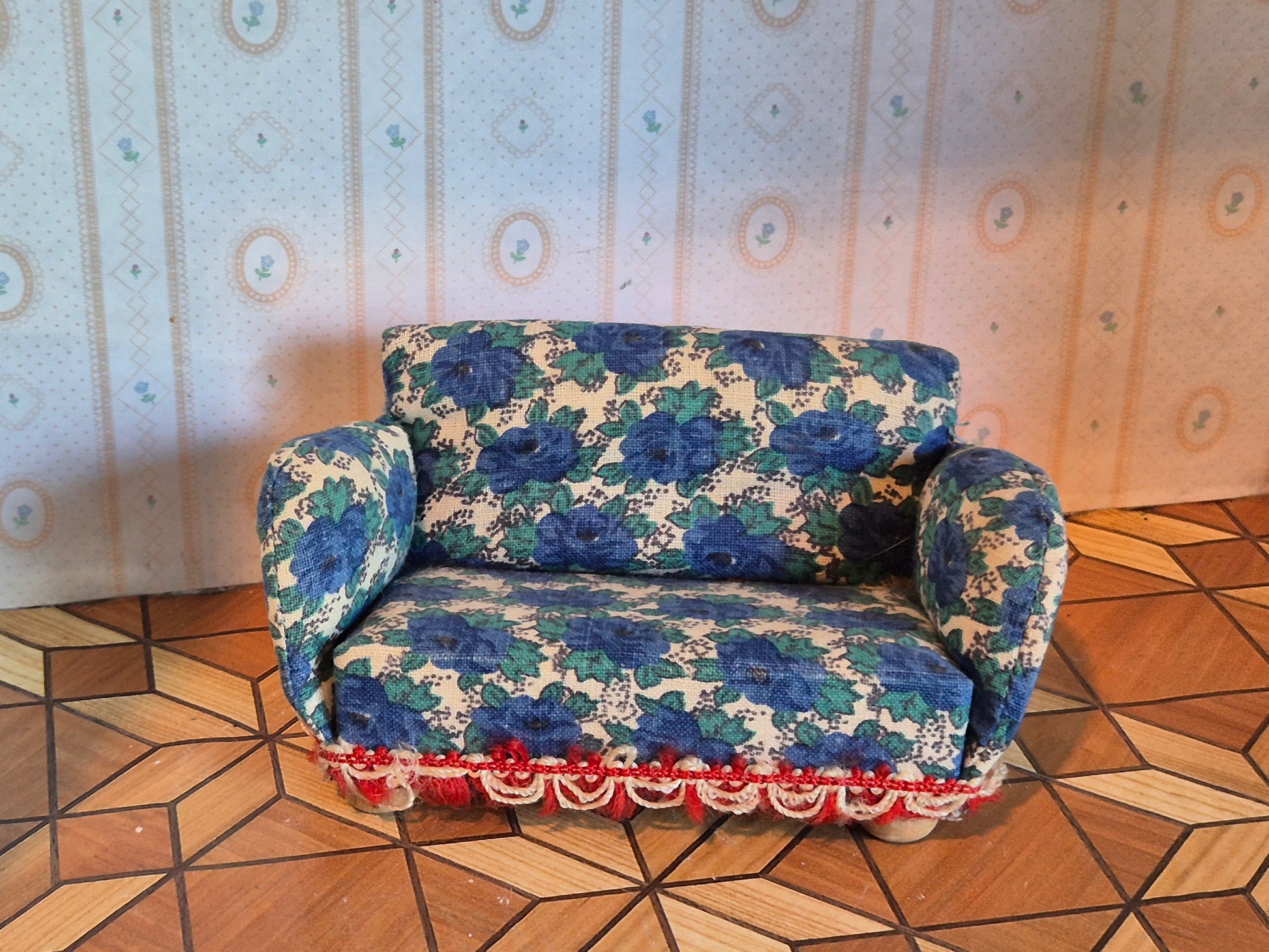 Pæn Lundby vintage sofa med blåt blomstret mønster. Der er patina og brugsspor. Udmærket stand