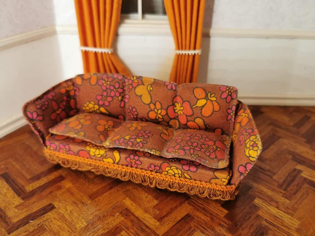 3 pers. sofa i blomstrer rød-brunlige/bordeaux nuancer til dukkehuset.