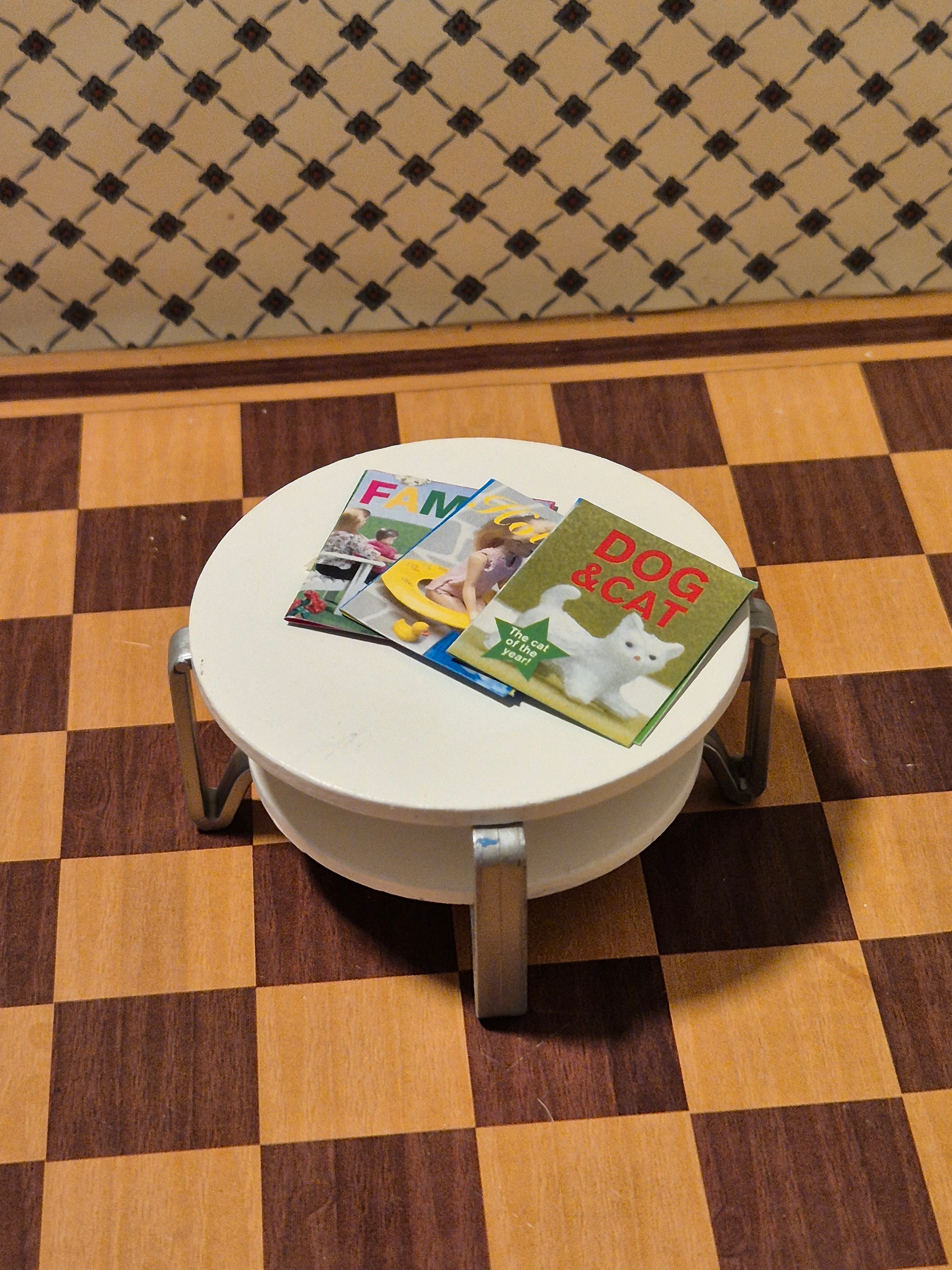 Pænt og fint Lundby sofabord, rundt, med tidsskrifter. Originalt. God stand