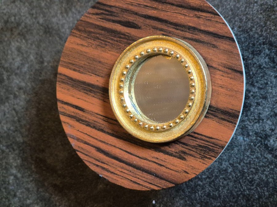 Rundt spejl af Lundby. Det er et gedigent spejl med bred og tung messing ramme.