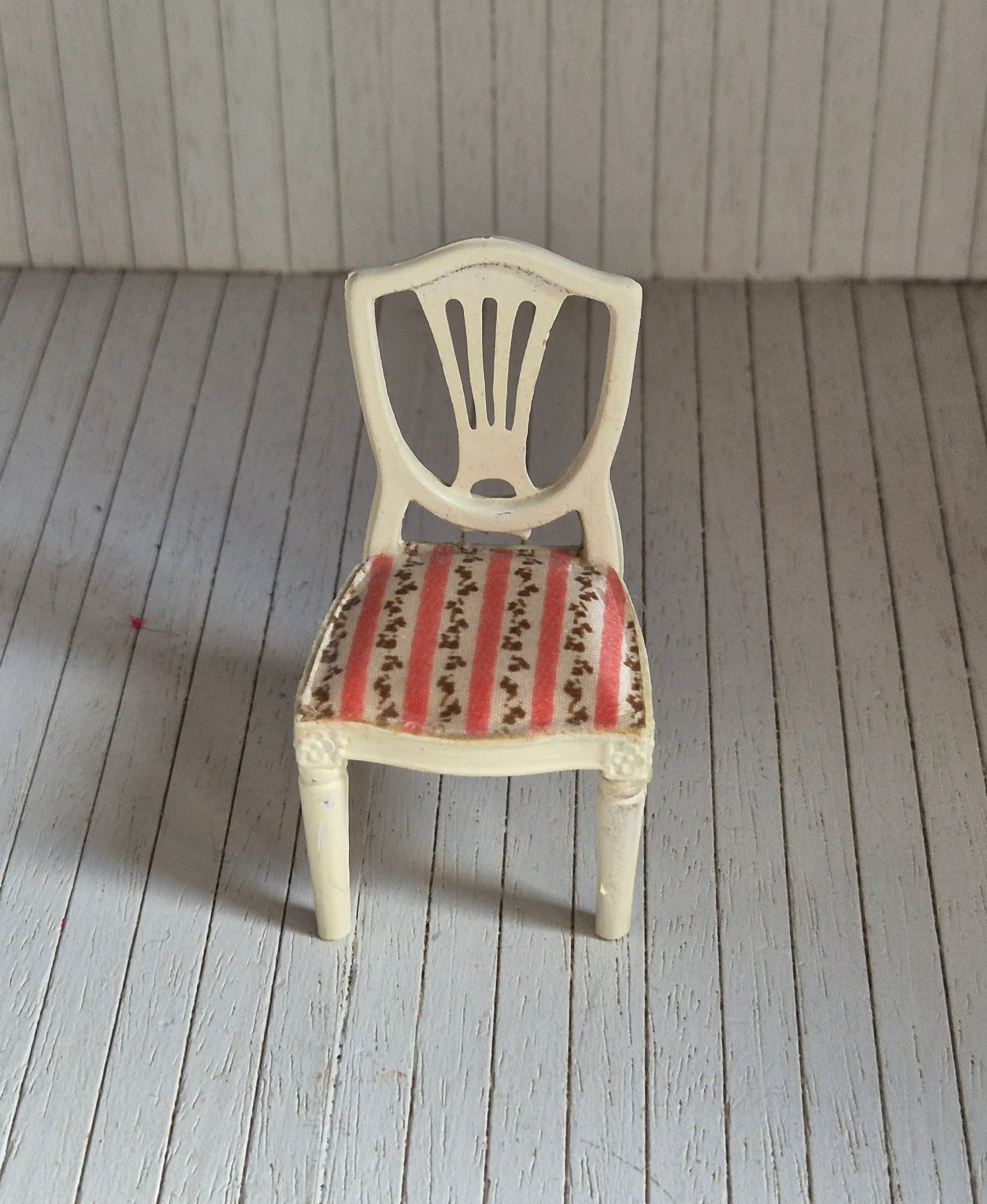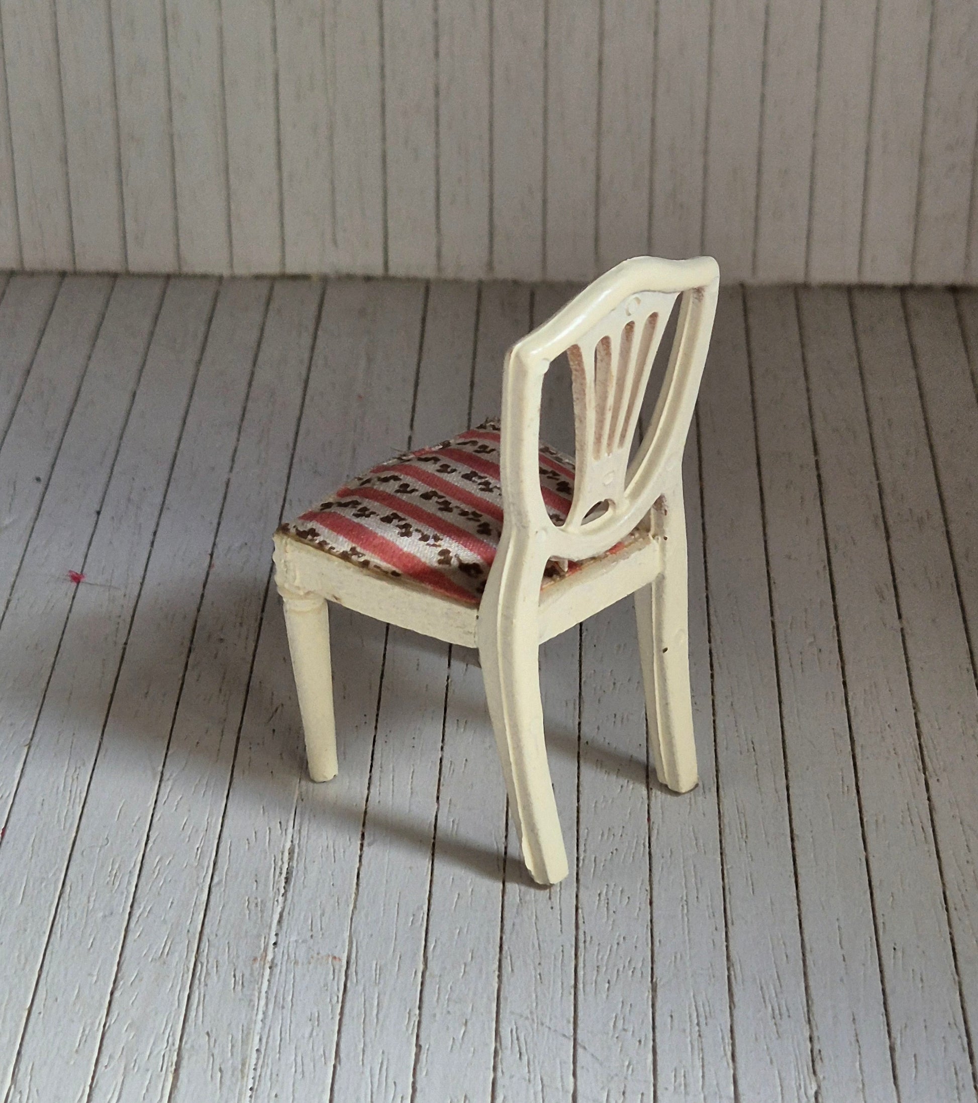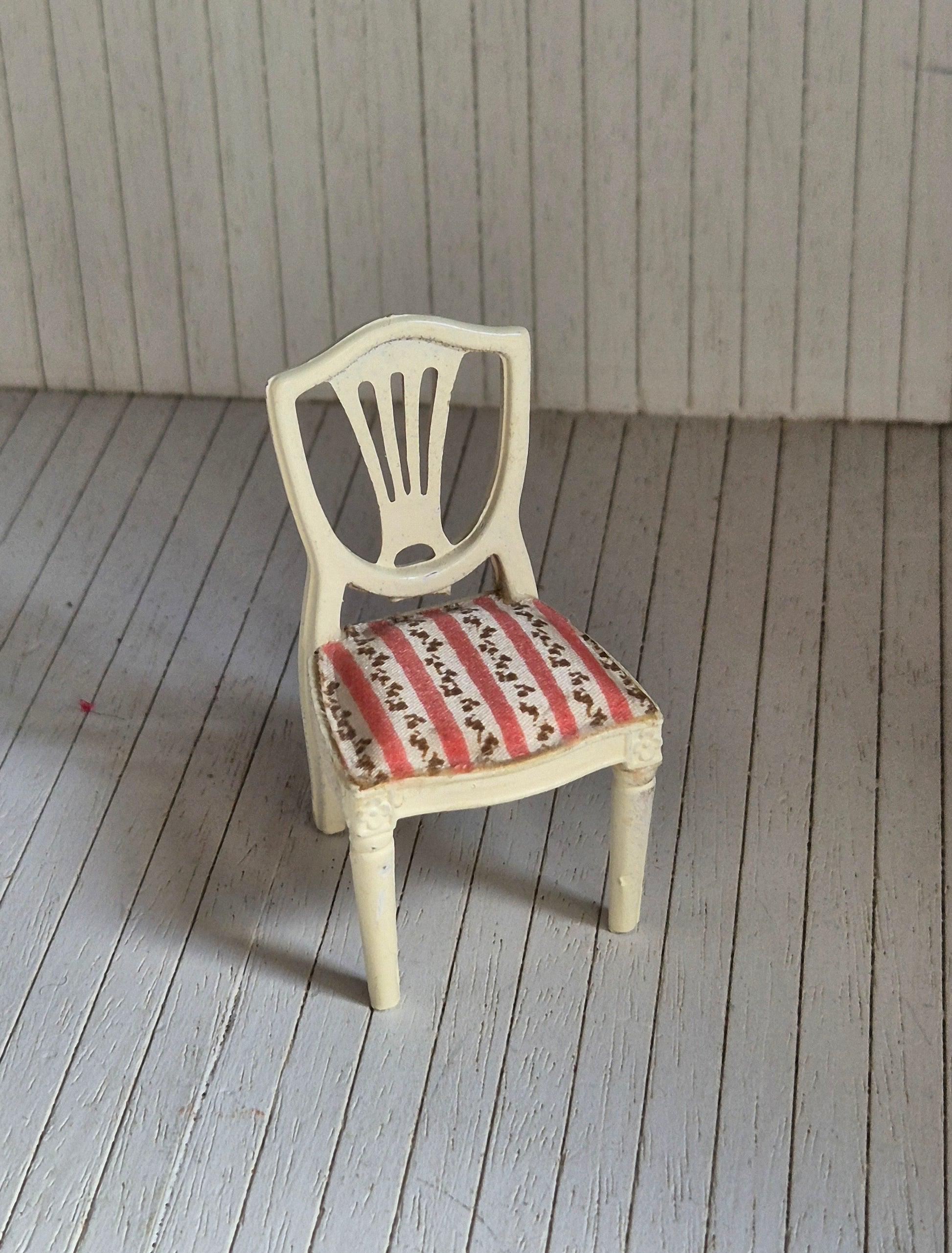 Lundby rokoko stol til spisebordet i hvid med lyserødt stribet betræk. Der er royal stil over den